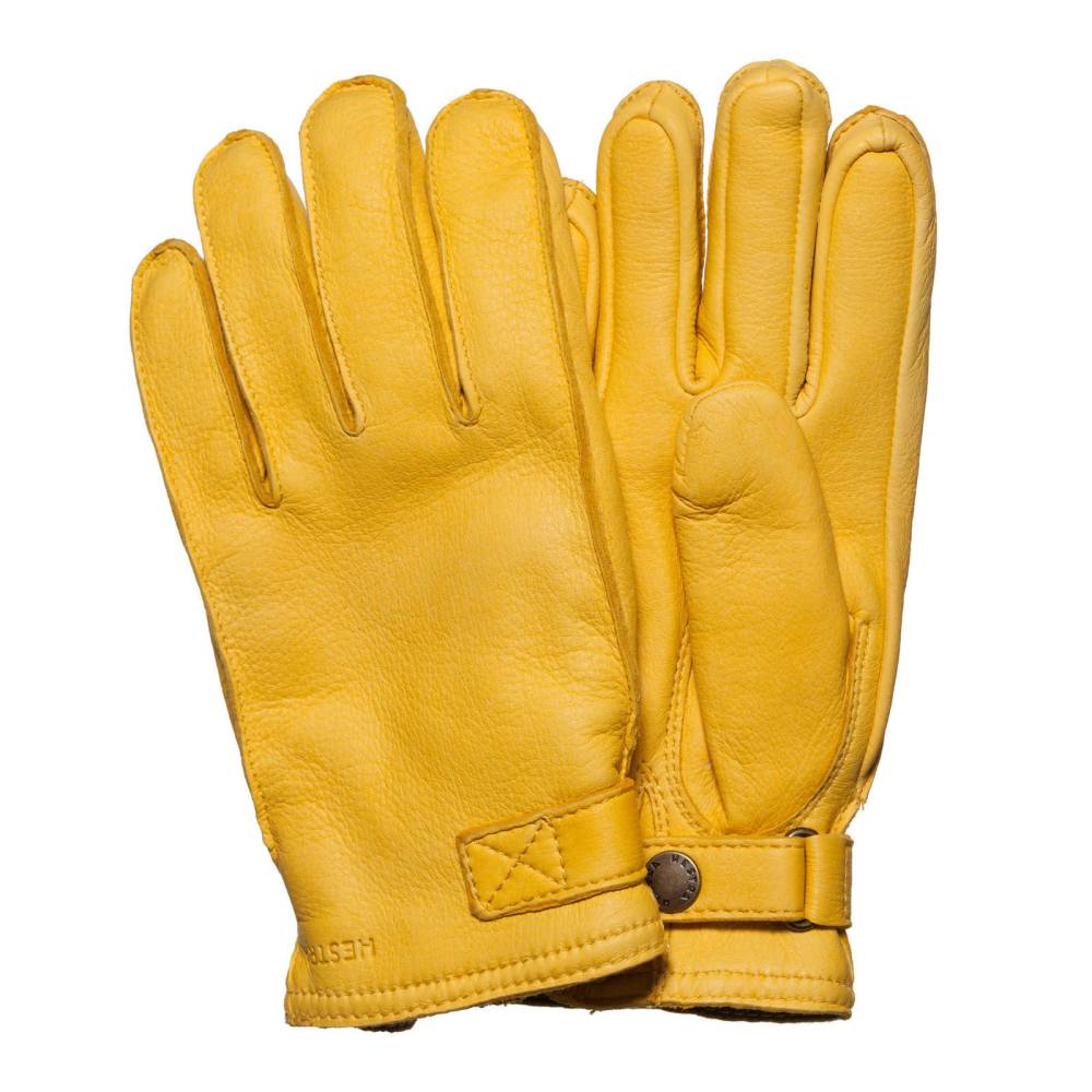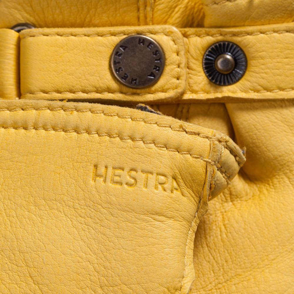 Тёплые перчатки жёлтого цвета из коллекции Sport Classic шведского бренда Hestra. Модель выполнена из кожи североамериканского белохвостого оленя с великолепной зернистой текстурой. Особенностью перчаток является очень тёплая износостойкая шерстяная подкладка Wool Terry, напоминающая махровую ткань. Область запястья регулируется ремешком с металлической кнопкой. Модель подходит для погоды с температурой до -40ºС.