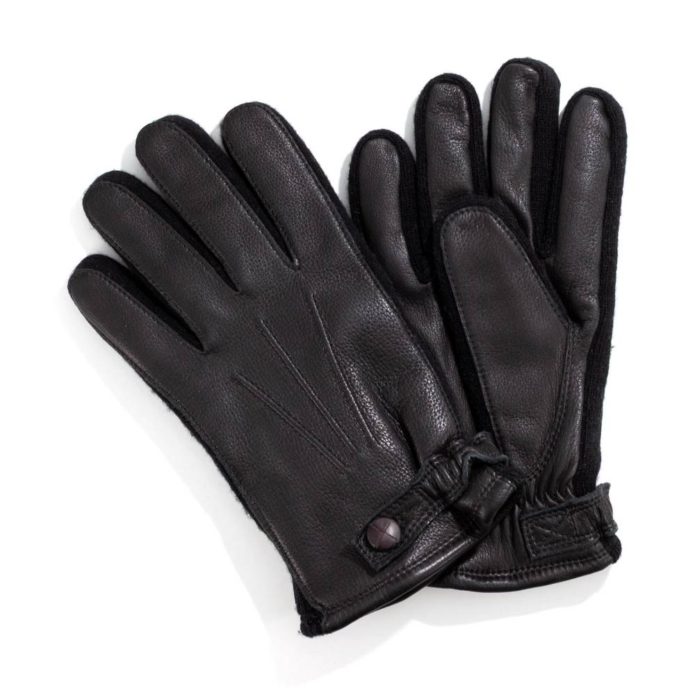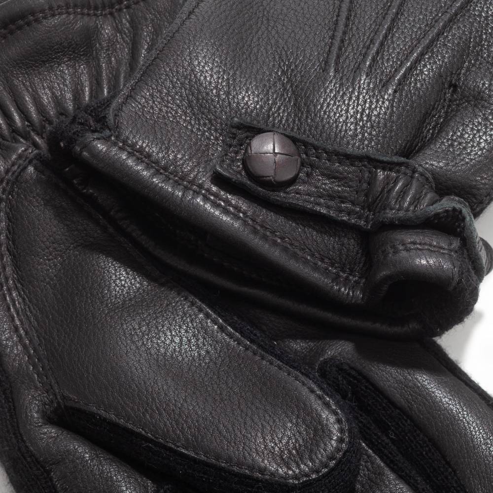 Лаконичные перчатки шведского бренда Hestra чёрного цвета. Модель выполнена из кожи оленя в сочетании с шерстью. Кожа оленя ценится за прекрасные теплоизоляционные свойства, прочность и мягкость. Особенностью модели также является тёплая подкладка из запатентованного ворсистого полиэстера Primaloft®. С внешней стороны проложена тройная декоративная строчка. Область запястья дополнена эластичной сборкой и ремешком на пуговице. Перчатки подойдут для холодной погоды с температурой до – 10 °С.