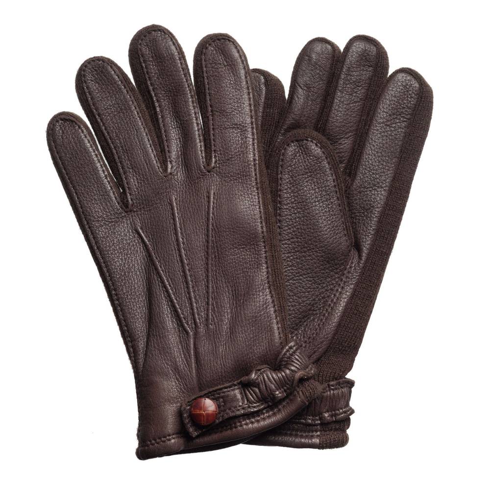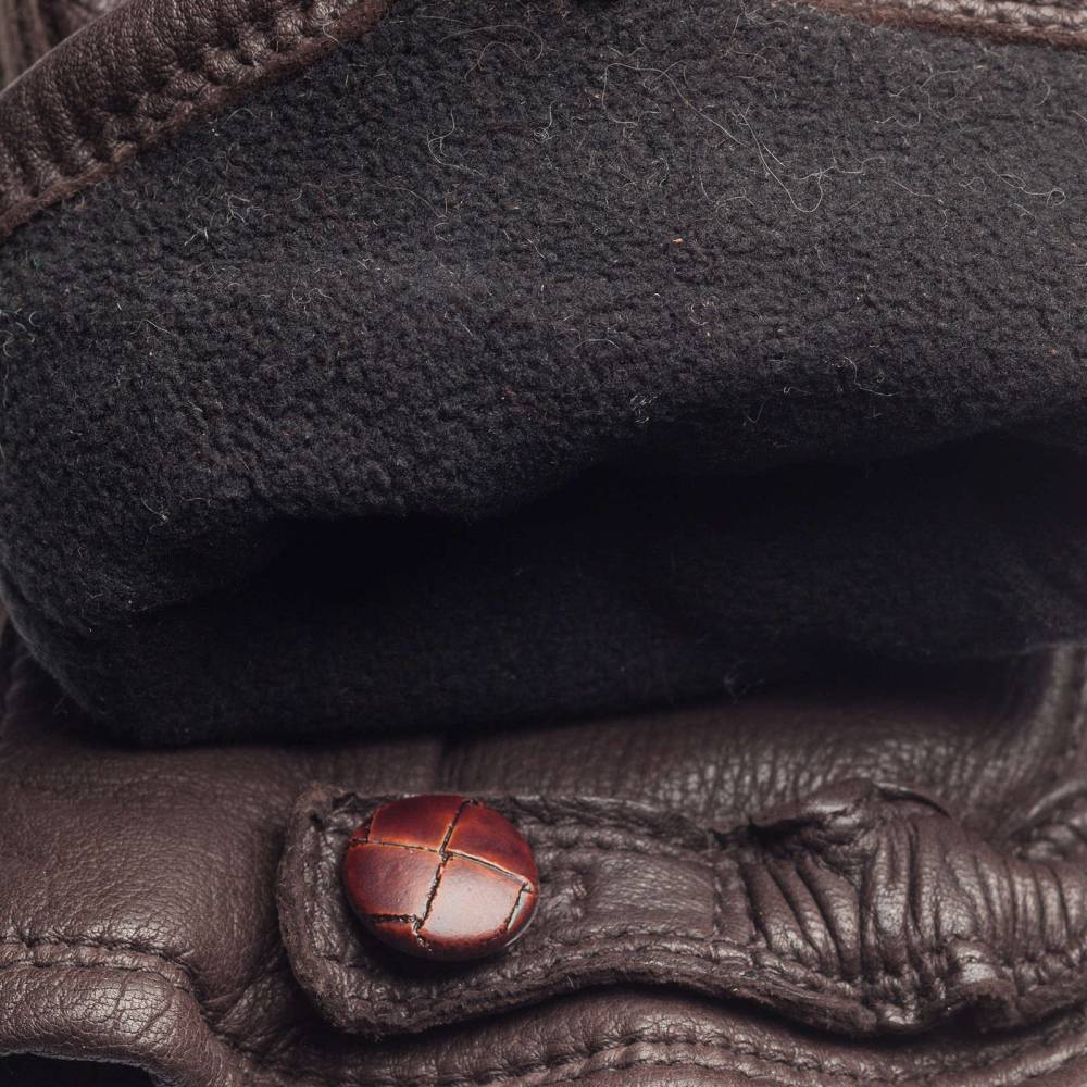 Лаконичные перчатки шведского бренда Hestra тёмно-коричневого цвета. Модель выполнена из кожи оленя в сочетании с шерстью. Кожа оленя ценится за прекрасные теплоизоляционные свойства, прочность и мягкость. Особенностью модели также является тёплая подкладка из запатентованного ворсистого полиэстера Primaloft®. С внешней стороны проложена тройная декоративная строчка. Область запястья дополнена эластичной сборкой и ремешком на пуговице. Перчатки подойдут для холодной погоды с температурой до – 10 °С.