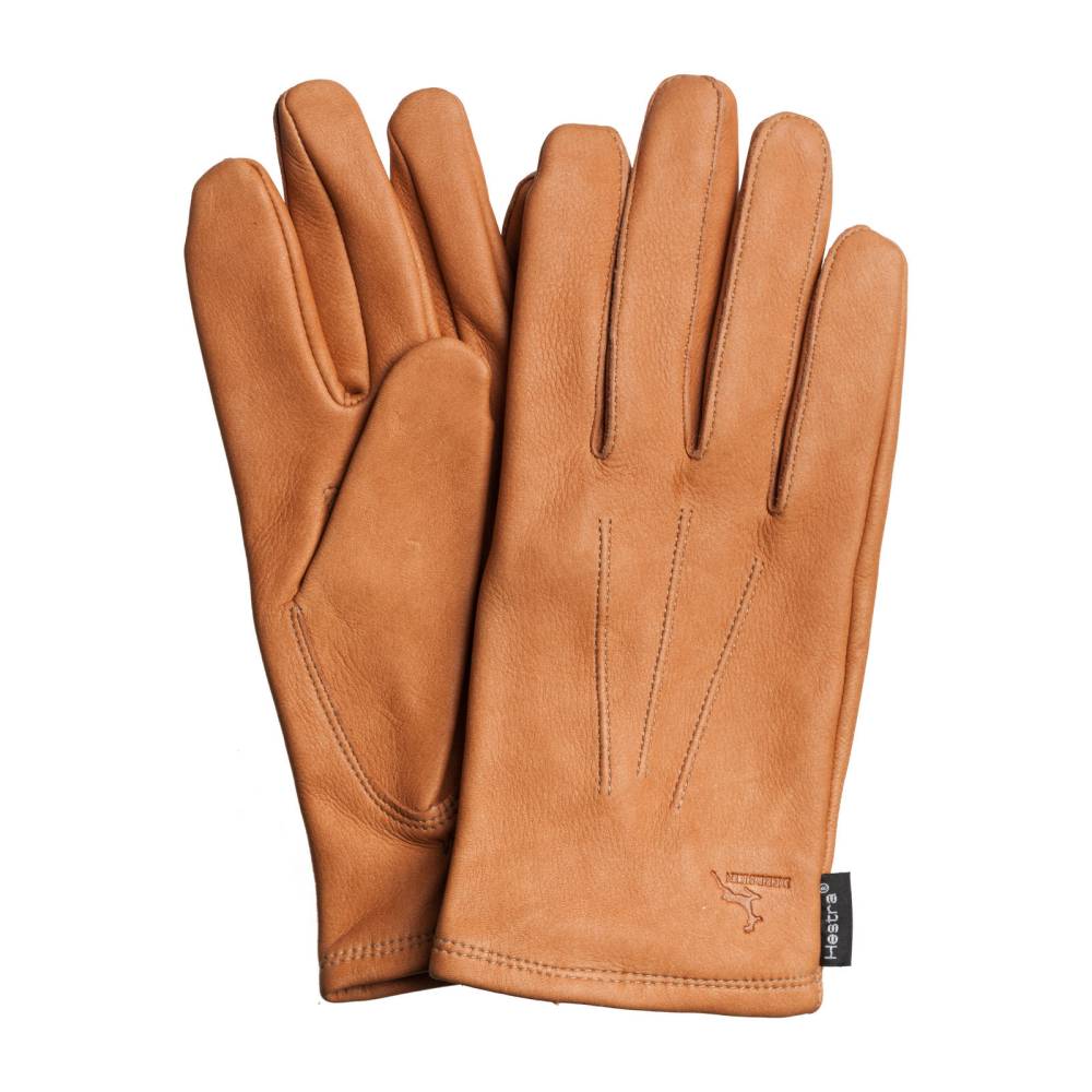Классические мужские перчатки Hestra светло-коричневого цвета. Модель выполнена из мягкой приятной на ощупь оленьей кожи. Область запястья дополнена эластичной сборкой и v-образным вырезом, что позволяет быстро и легко надевать перчатки. Подкладка выполнена из натурального шёлка. С внешней стороны перчатки украшены традиционной тройной строчкой. Подойдут для ранней осени и весны, когда температура воздуха не ниже нуля.