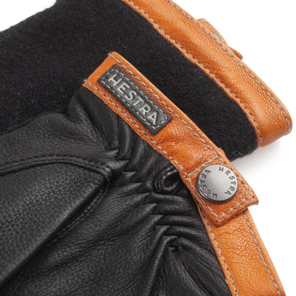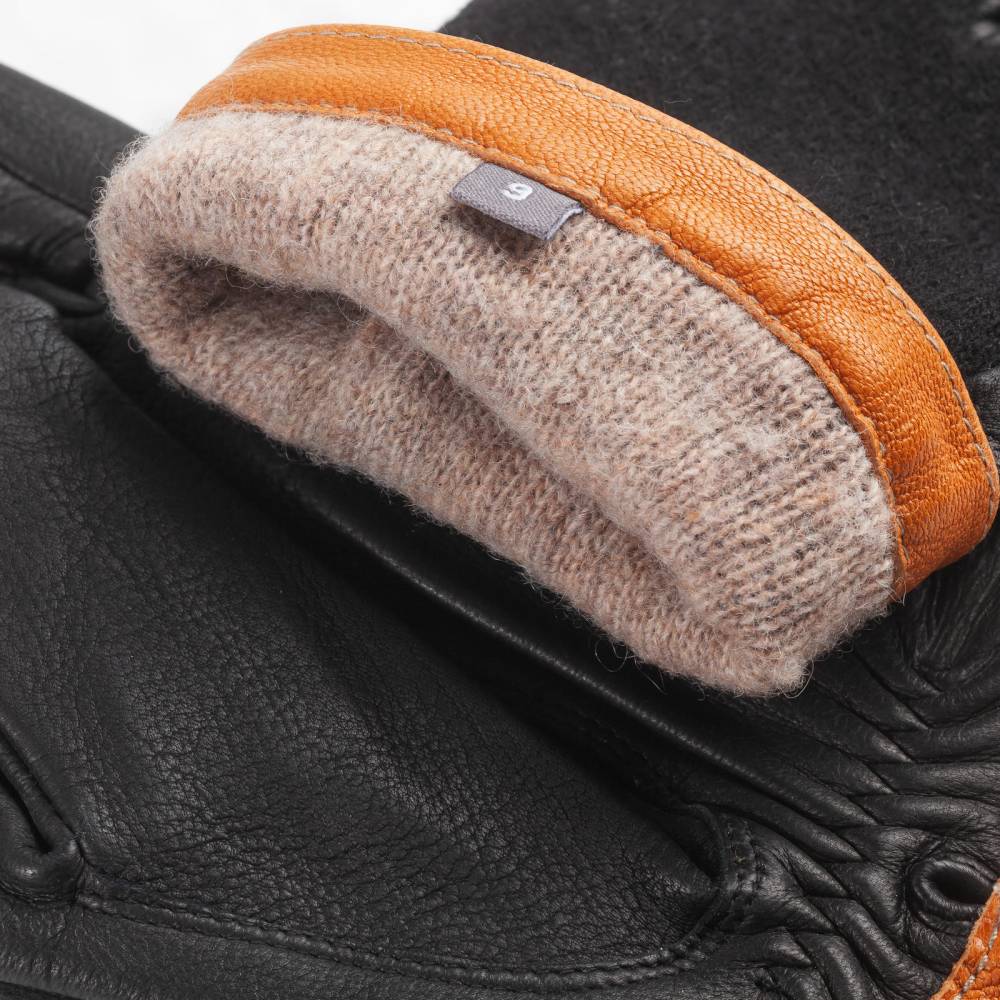 Ладонь выполнена из мягкой, эластичной с зернистой фактурой оленьей кожи. Тыльная сторона ладони выполнена из плотной шерсти, что создает стильный визуальный контраст с кожей и обеспечивает свободу движений. Внутренний слой из тонкого трикотажа (смесь мериносовой шерсти и полиамида) гарантирует мягкость и терморегуляцию. Манжеты декорированы окантовкой из козьей кожи растительного дубления. Эластичный шов и надежная кнопка на запястье обеспечивают плотное прилегание и защиту от ветра.