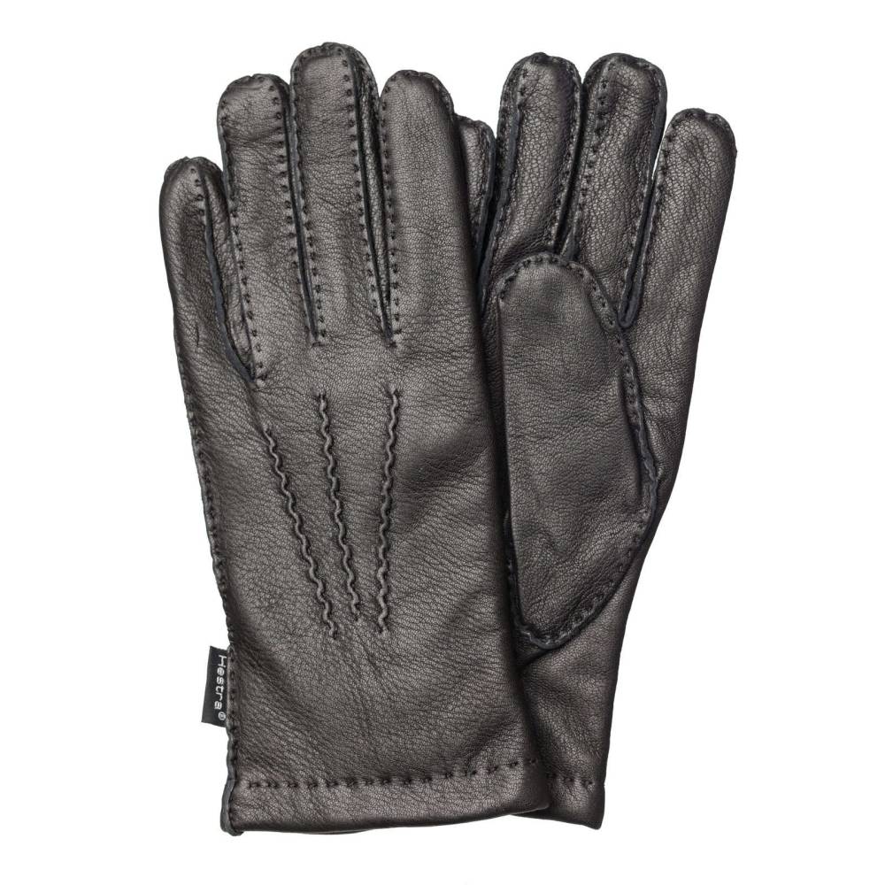 Лаконичные мужские перчатки Hestra из кожи скандинавского лося с зернистой структурой чёрного цвета и подкладкой из шерсти. Плотная и эластичная кожа обеспечивает комфортную посадку по форме руки, а мягкая подкладка защищает от проникновения холодного воздуха и сохраняет тепло. Модель дополнена тройной декоративной строчкой на внешней стороне и эластичной сборкой в области запястья. Перчатки подойдут для осенней и зимней погоды с температурой до – 15 °С.
