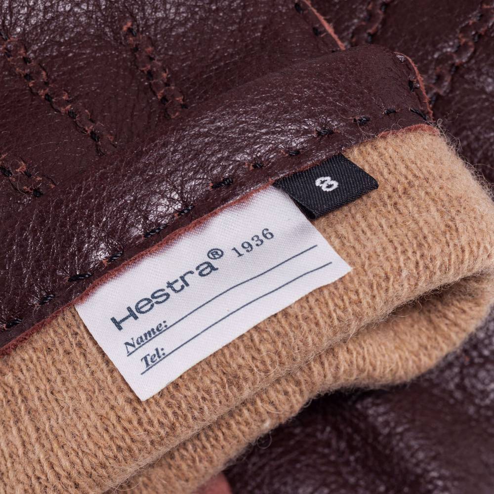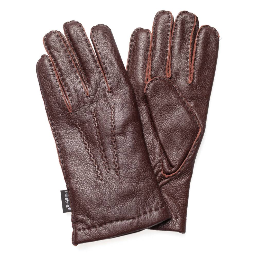 Лаконичные мужские перчатки Hestra из кожи скандинавского лося с зернистой структурой тёмно-коричневого цвета и подкладкой из шерсти. Плотная и эластичная кожа обеспечивает комфортную посадку по форме руки, а мягкая подкладка защищает от проникновения холодного воздуха и сохраняет тепло. Модель дополнена тройной декоративной строчкой на внешней стороне и эластичной сборкой в области запястья. Перчатки подойдут для осенней и зимней погоды с температурой до – 15 °С.