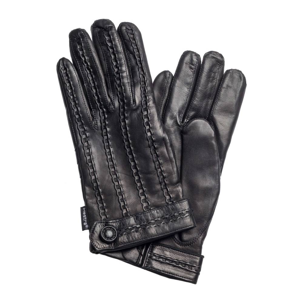 Оригинальные перчатки Hestra из высококачественный кожи ягнёнка чёрного цвета на шерстяной подкладке. Кожа отличается эластичностью, гладкой и ровной текстурой. С внешней стороны модель декорирована плетением в виде цепи. В области запястья перчатки застёгиваются на кнопку. Модель прекрасно подходит для поздней осени и мягкой зимней погоды.
