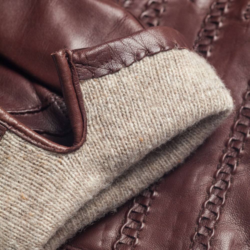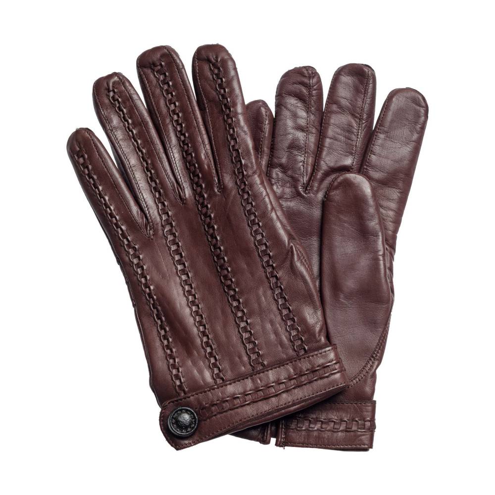 Оригинальные перчатки Hestra из высококачественный кожи ягнёнка коричневого цвета на шерстяной подкладке. Кожа отличается эластичностью, гладкой и ровной текстурой. С внешней стороны модель декорирована плетением в виде цепи. В области запястья перчатки застёгиваются на кнопку. Модель прекрасно подходит для поздней осени и мягкой зимней погоды.