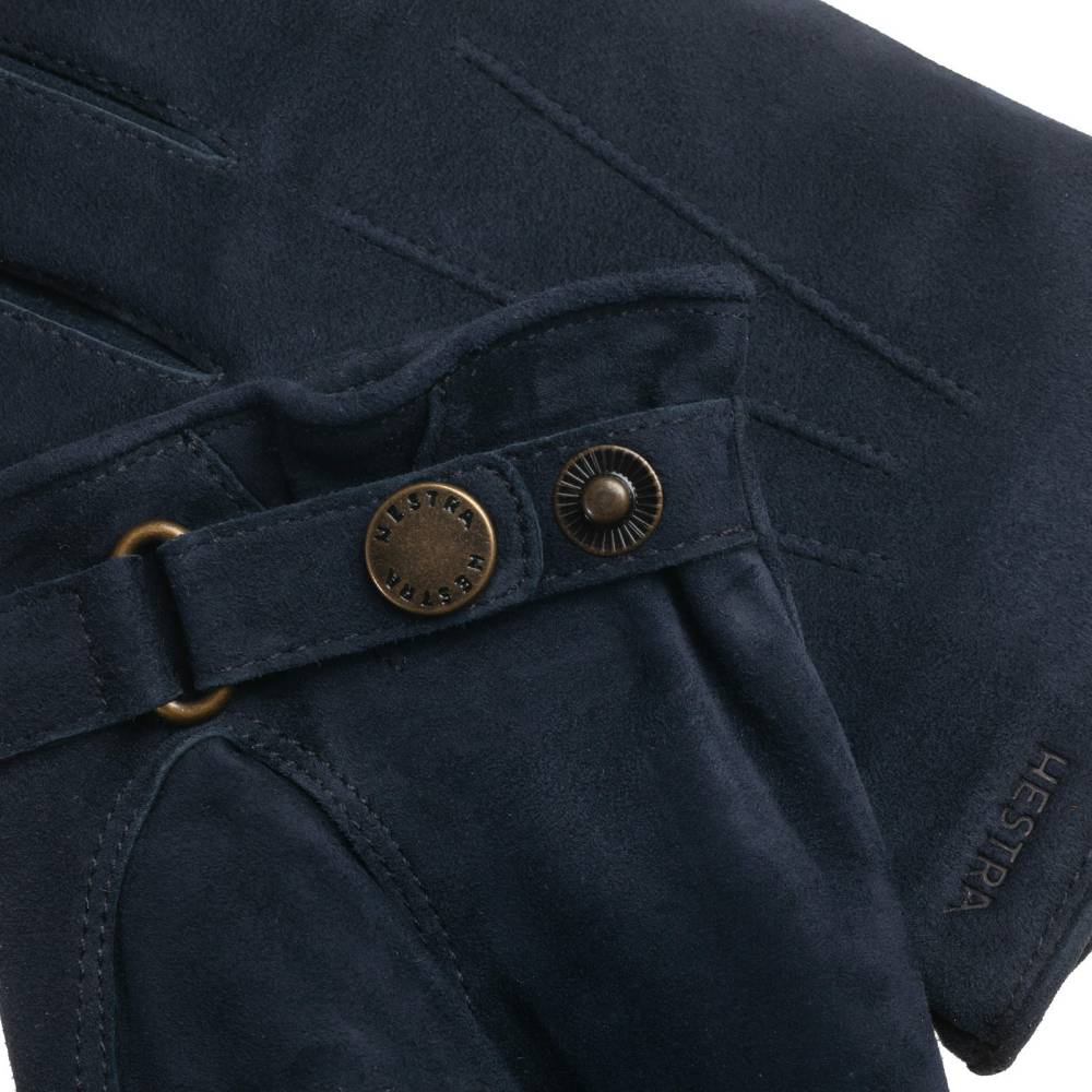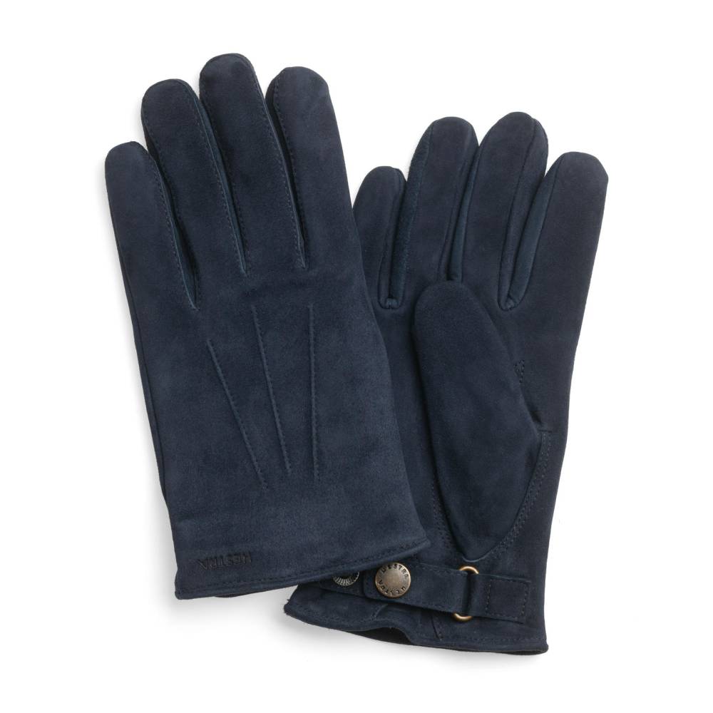 Элегантные мужские перчатки шведской марки Hestra из мягкой, приятной на ощупь замши (кожа ягнёнка) насыщенного тёмно-синего цвета. Тёплая подкладка выполнена из натуральной шерсти. Перчатки прекрасно подойдут для умеренно строгого классического гардероба в холодное время года: они хорошо сочетаются с одеждой серых, коричневых и зелёных цветов. В области запястья посадка регулируется специальным ремешком с застёжкой на кнопку.