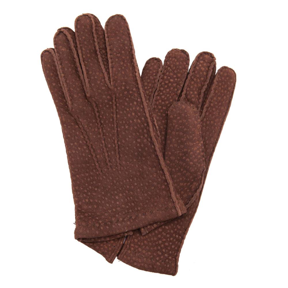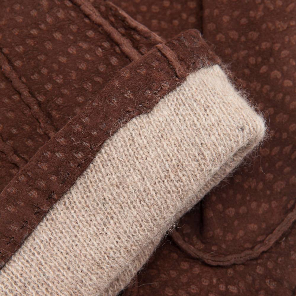 Тёплые мужские классические перчатки из кожи капибары тёмно-коричневого цвета c подкладкой их 100% кашемира. Бархатистая текстура и пятнистый окрас этого материла особенно ценится среди поклонников перчаток по всему миру! Кожа этого животного очень прочная и износоустойчивая, но одновременно мягкая и приятная на ощупь. Перчатки сделаны в Италии по специальному заказу для испанского бренда La Portegna.