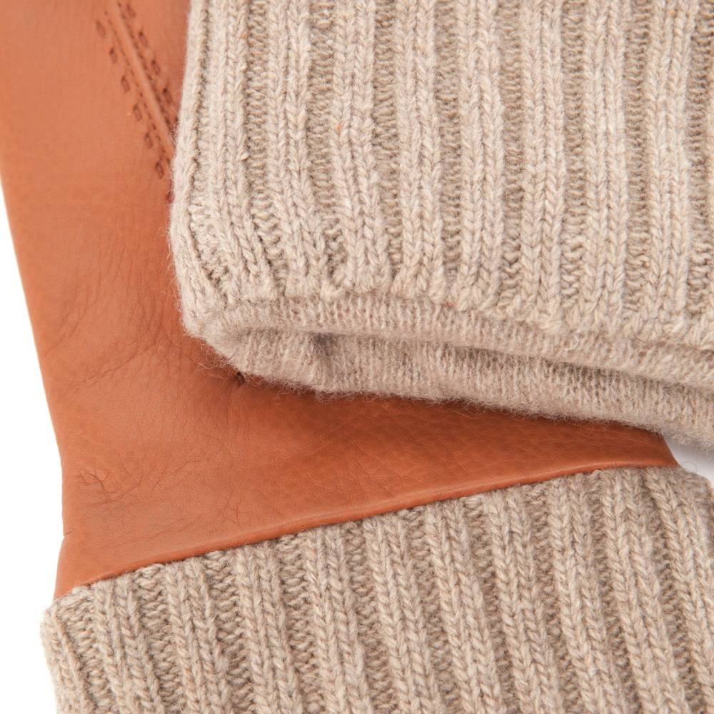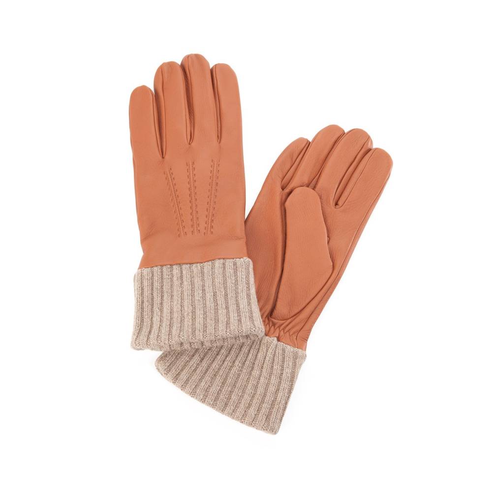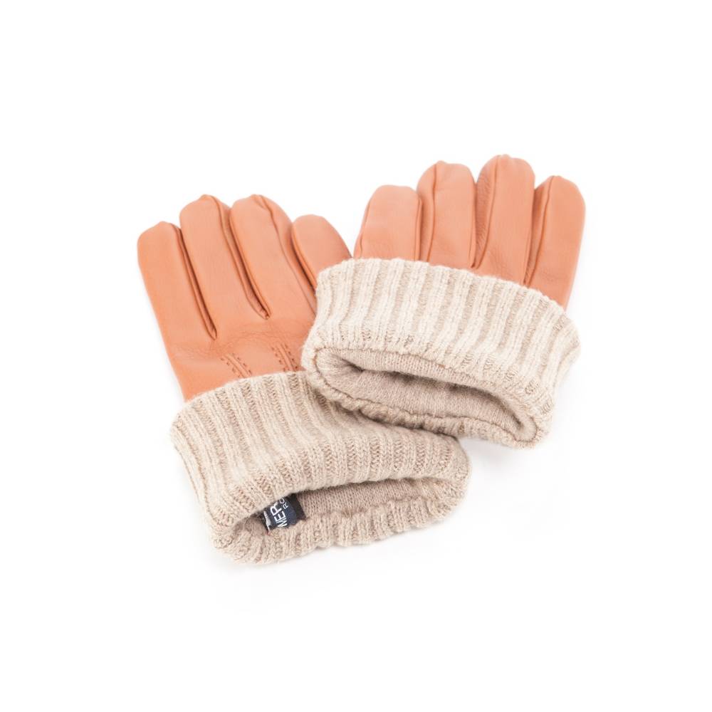 Тёплые мужские перчатки итальянской компании Merola с удлиненным двухслойным манжетом и подкладкой из кашемира. С внешней стороны перчатки выполнены из плотной оленьей кожи коричневого цвета.