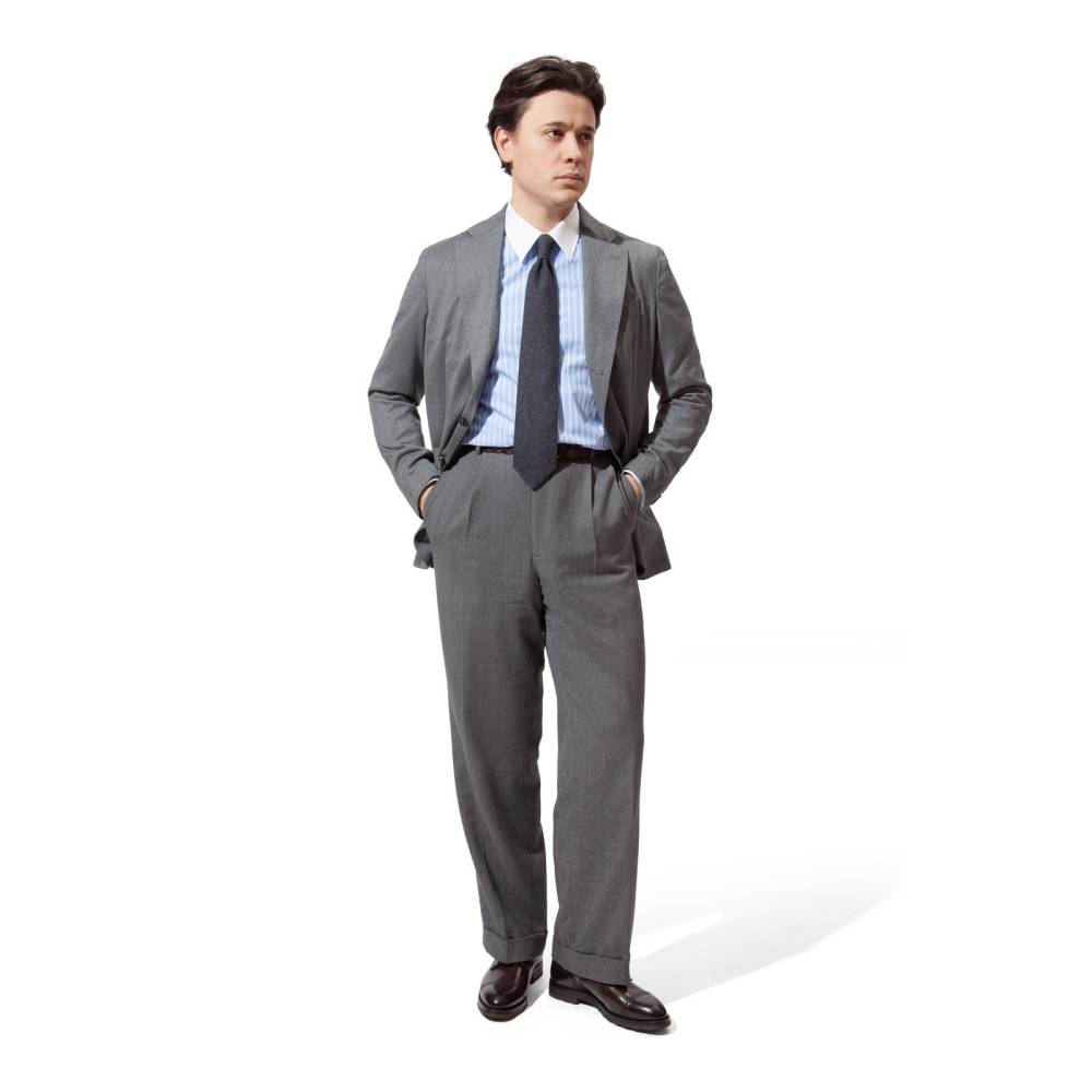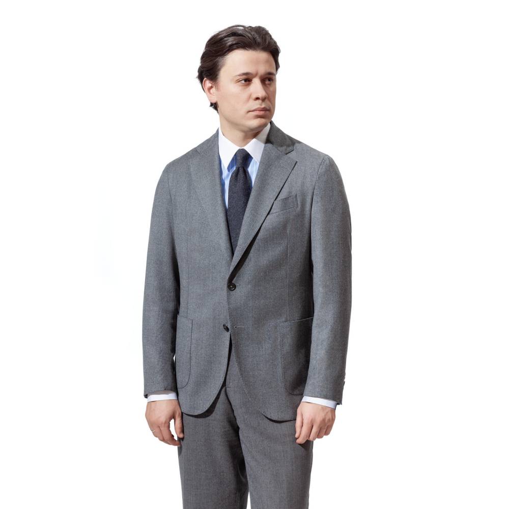 Непарный пиджак от итальянского бренда Errico Formicola. Изготовлен полностью без подкладки (Unstructured), что обеспечивает легкость и комфорт. Мягкая драпировка и непринужденный неаполитанский стиль с естественным плечом. Модель менее формальна, чем традиционный костюмный пиджак, но элегантнее спортивного пиджака. Идеально подходит для стилей Smart Casual и Business Casual. Имеет два удобных накладных кармана спереди и один прорезной нагрудный карман. Застегивается на 3-roll-2 пуговицы. Пуговицы изготовлены из натурального рога. Низ рукава выполнен без петель и пуговиц (подгибка открыта), что дает возможность индивидуальной регулировки длины манжеты под параметры владельца. Изделие выполнено из чистой шерсти фланели серого цвета.