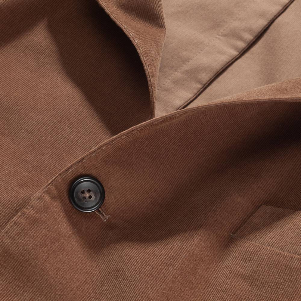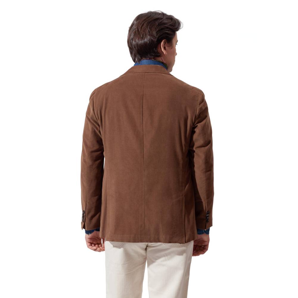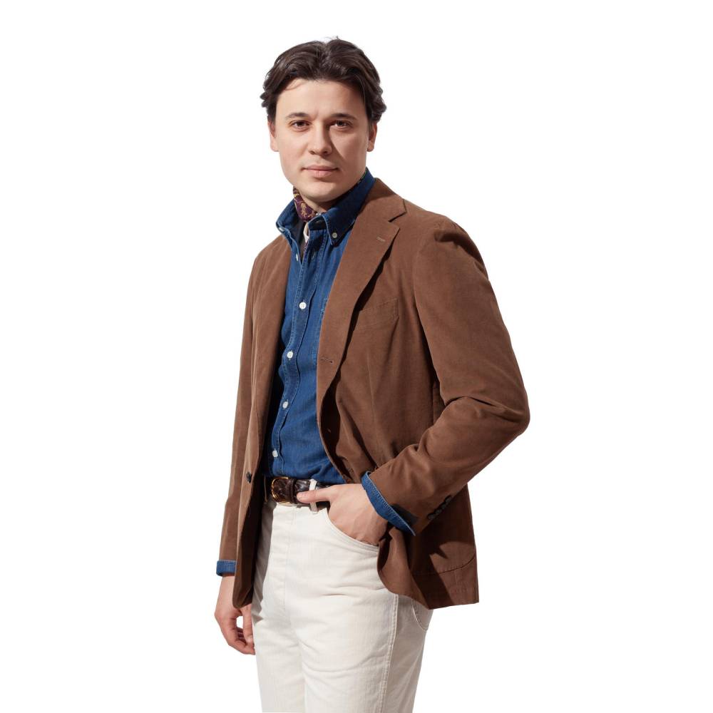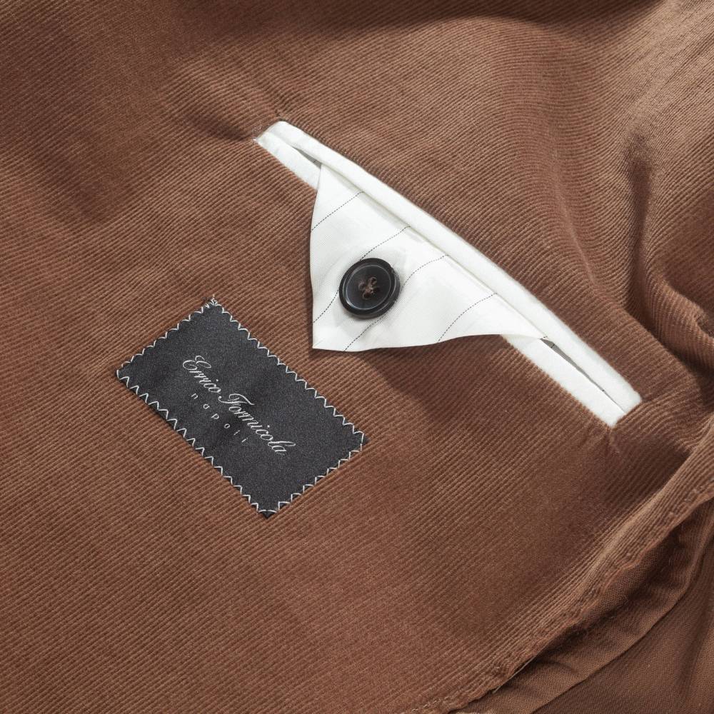 Непарный пиджак от итальянского бренда Errico Formicola. Изготовлен полностью без подкладки (Unstructured), что обеспечивает легкость и комфорт. Мягкая драпировка и непринужденный неаполитанский стиль с естественным плечом. Модель менее формальна, чем традиционный костюмный пиджак, но элегантнее спортивного пиджака. Идеально подходит для стилей Smart Casual и Business Casual. Имеет два удобных накладных кармана спереди и один прорезной нагрудный карман. Застегивается на 3-roll-2 пуговицы. Пуговицы изготовлены из натурального рога. Низ рукава выполнен без петель и пуговиц (подгибка открыта), что дает возможность индивидуальной регулировки длины манжеты под параметры владельца. Изделие выполнено из чистого хлопка микровельвета коричневого цвета.