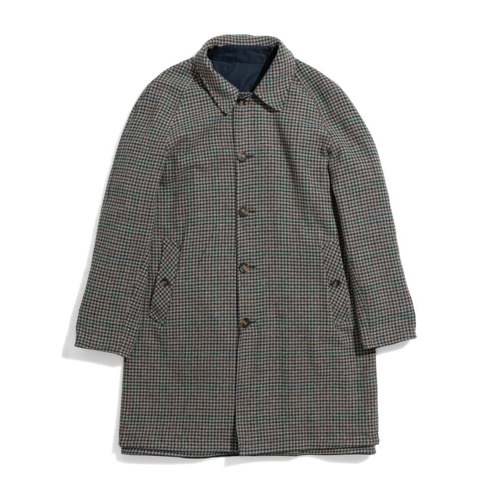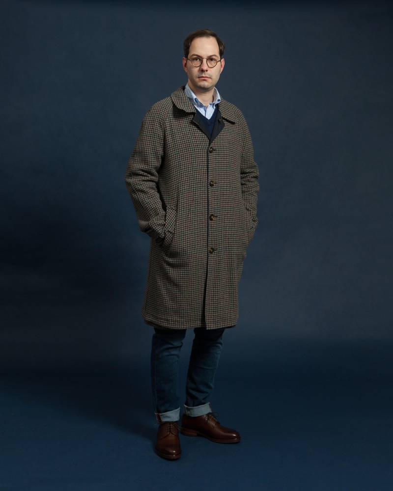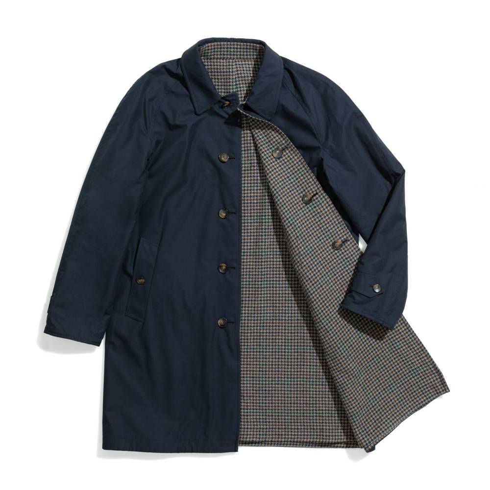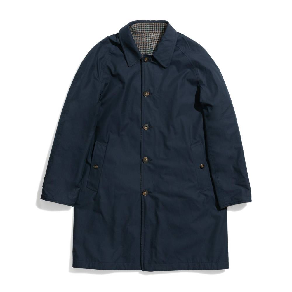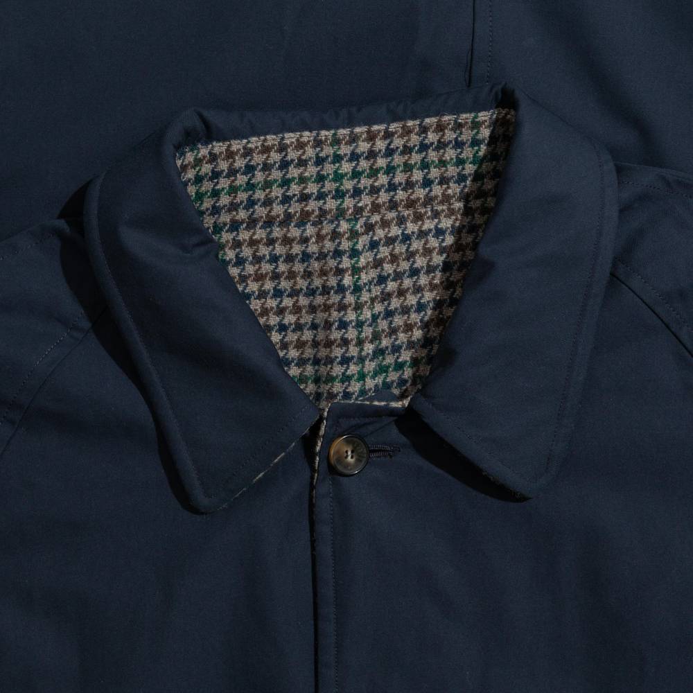 Тёмно-синий двусторонний плащ итальянского бренда L`Impermeabile. Одна сторона выполнена из 100% хлопкового габардина (ткани очень плотного переплетения, из которой принято шить классические плащи), а другая — из 100% шерсти в ломаную клетку (англ. houndstooth). Универсальная и практичная модель комфортного кроя удачно дополнит практически любой образ: А-образный силуэт позволит надеть плащ и на объёмный джемпер, и на пиджак, а рукав реглан не стеснит движений. За счёт сдержанной расцветки в тёмных тонах этот плащ лучше сочетается с более строгими вещами серого или синего цветов. Глубокие карманы застёгиваются на пуговицы.