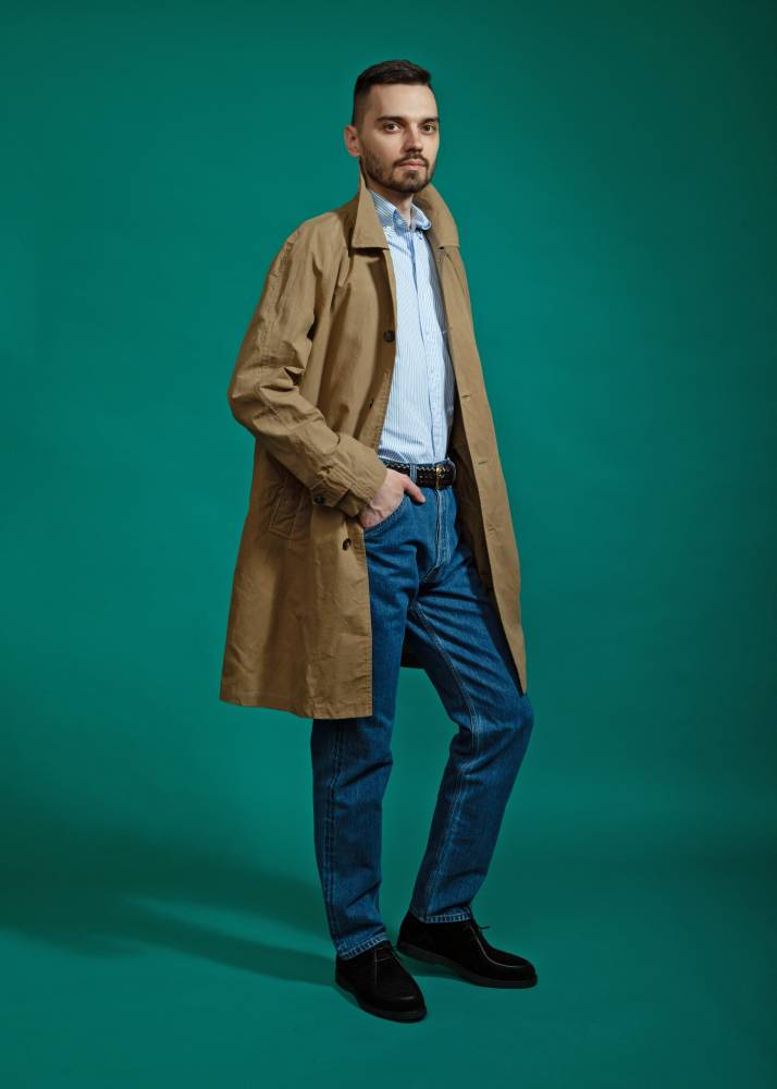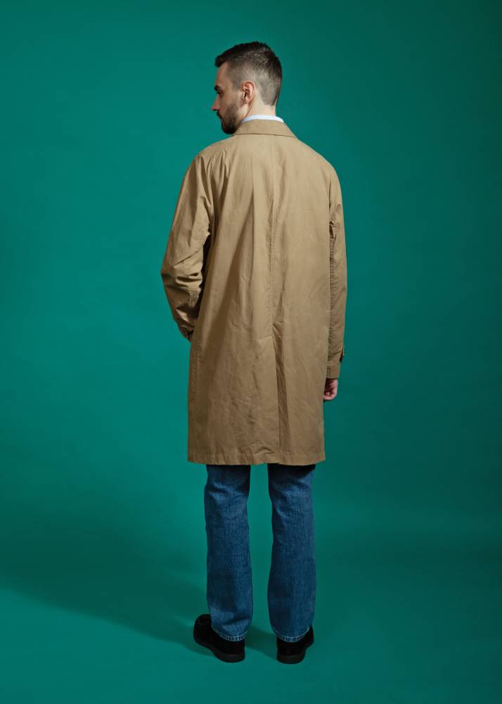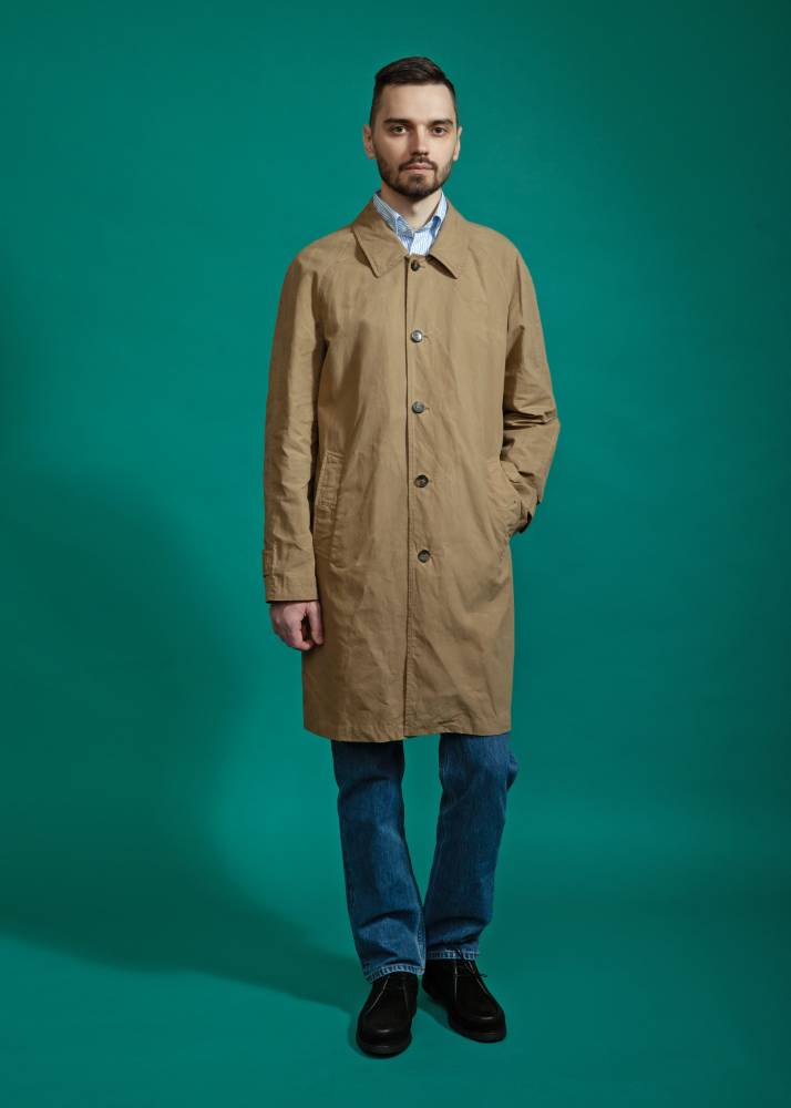Лёгкий бежевый мужской плащ итальянского бренда L`Impermeabile без подкладки. Модель сшита из 100 % хлопковой ткани, обработанной специальным воском для большей влагостойкости. Универсальная и практичная модель комфортного кроя не стеснит движений и удачно впишется практически в любой образ (но фактура больше располагает к стилю casual). Рукав реглан. Глубокие карманы застёгиваются на пуговицы, выполненные из качественного полимера, имитирующего рог.