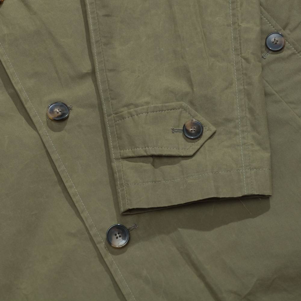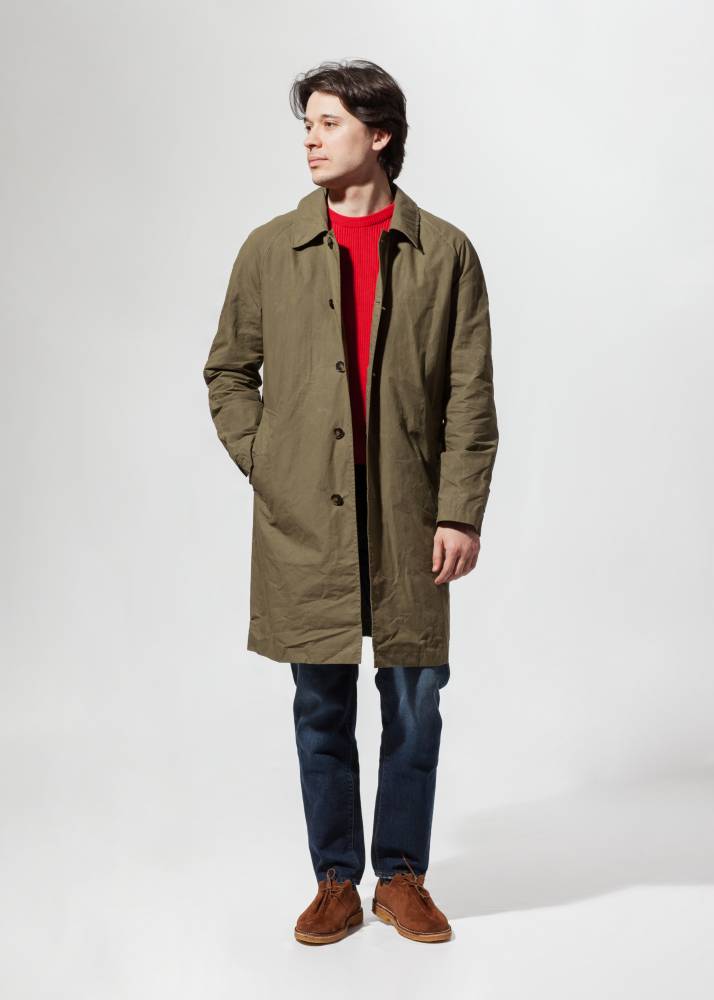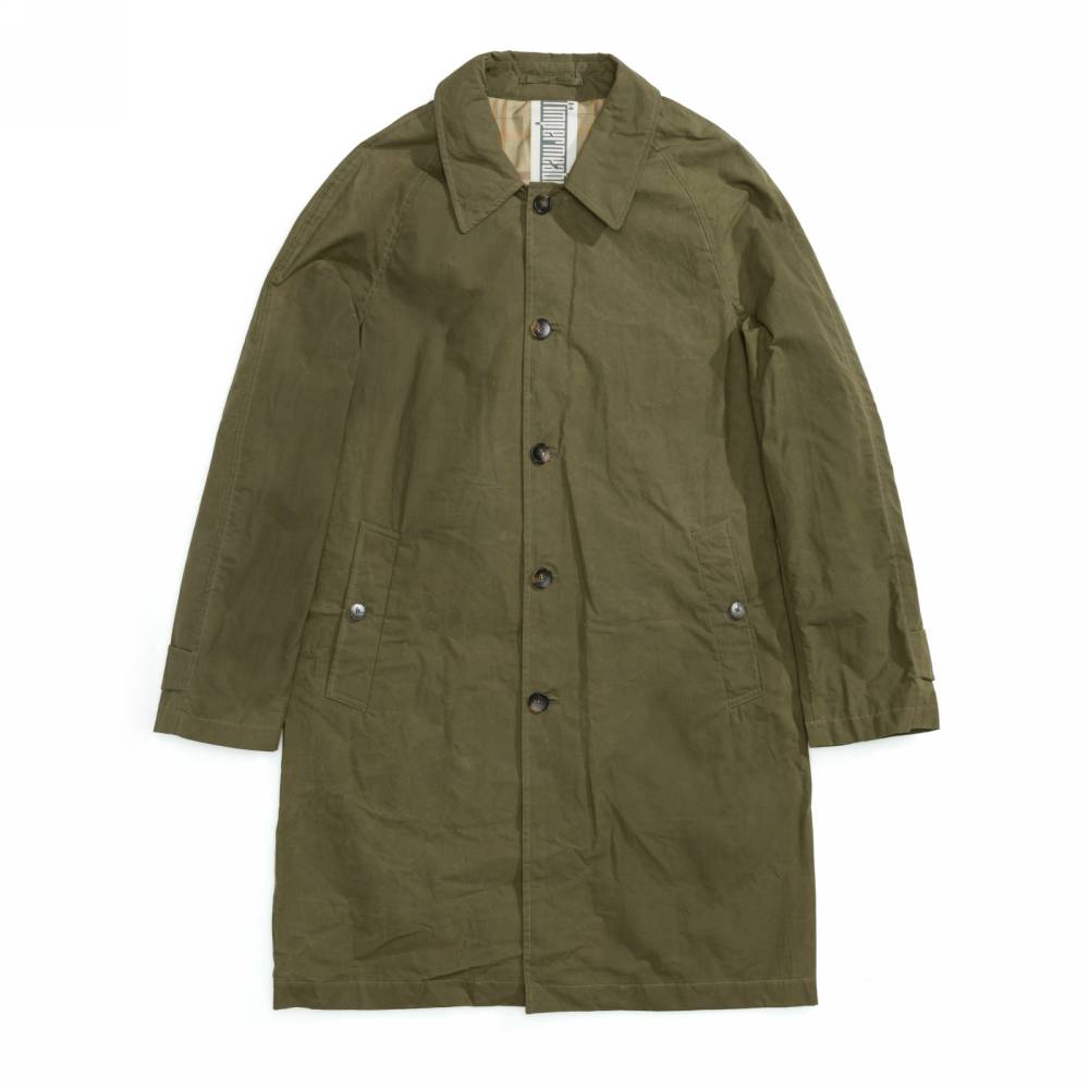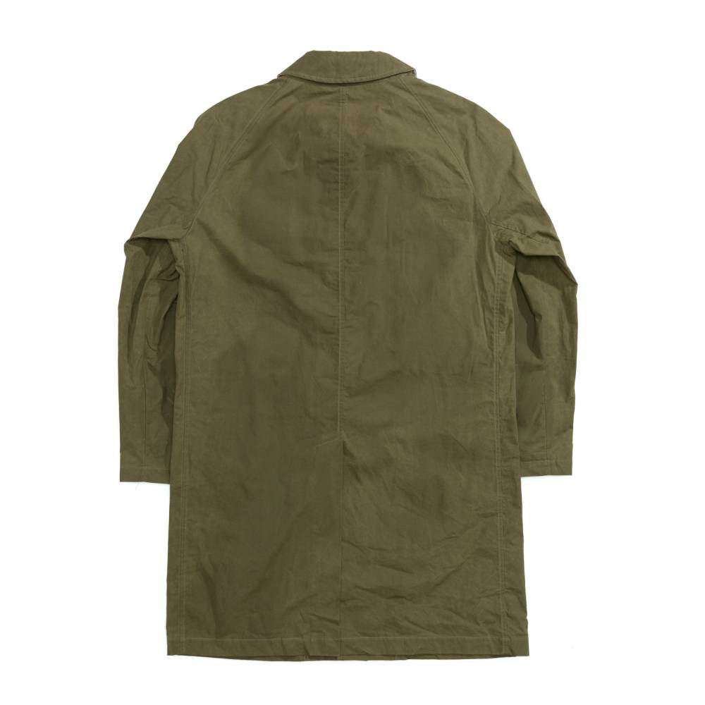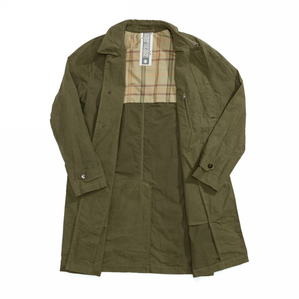 Лёгкий оливковый мужской плащ итальянского бренда L`Impermeabile без подкладки. Модель сшита из 100 % хлопковой ткани, обработанной специальным воском для большей влагостойкости. Универсальная и практичная модель комфортного кроя не стеснит движений и удачно впишется практически в любой образ (но фактура больше располагает к стилю casual). Рукава реглан. Глубокие карманы застёгиваются на пуговицы, выполненные из качественного полимера, имитирующего рог.