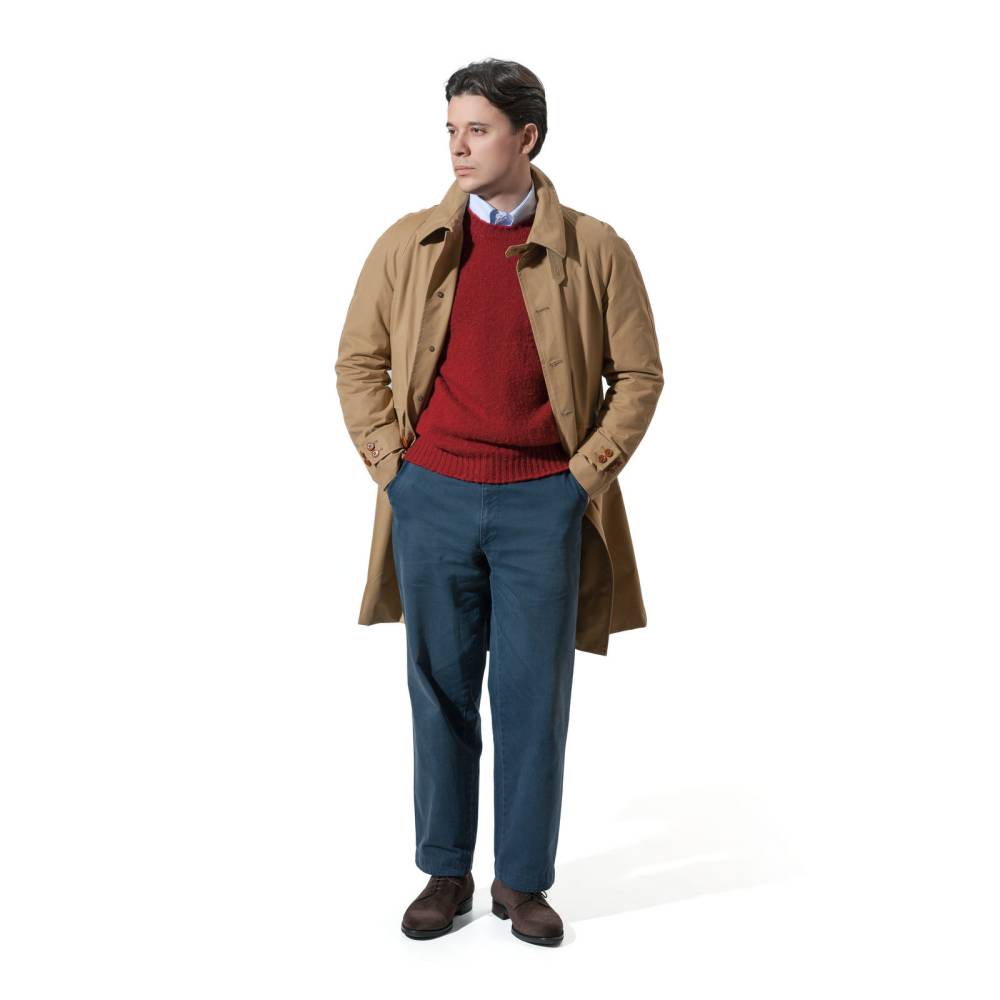 Внутри плащ имеет подкладку из смеси шерсти, вискозы и полиэстера. Модель оснащена рукавами-реглан с регулируемыми манжетами и одной шлицей сзади.