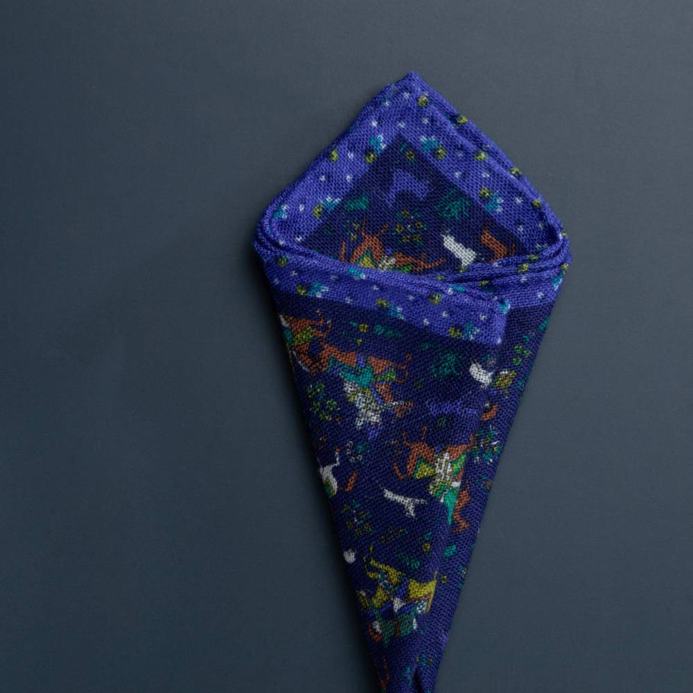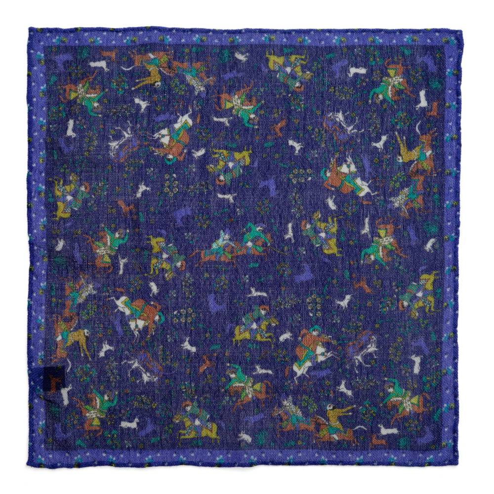 Элегантный мужской карманный платок Arcuri в синей цветовой гамме с яркими рисунками в виде наездников и животных. Выполнен из легчайшей итальянской ткани (100% шерсть). Края по периметру подшиты вручную. Платок великолепно драпируется и держит нужную форму, добавляя изысканный акцент практически в любой образ.