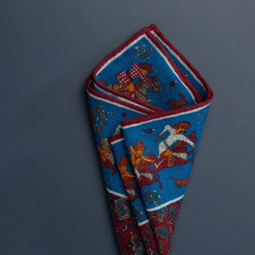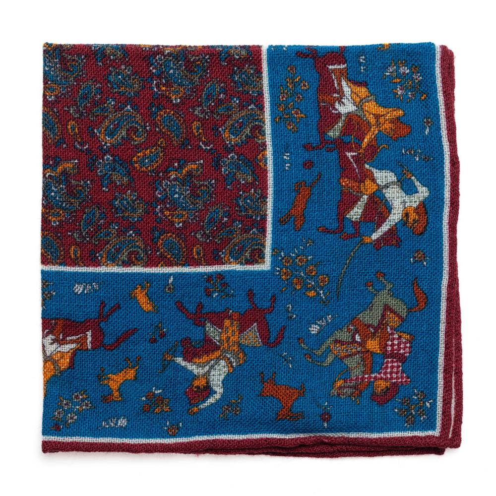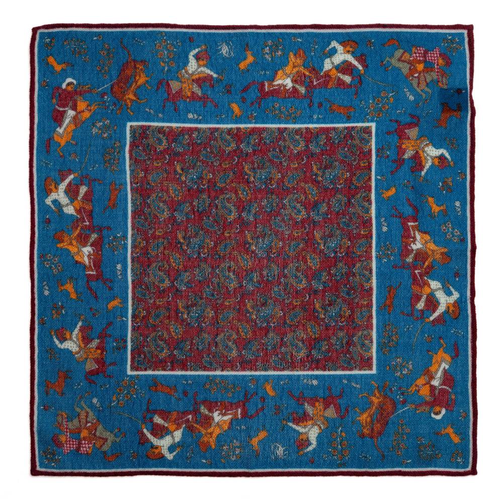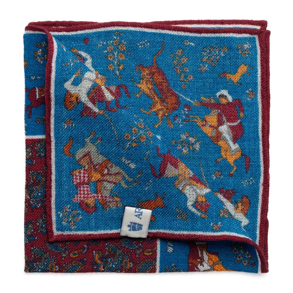 Элегантный мужской карманный платок Arcuri в сине-бордовой цветовой гамме с оригинальными рисунками в восточном стиле в виде охотников и животных. Выполнен из легчайшей итальянской ткани (100% шерсть). Края по периметру подшиты вручную. Платок великолепно драпируется и держит нужную форму, добавляя изысканный акцент практически в любой неформальный образ.