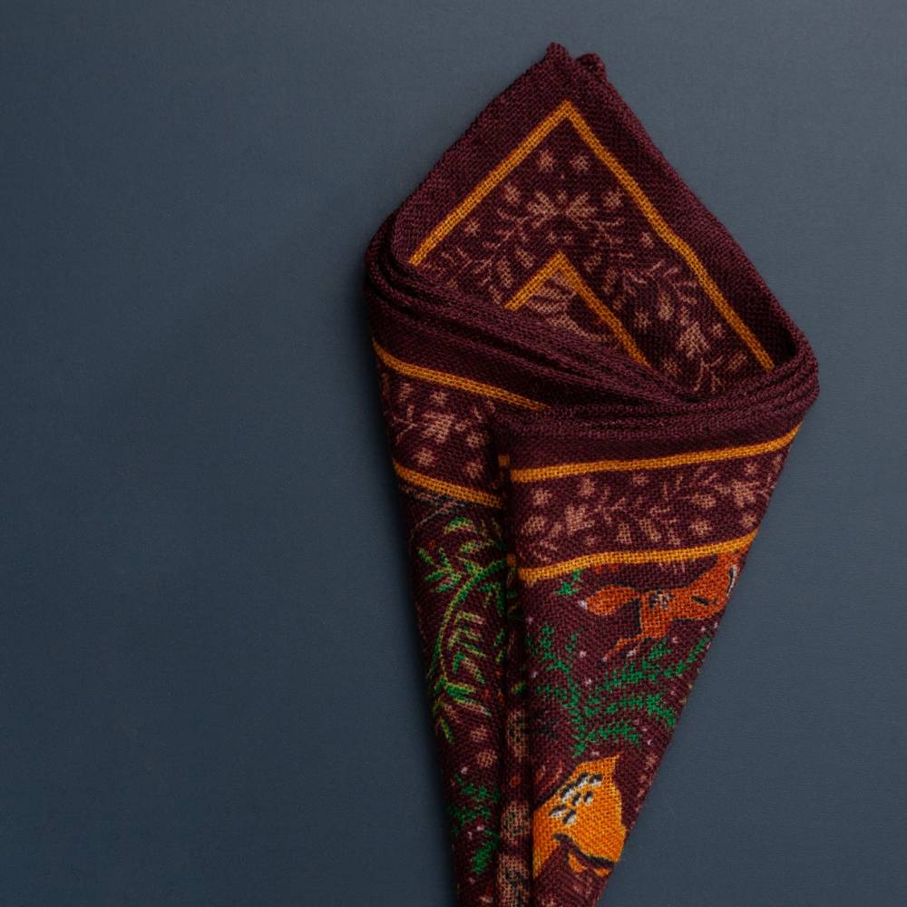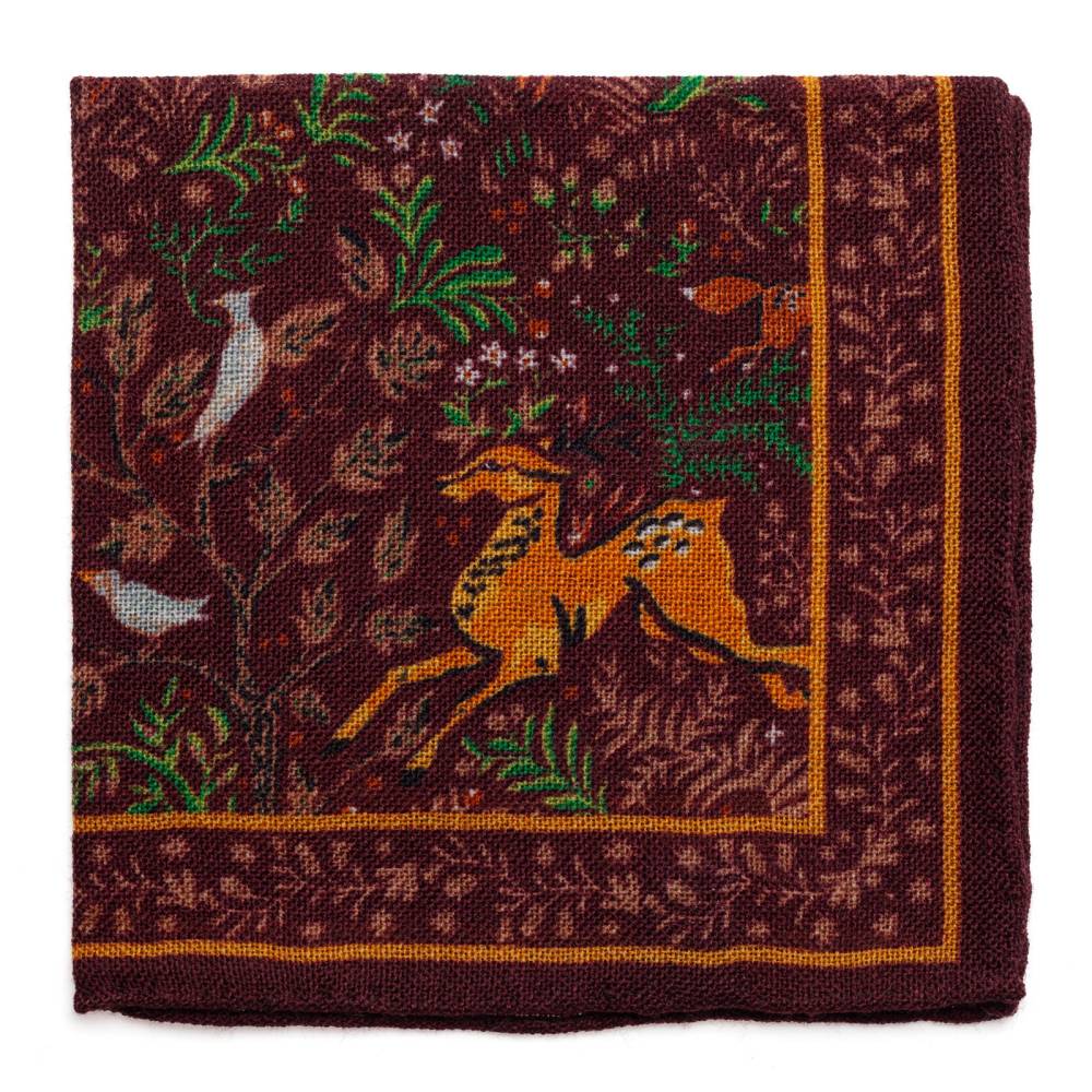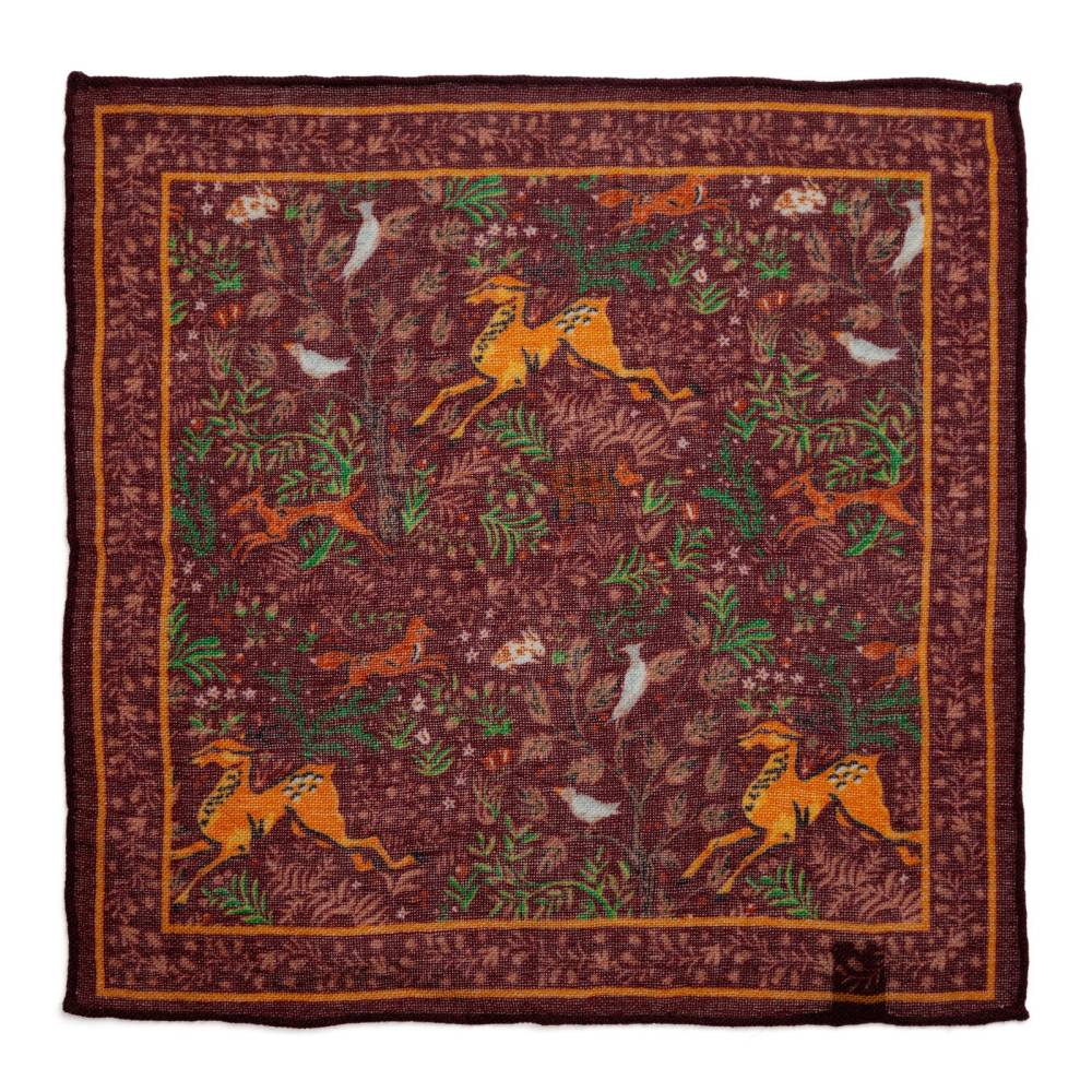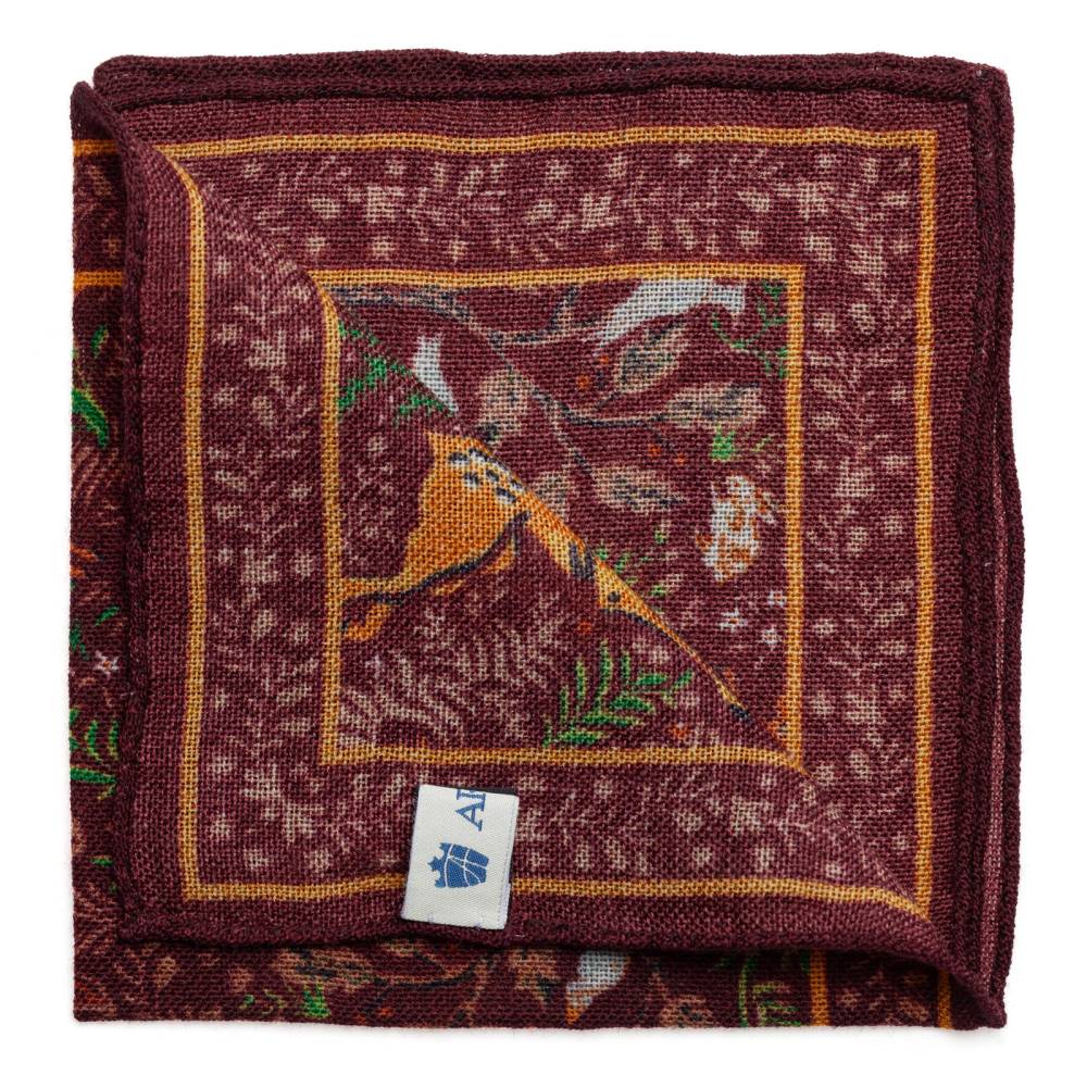 Элегантный мужской карманный платок Arcuri коричневого цвета с контрастными рисунками в виде животных и растений. Выполнен из легчайшей итальянской ткани (100% шерсть). Края по периметру подшиты вручную. Платок великолепно драпируется и держит нужную форму, добавляя изысканный акцент практически в любой неформальный образ.