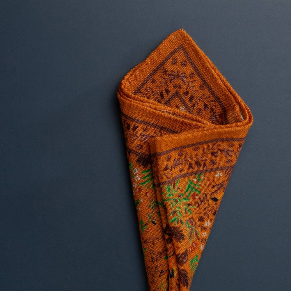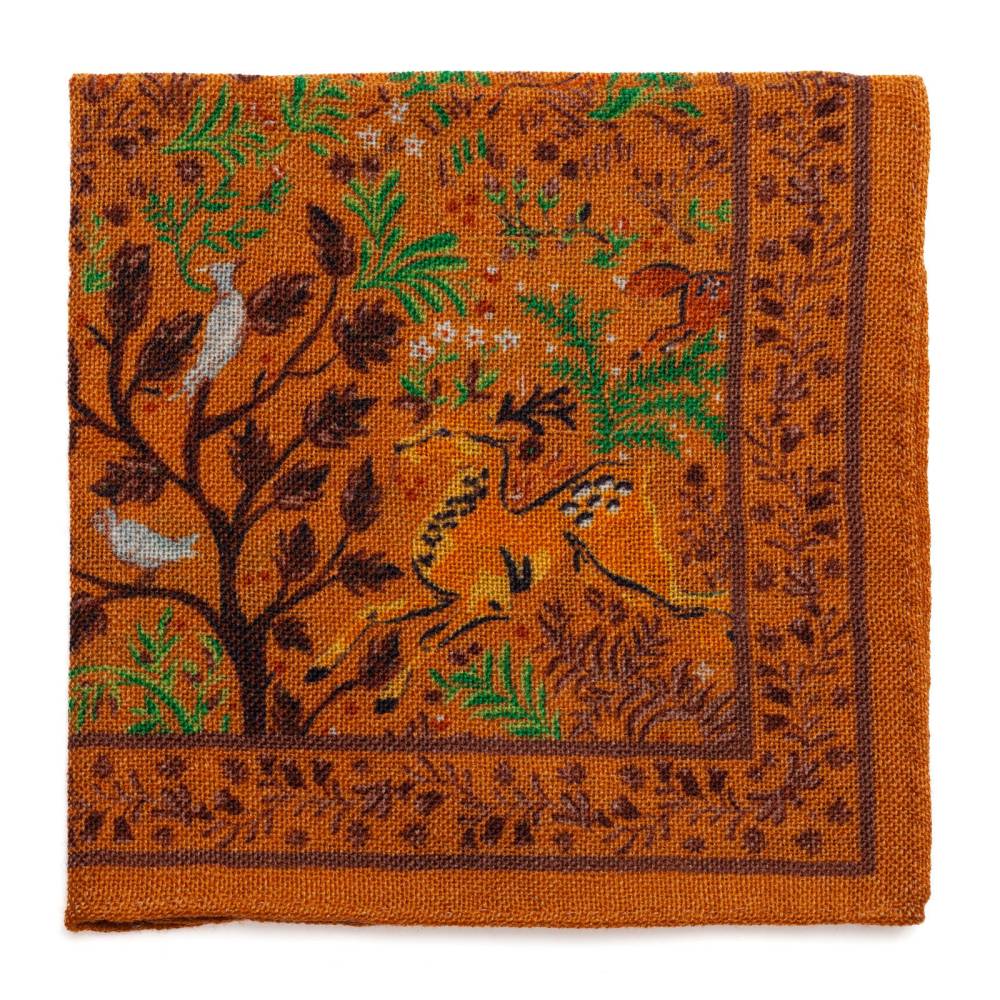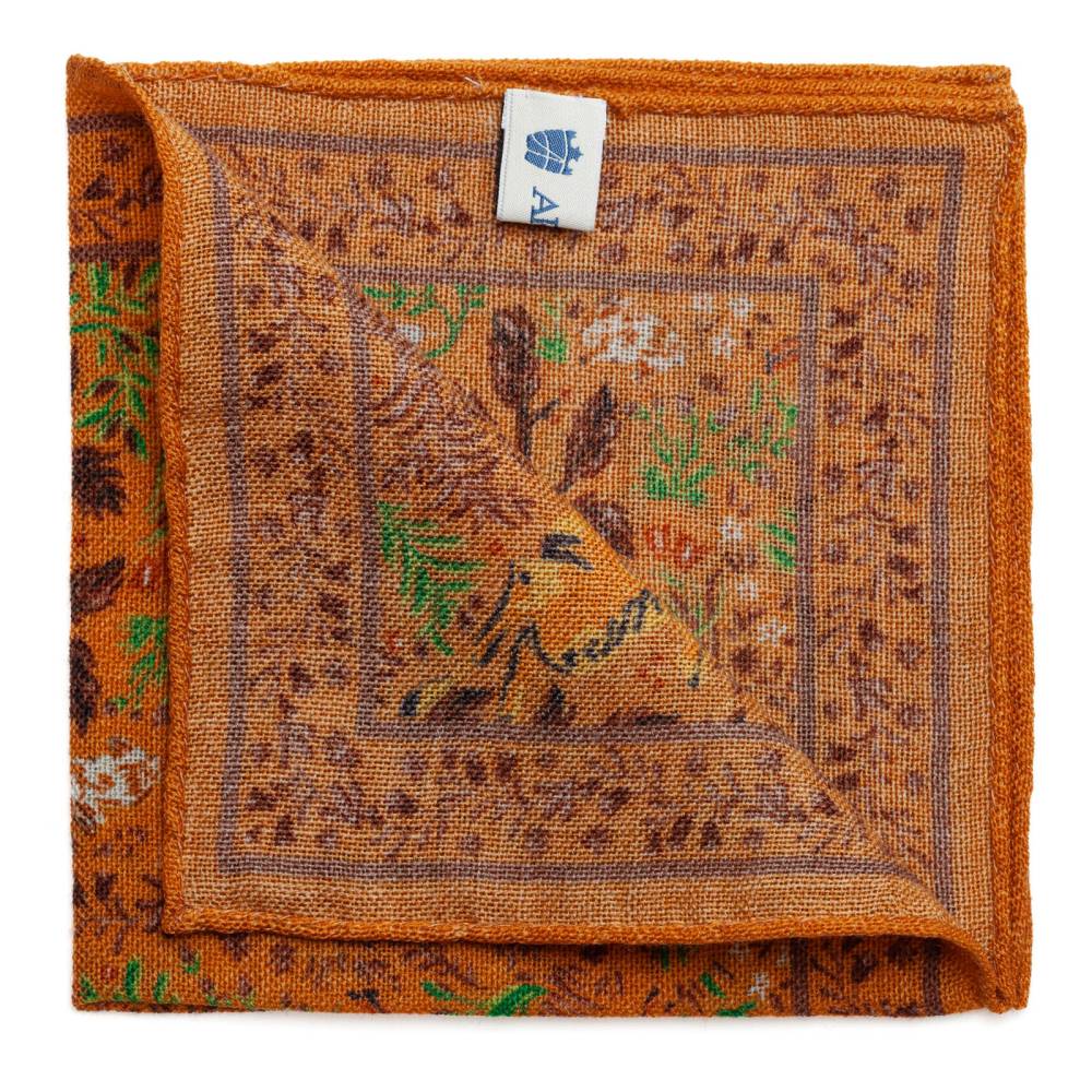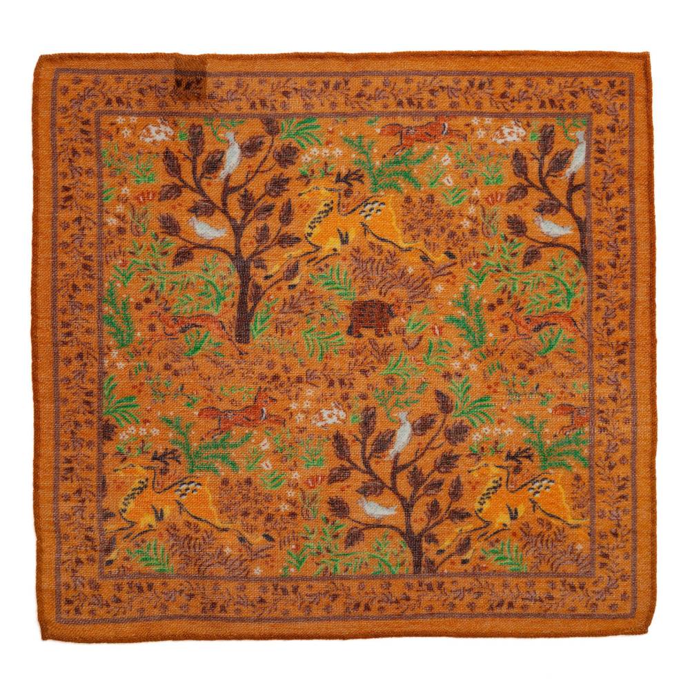 Элегантный мужской карманный платок Arcuri оранжевого цвета с контрастными рисунками в виде животных и растений. Выполнен из легчайшей итальянской ткани (100% шерсть). Края по периметру подшиты вручную. Платок великолепно драпируется и держит нужную форму, добавляя изысканный акцент практически в любой неформальный образ.
