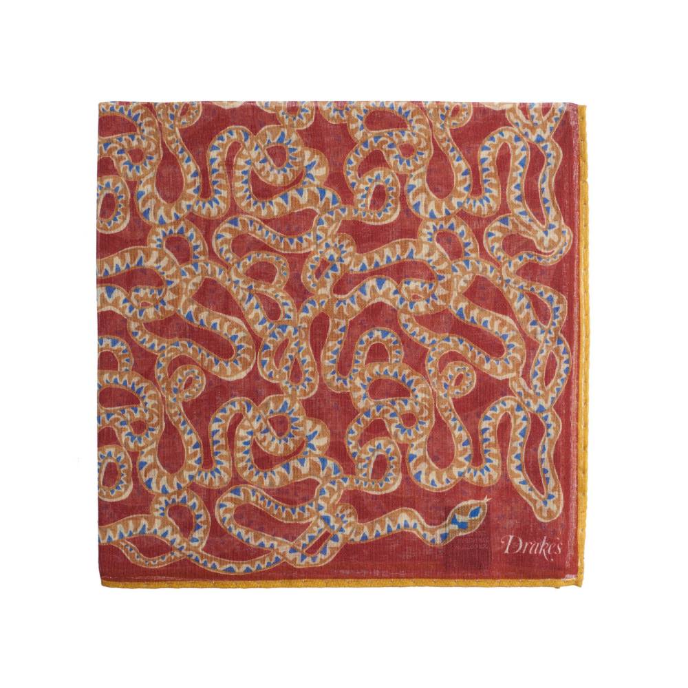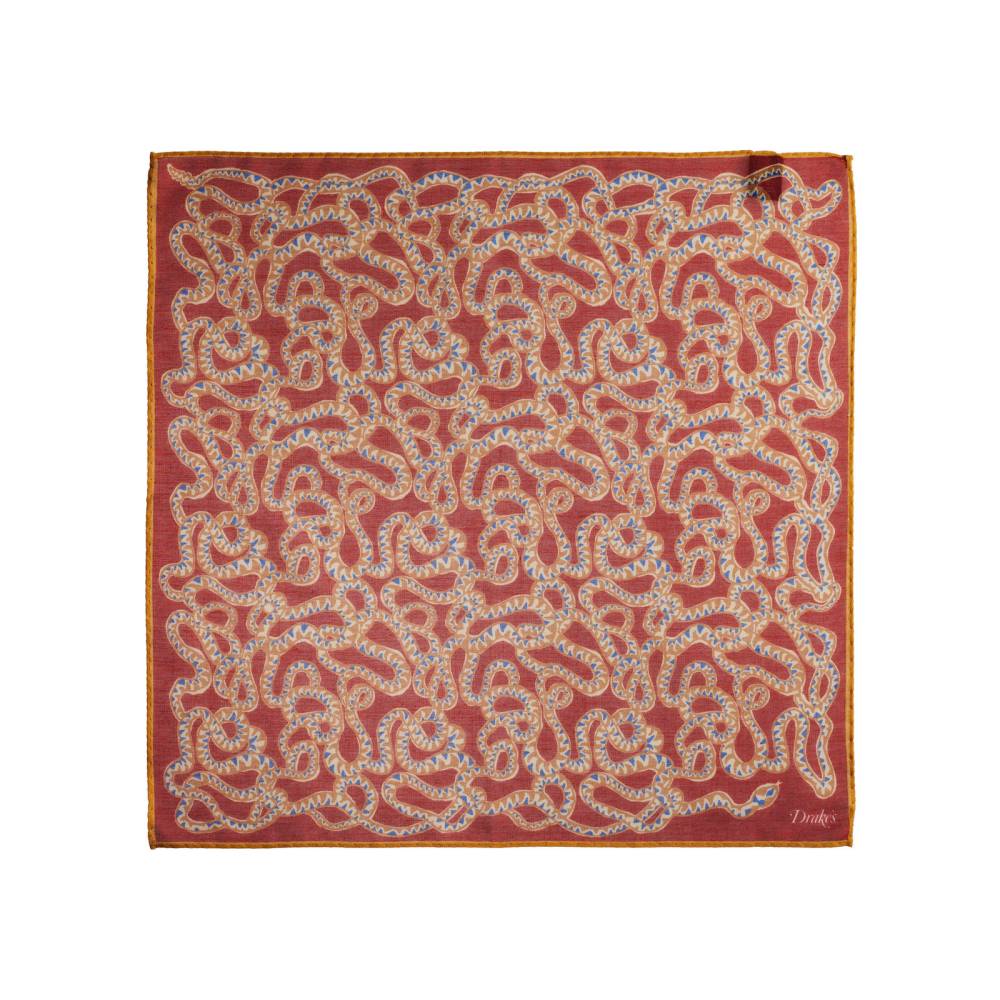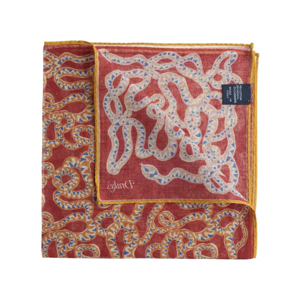 Элегантный мужской карманный платок в неброской красной цветовой гамме с изображением змеи в восточном стиле. Выполнен из легчайшей итальянской ткани, в состав которой входят хлопок и модал с добавлением кашемира, благодаря чему платок хорошо драпируется и держит нужную форму, добавляя изысканный акцент практически в любой образ. Сделан в Италии.
