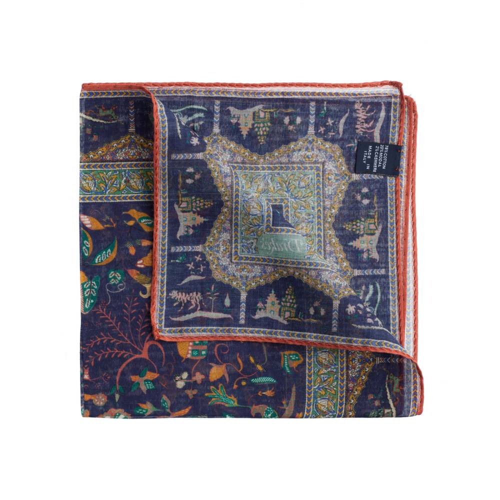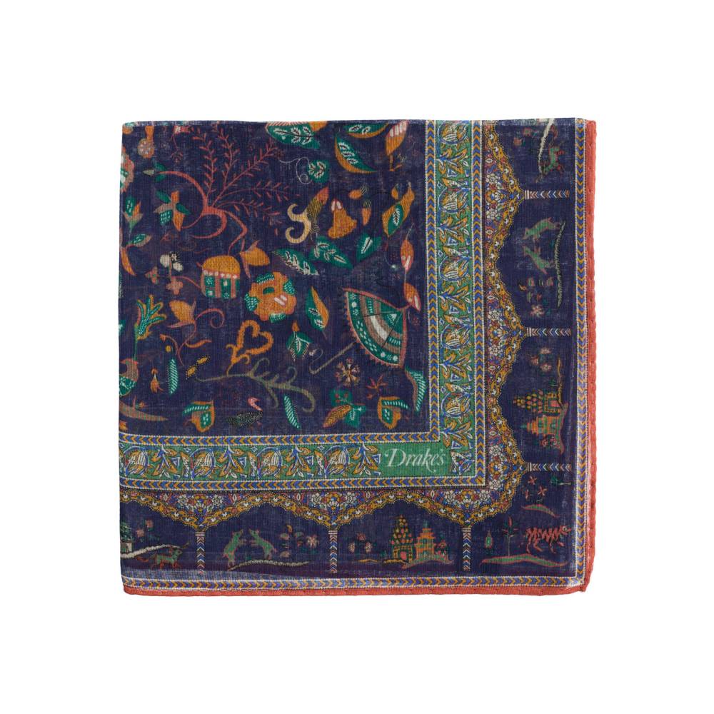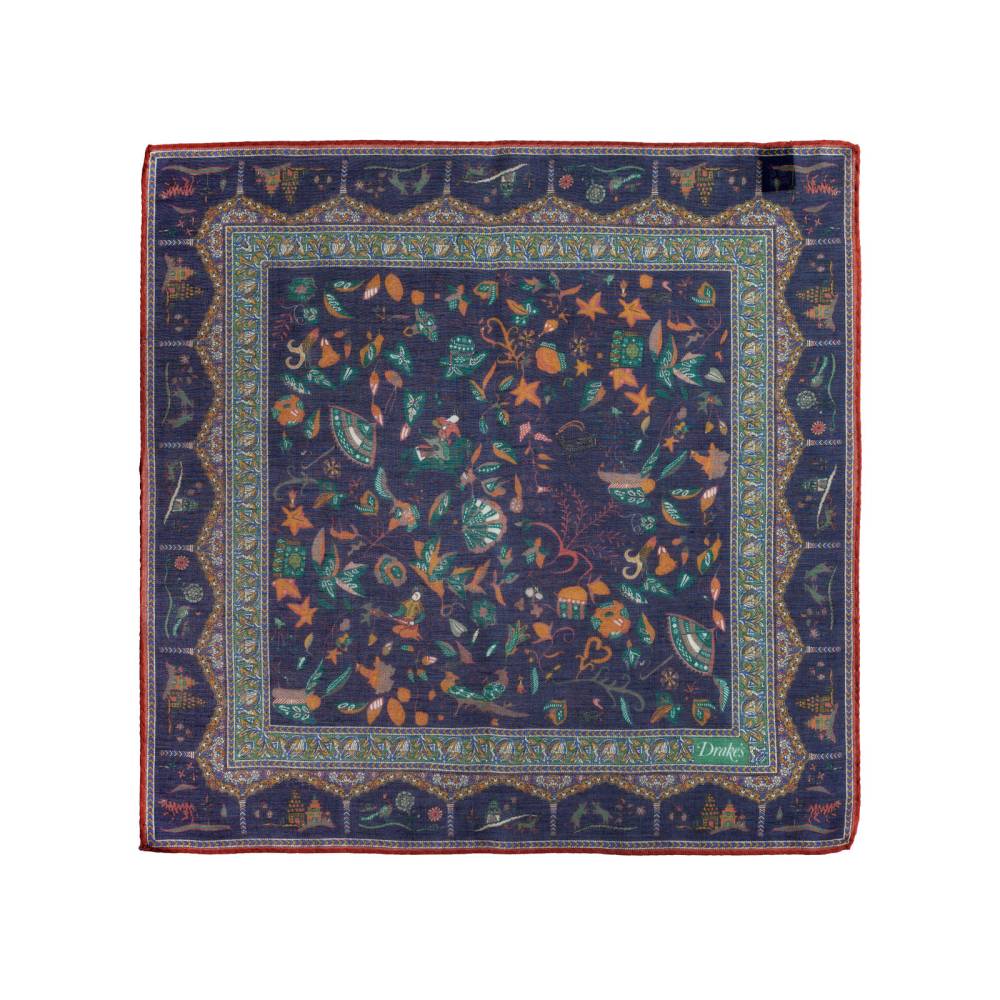 Элегантный мужской карманный платок в тёмно-синей цветовой гамме с красочными рисунками в могольском стиле. Орнамент взят из собственных архивов компании Drake’s. Выполнен из легчайшей итальянской ткани, в состав которой входят хлопок и модал с добавлением кашемира, благодаря чему платок хорошо драпируется и держит нужную форму, добавляя изысканный акцент практически в любой образ. Сделан в Италии.
