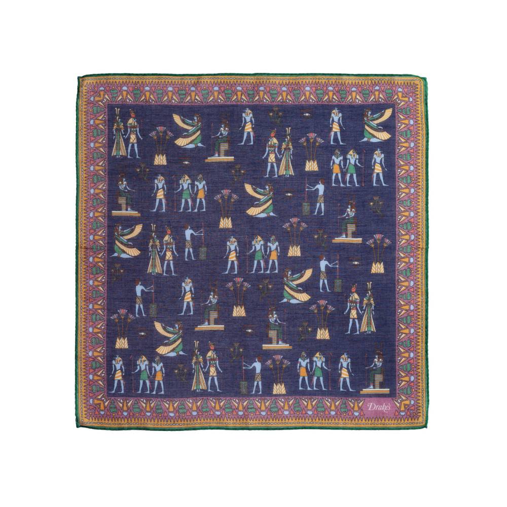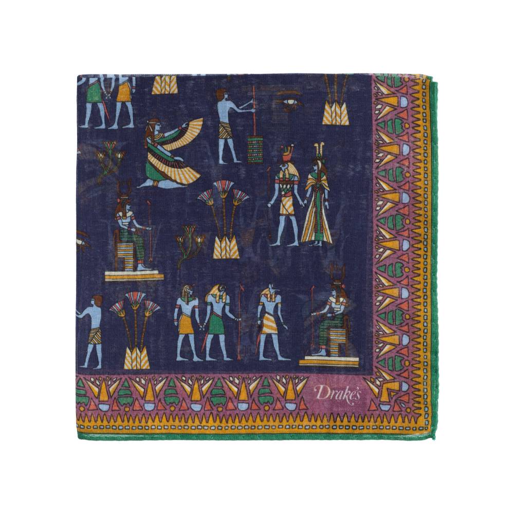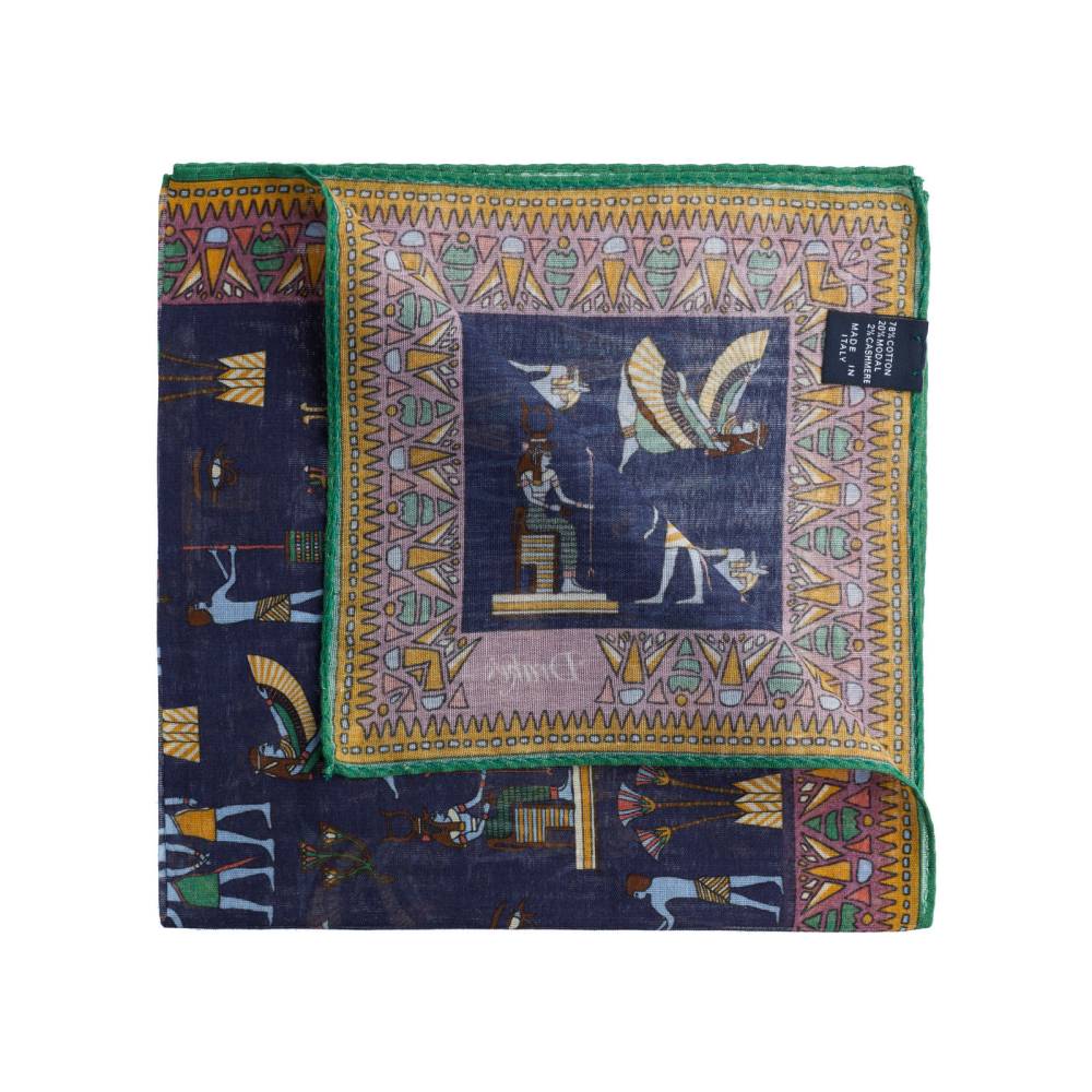 Элегантный мужской карманный платок в тёмно-синей цветовой гамме с древнеегипетскими мотивами. Выполнен из легчайшей итальянской ткани, в состав которой входят хлопок и модал с добавлением кашемира, благодаря чему платок хорошо драпируется и держит нужную форму, добавляя изысканный акцент практически в любой образ. Сделан в Италии.