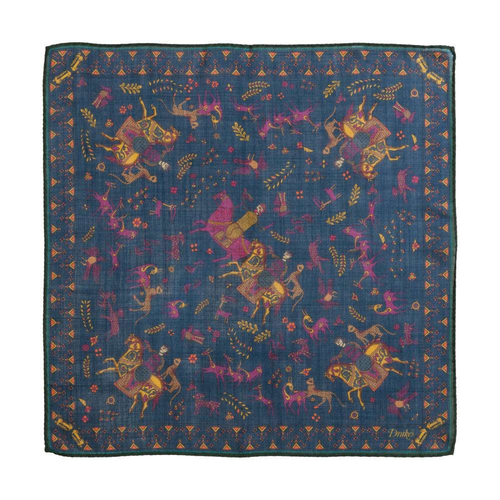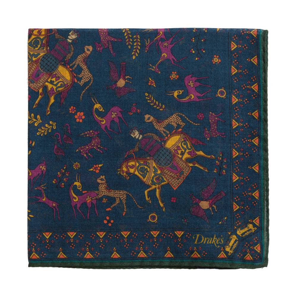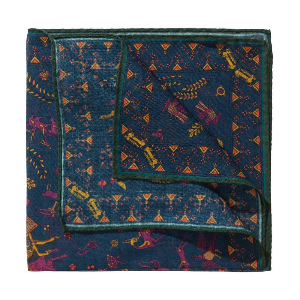 Элегантный мужской карманный платок в тёмно-синей цветовой гамме с красочными принтами всадников в могольском стиле. Выполнен из легчайшей итальянской ткани, в состав которой входят шёлк и шерсть. Платок хорошо драпируется и держит нужную форму, добавляя изысканный акцент практически в любой образ. Сделан в Италии.