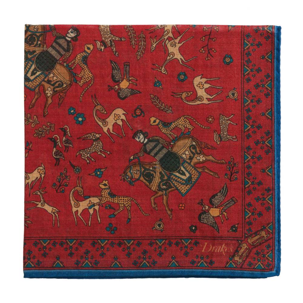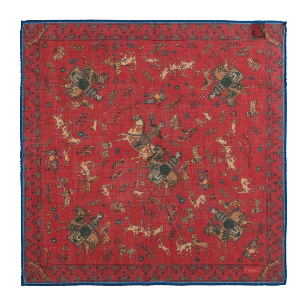 Элегантный мужской карманный платок в бордовой цветовой гамме с красочными принтами всадников в могольском стиле. Выполнен из легчайшей итальянской ткани, в состав которой входят шёлк и шерсть. Платок хорошо драпируется и держит нужную форму, добавляя изысканный акцент практически в любой образ. Сделан в Италии.