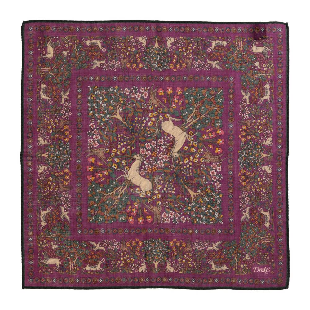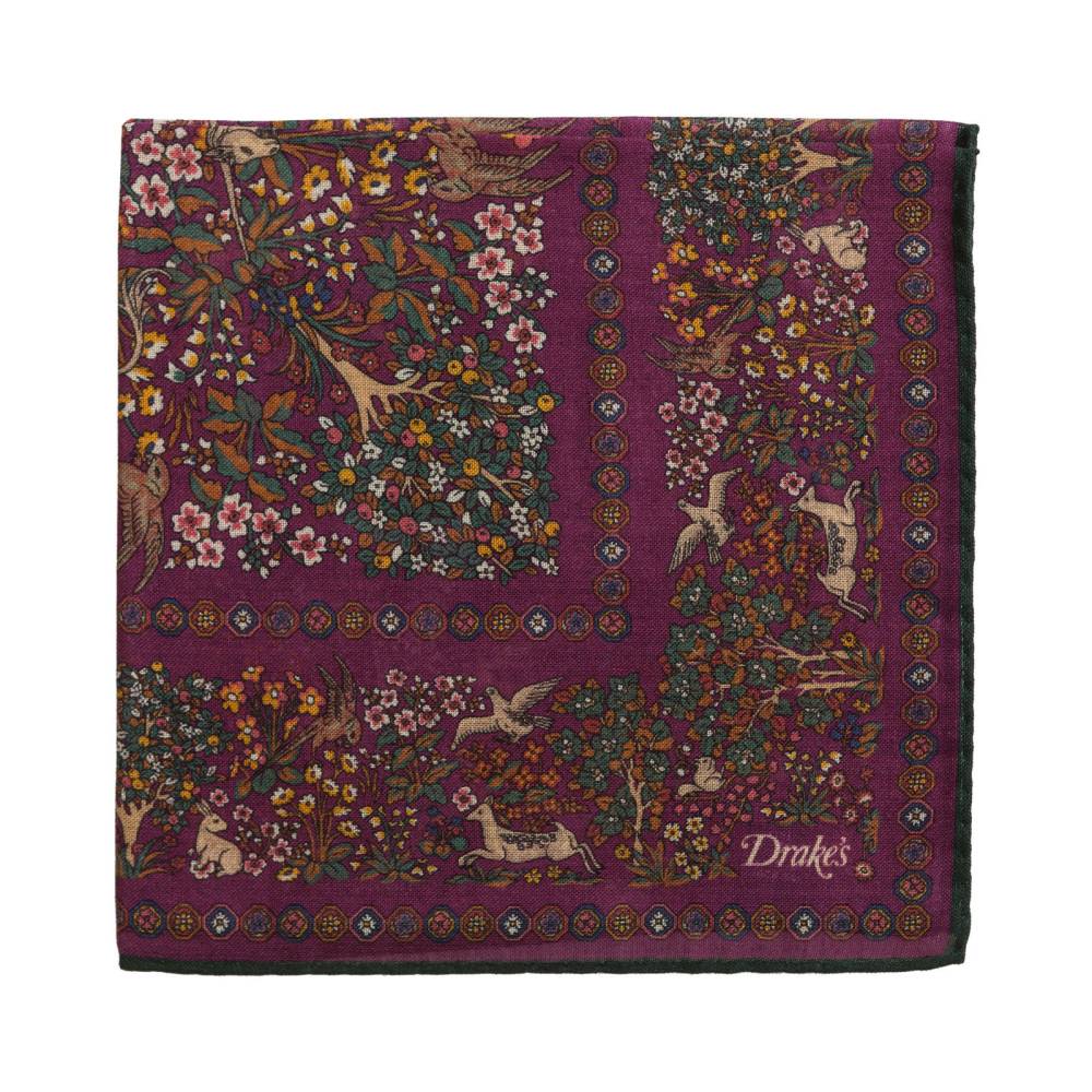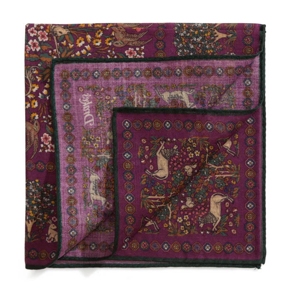 Элегантный мужской карманный платок в сиреневой цветовой гамме с красочными принтами в могольском стиле с животными и цветами волшебного леса. Выполнен из легчайшей итальянской ткани, в состав которой входят шёлк и шерсть. Платок хорошо драпируется и держит нужную форму, добавляя изысканный акцент практически в любой образ. Сделан в Италии.