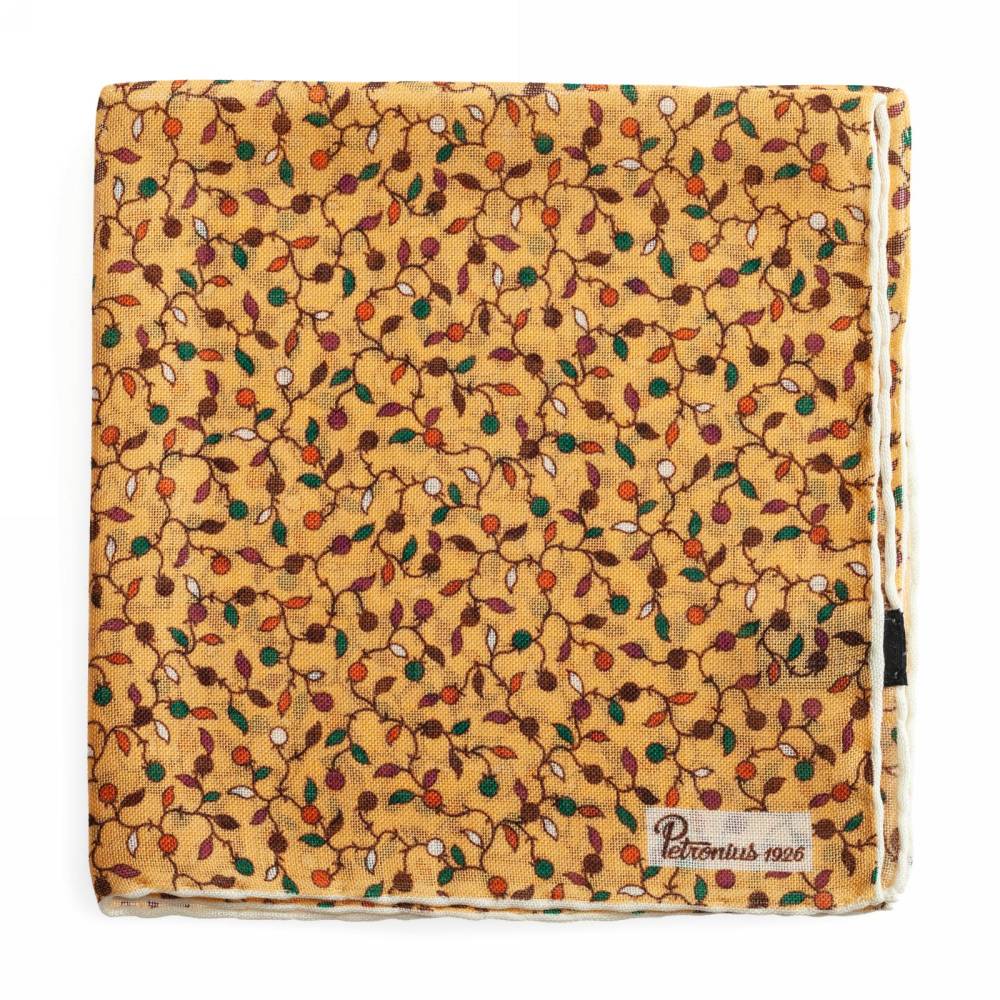 Элегантный карманный платок в жёлтой цветовой гамме с флористическим узором. Выполнен из лёгкой итальянской ткани, в состав которой входят шерсть и шёлк. Благодаря такому сочетанию материалов платок хорошо драпируется и держит нужную форму, добавляя изысканный акцент практически в любой образ. Ручная обработка по краю.