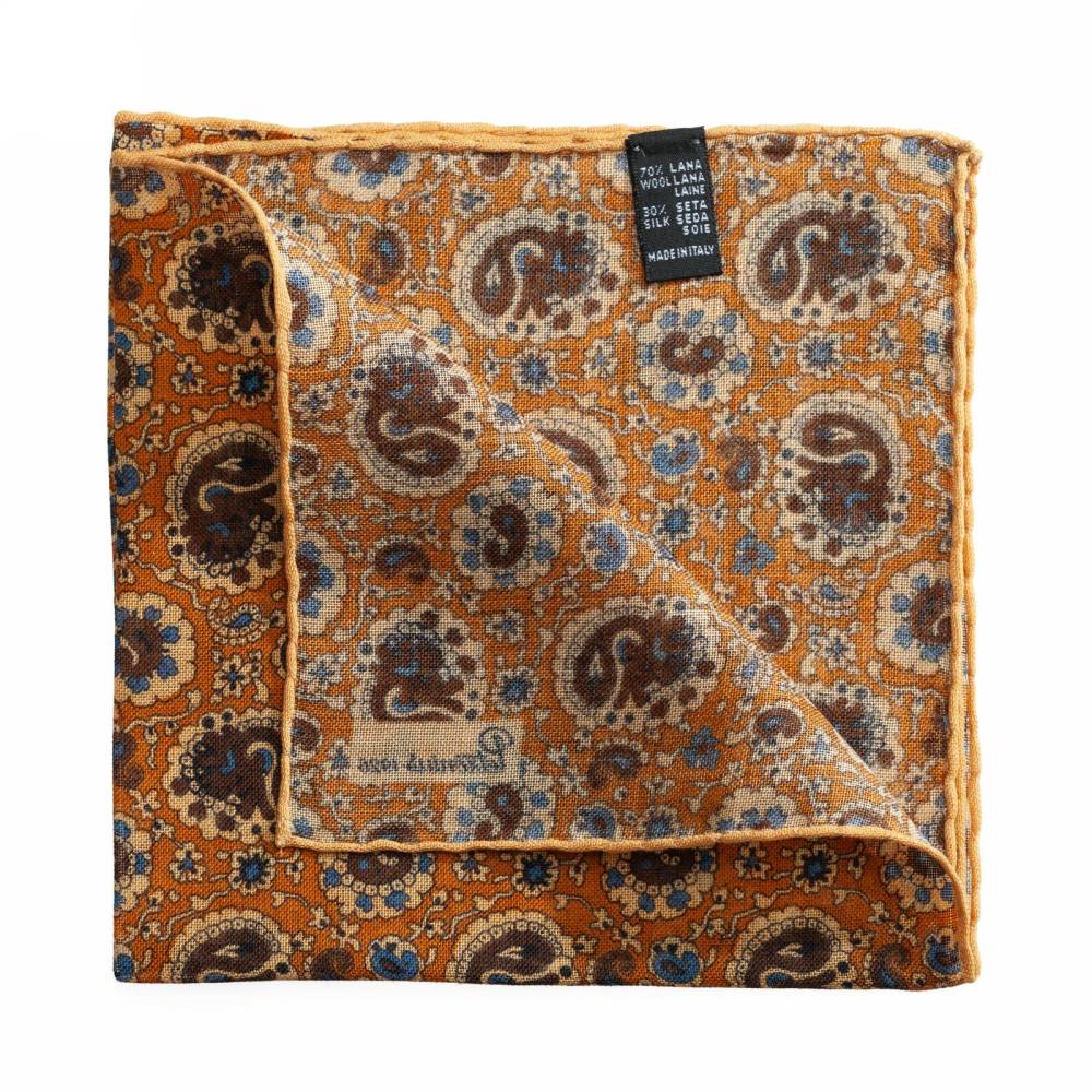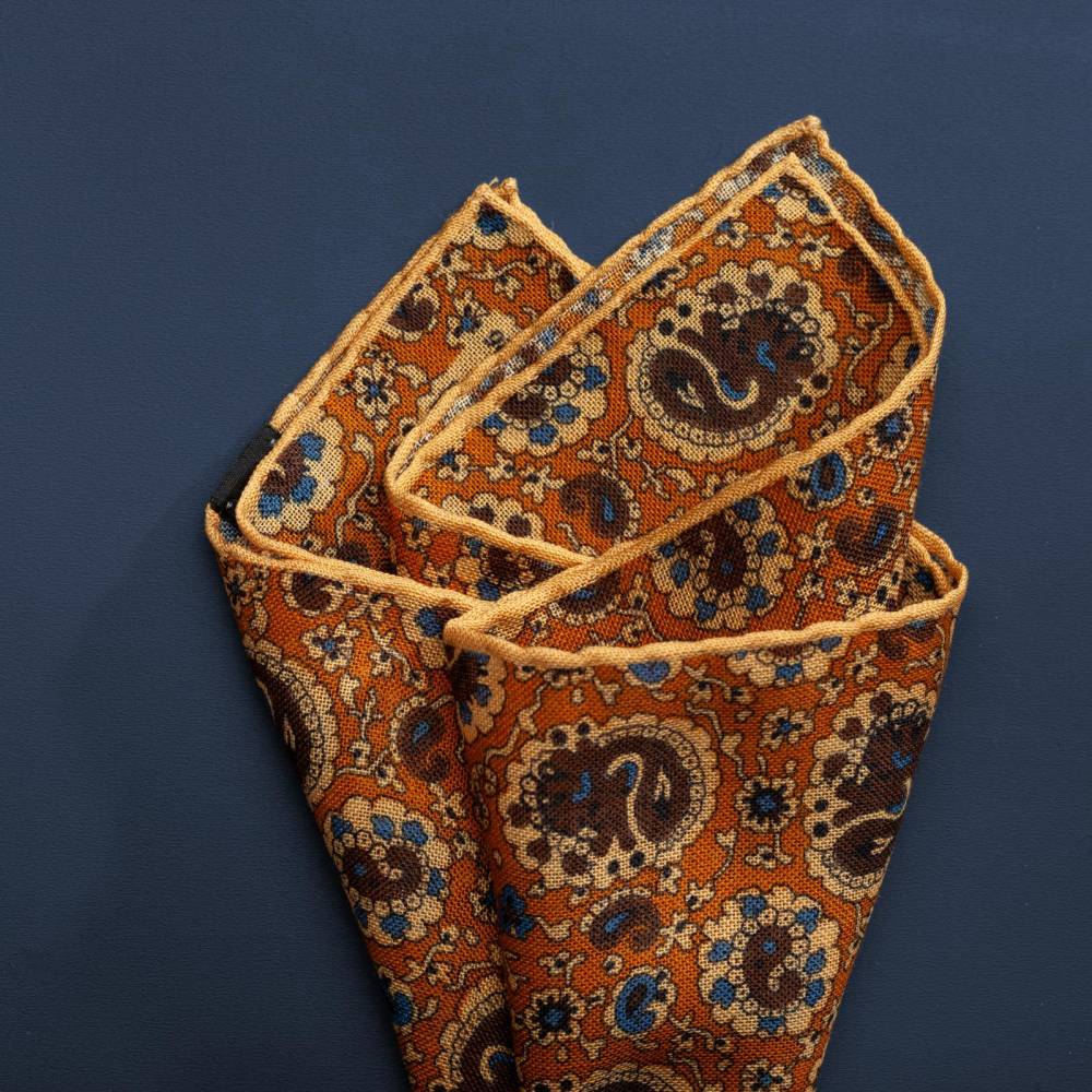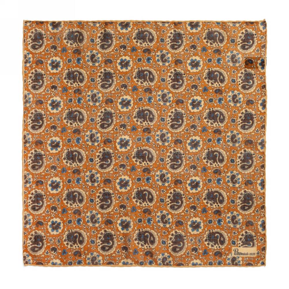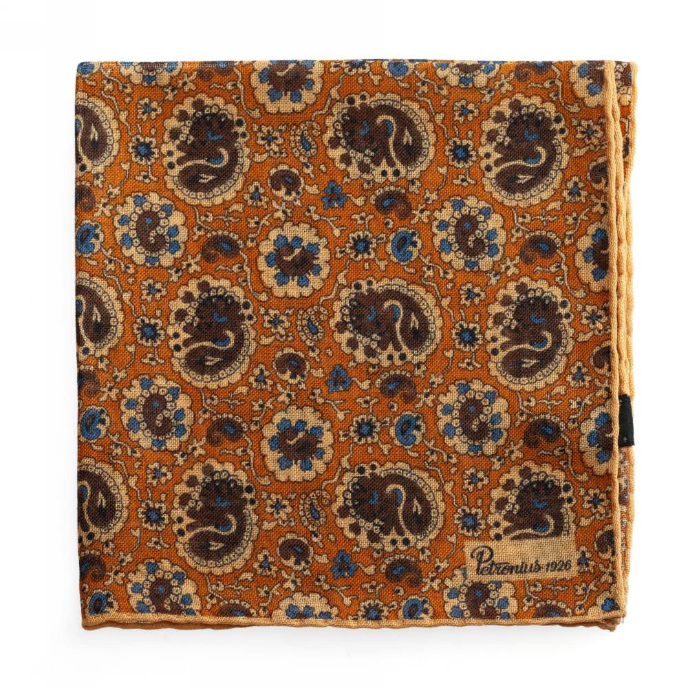 Элегантный карманный платок Petronius 1926 в оранжевой цветовой гамме с узором пейсли. Выполнен из лёгкой итальянской ткани, в состав которой входят шерсть и шёлк. Благодаря такому сочетанию материалов платок хорошо драпируется и держит нужную форму, добавляя изысканный акцент практически в любой образ. Ручная обработка по краю.