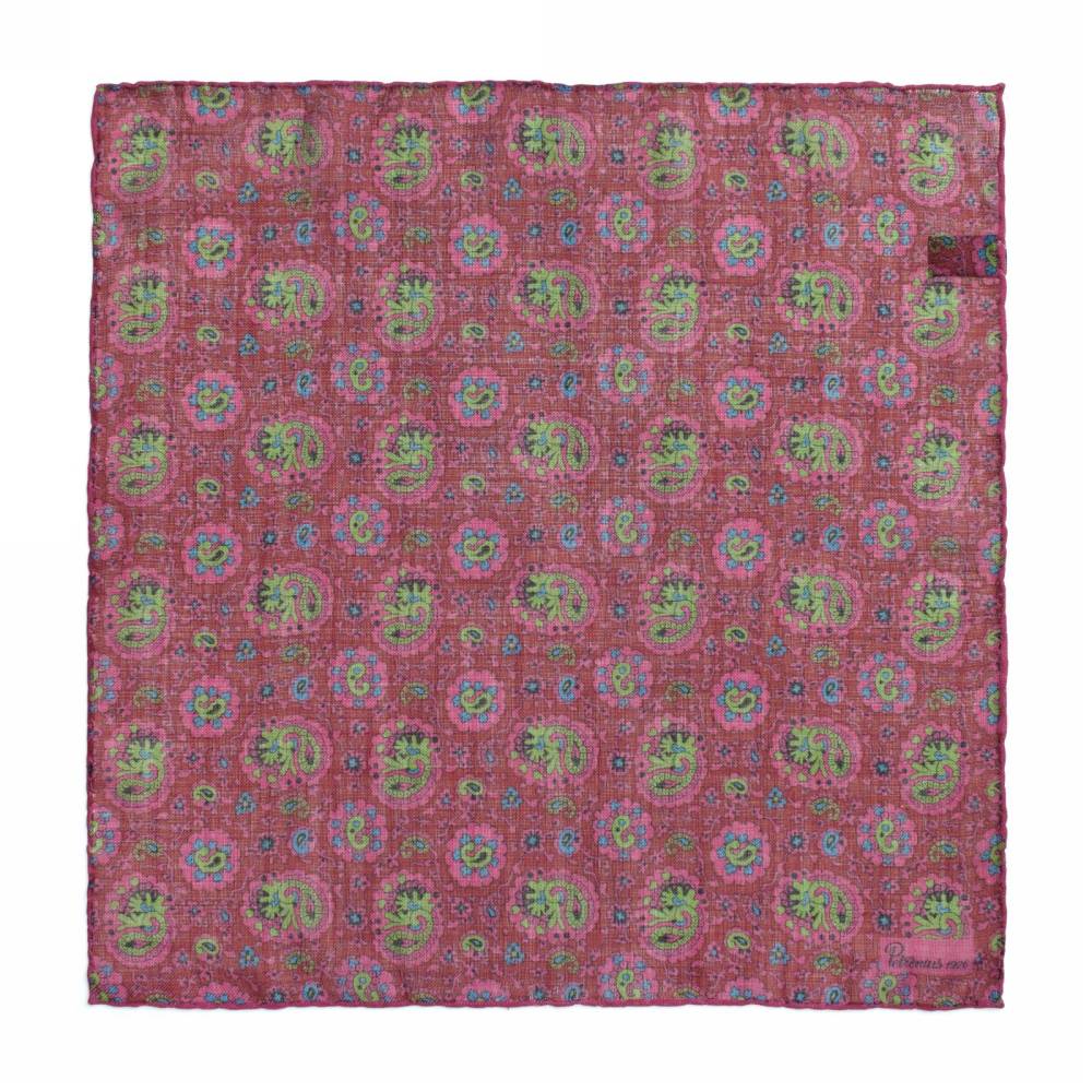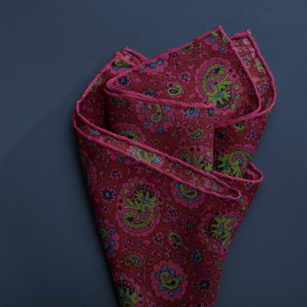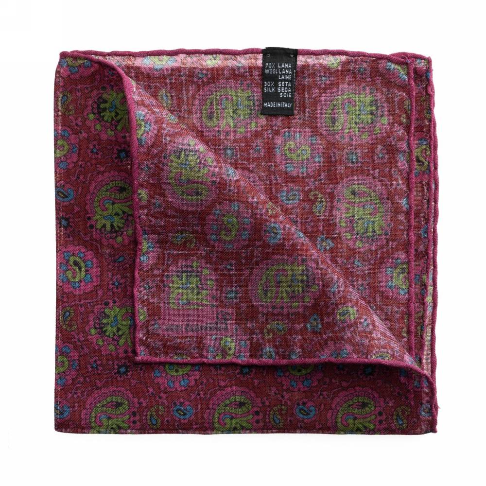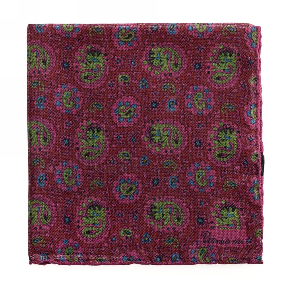 Элегантный карманный платок Petronius 1926 в тёмно-красной цветовой гамме с узором пейсли. Выполнен из лёгкой итальянской ткани, в состав которой входят шерсть и шёлк. Благодаря такому сочетанию материалов платок хорошо драпируется и держит нужную форму, добавляя изысканный акцент практически в любой образ. Ручная обработка по краю.