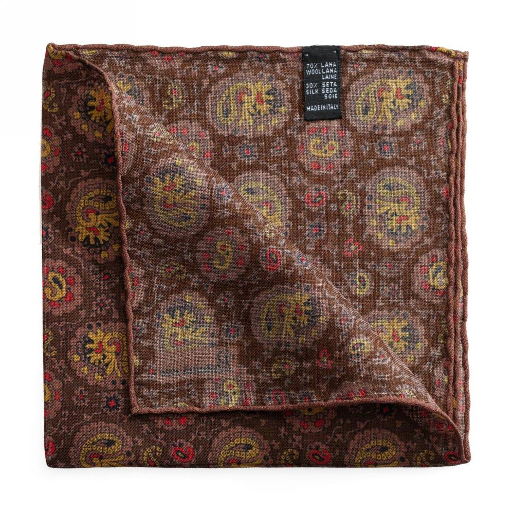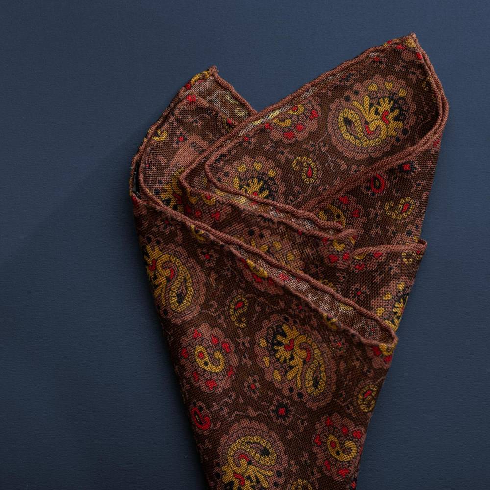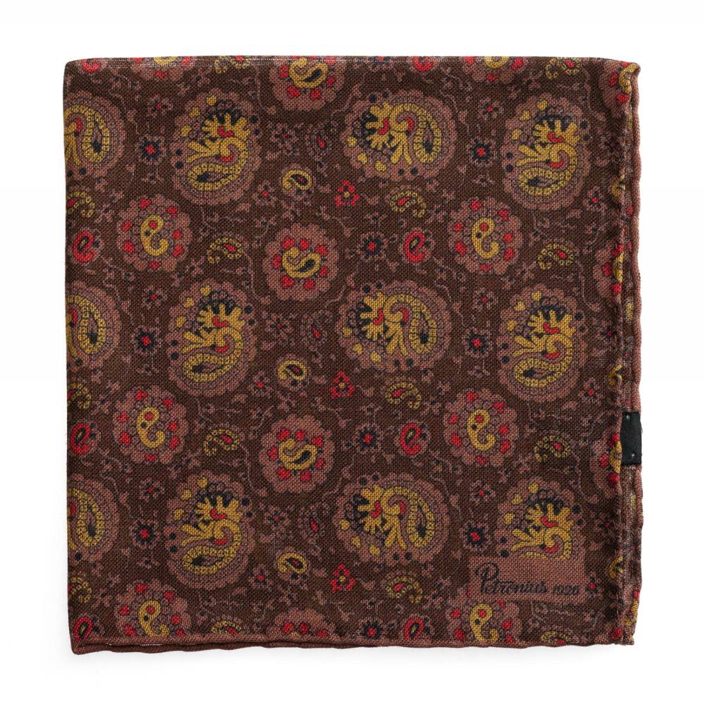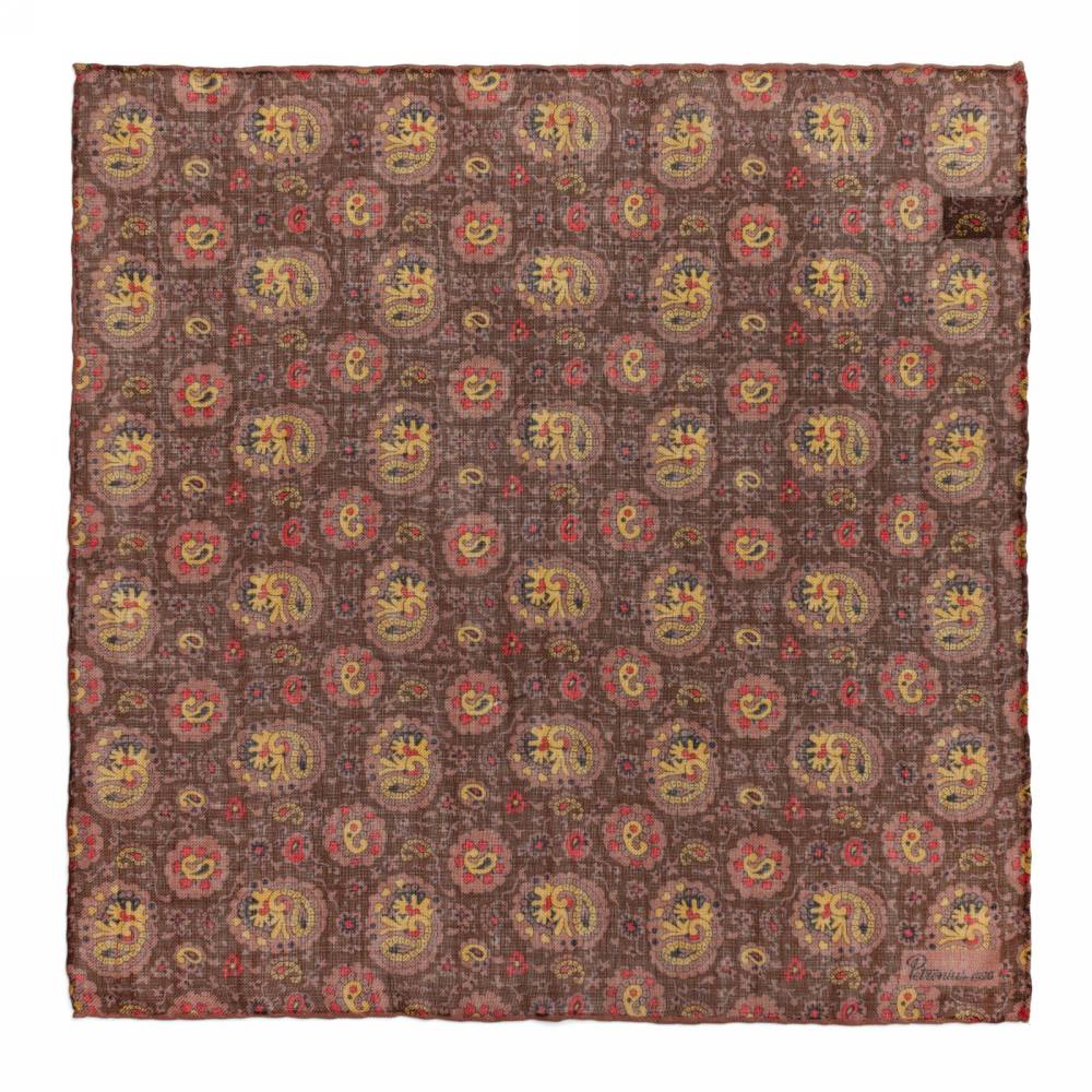 Элегантный карманный платок Petronius 1926 в коричневой цветовой гамме с узором пейсли. Выполнен из лёгкой итальянской ткани, в состав которой входят шерсть и шёлк. Благодаря такому сочетанию материалов платок хорошо драпируется и держит нужную форму, добавляя изысканный акцент практически в любой образ. Ручная обработка по краю.