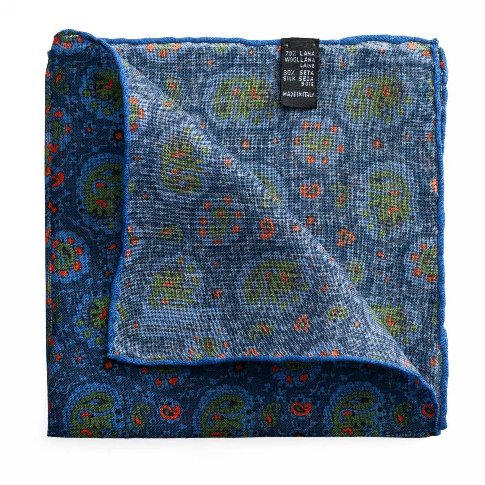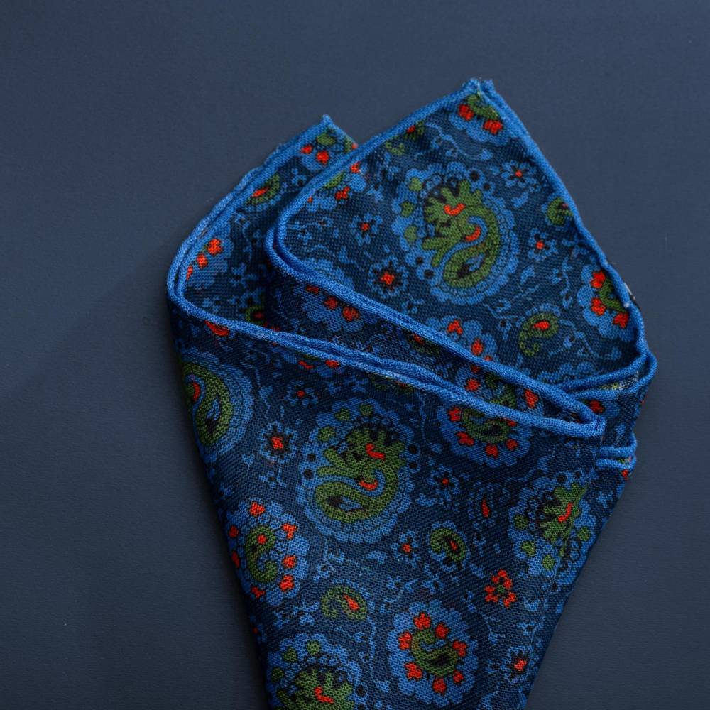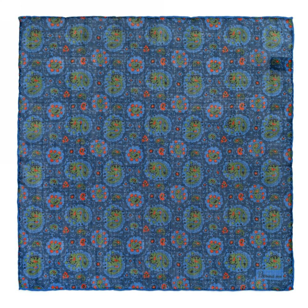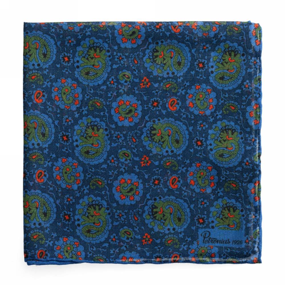 Элегантный карманный платок Petronius 1926 в тёмно-синей цветовой гамме с узором пейсли. Выполнен из лёгкой итальянской ткани, в состав которой входят шерсть и шёлк. Благодаря такому сочетанию материалов платок хорошо драпируется и держит нужную форму, добавляя изысканный акцент практически в любой образ. Ручная обработка по краю.