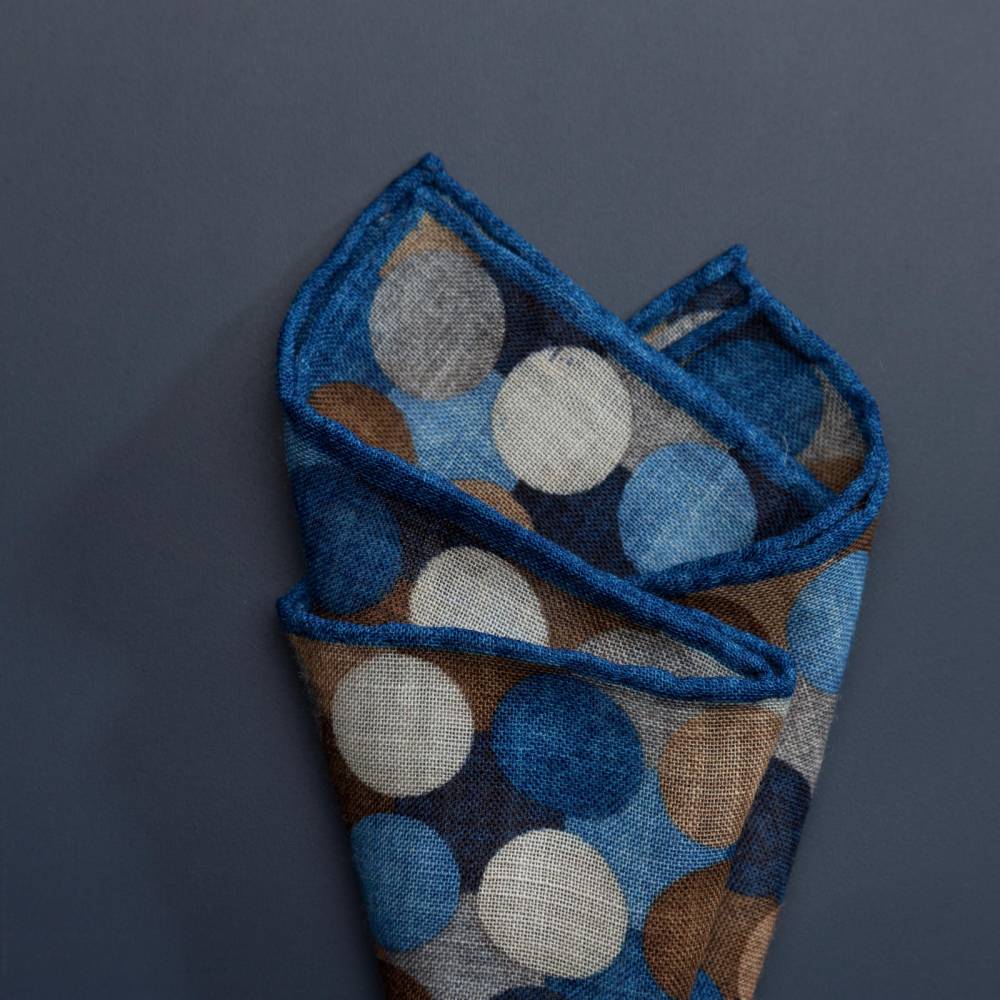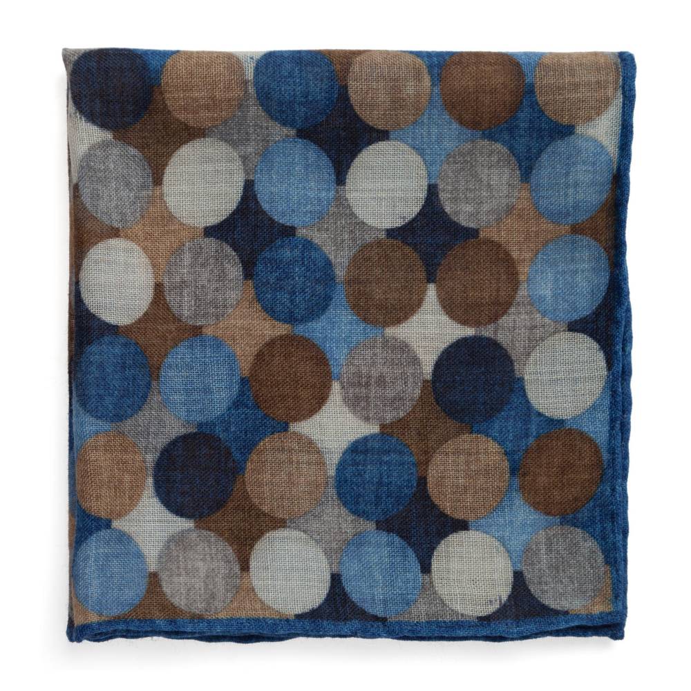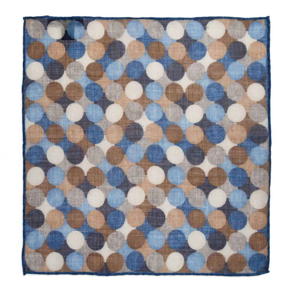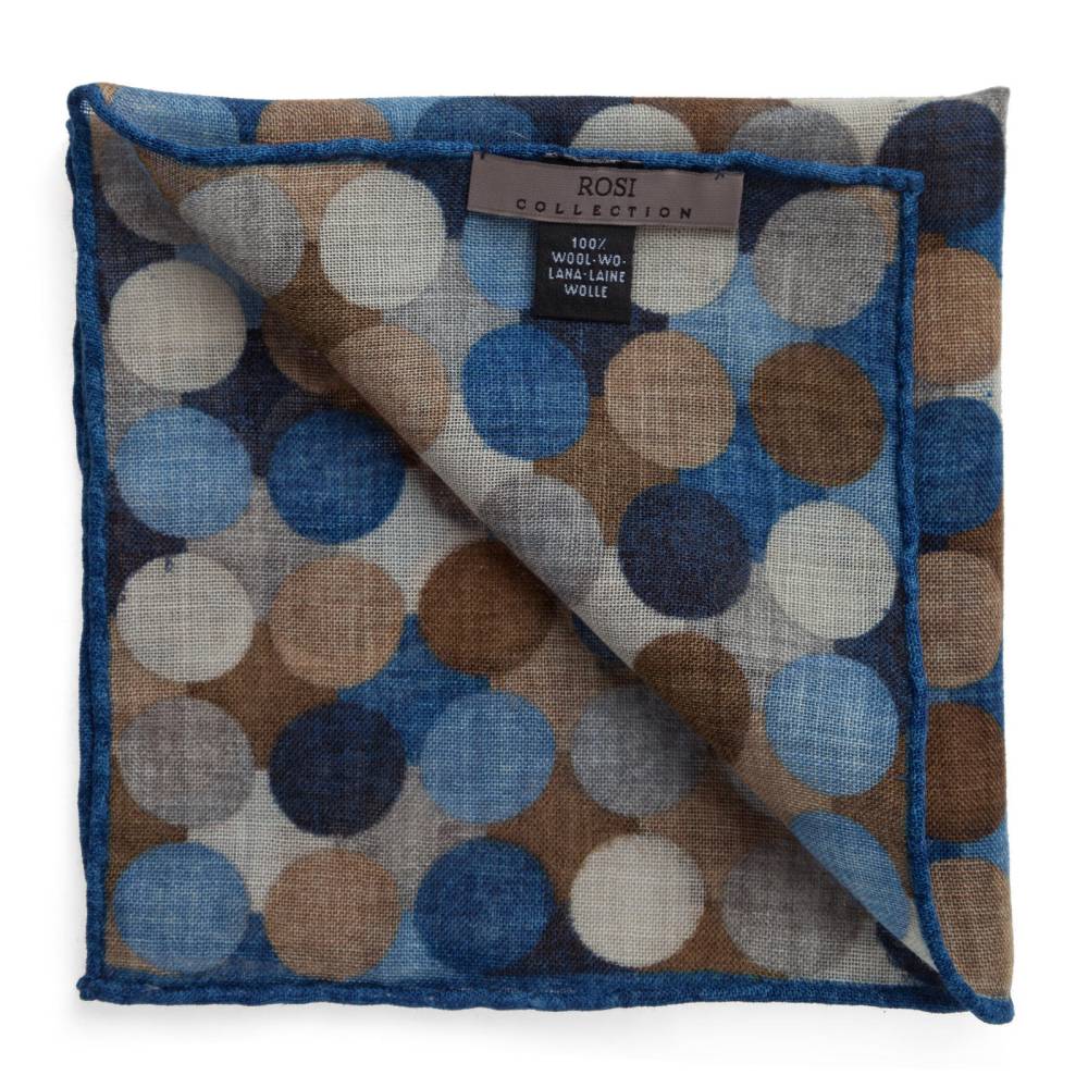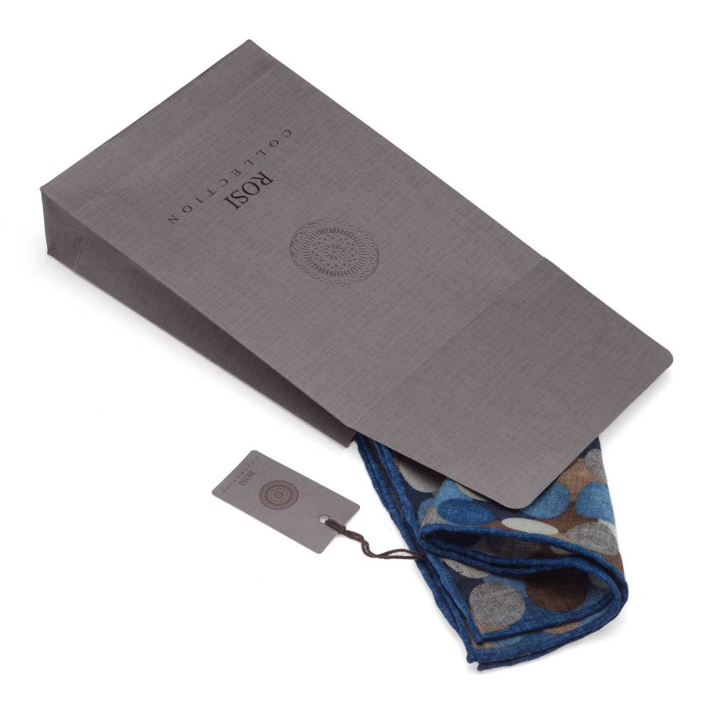 Элегантный карманный платок Rosi Collection с ярким запоминающимся геометрическим рисунком с преобладанием синих оттенков. Выполнен из тонкой летящей шерсти. Платок хорошо драпируется и держит нужную форму, добавляя изысканный акцент практически в любой образ. Ручная обработка по краю.