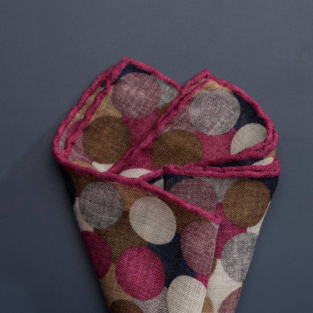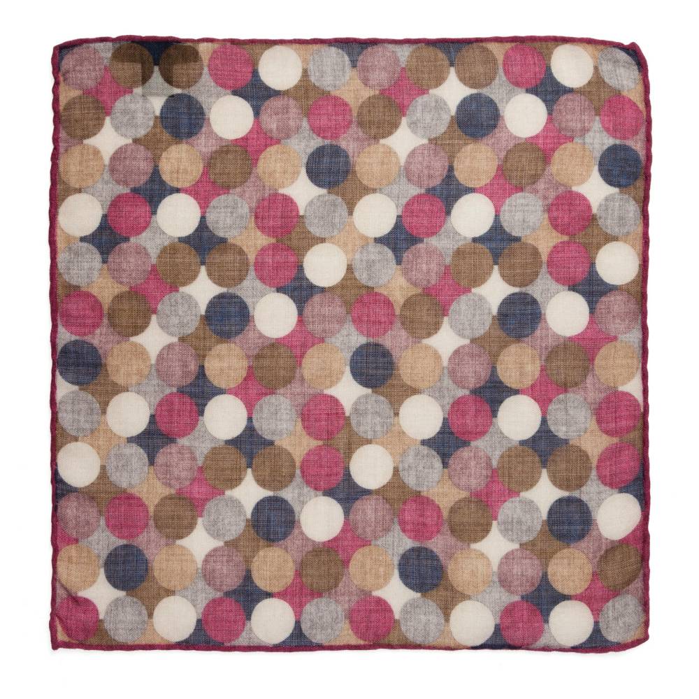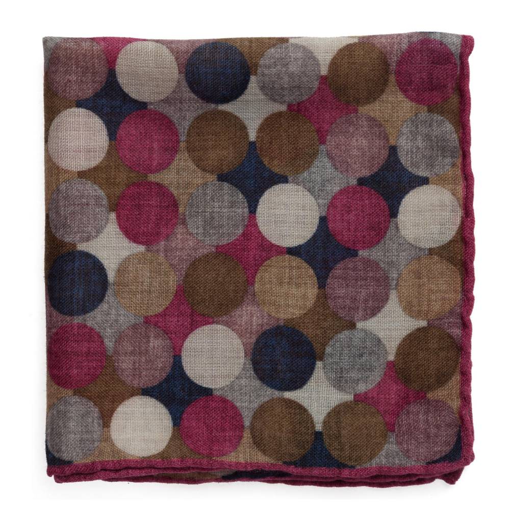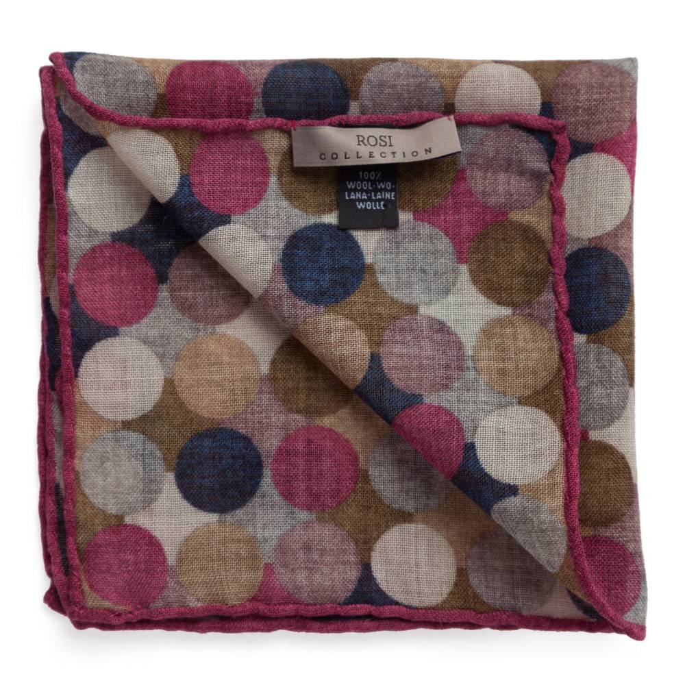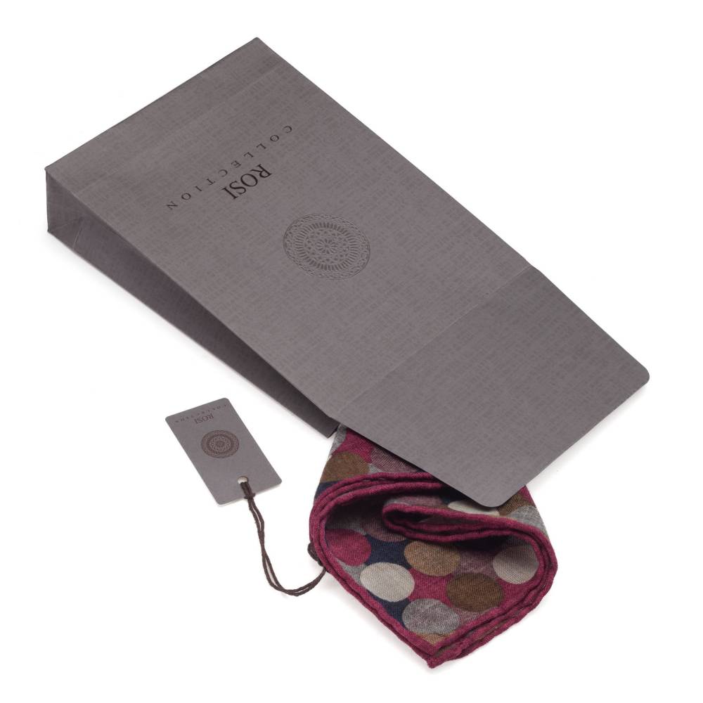 Элегантный карманный платок Rosi Collection с ярким запоминающимся геометрическим рисунком с преобладанием бордовых оттенков. Выполнен из тонкой летящей шерсти. Платок хорошо драпируется и держит нужную форму, добавляя изысканный акцент практически в любой образ. Ручная обработка по краю.