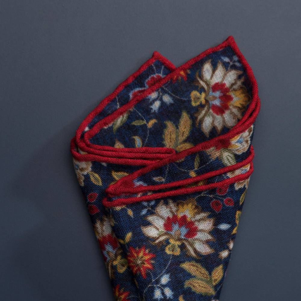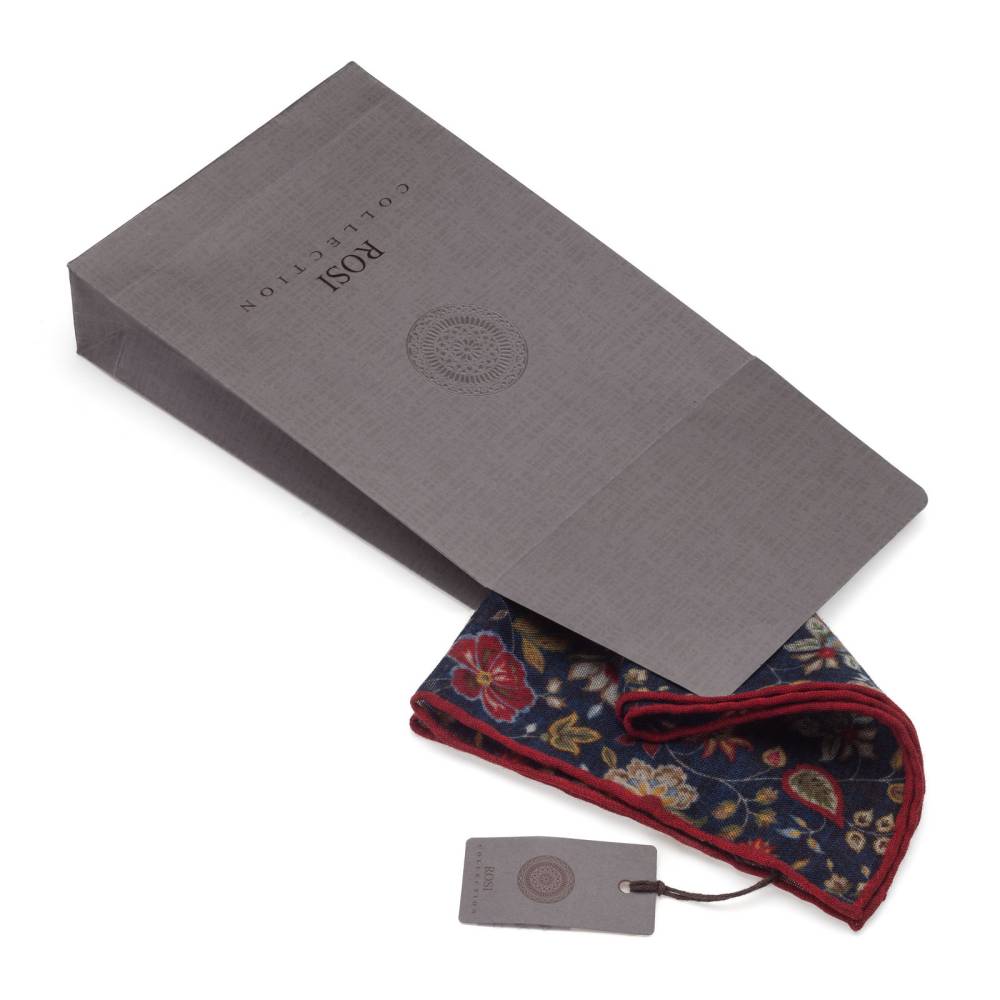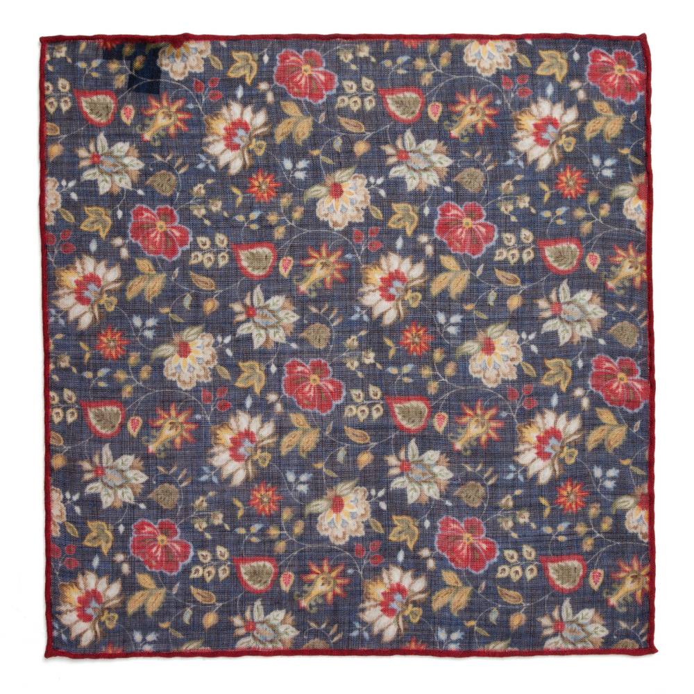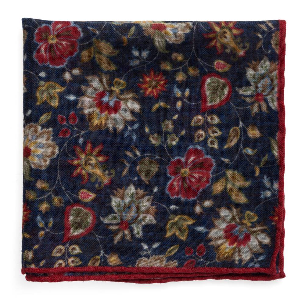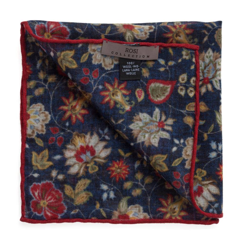 Элегантный карманный платок Rosi Collection с ярким запоминающимся флористическим рисунком на тёмно-синем фоне. Выполнен из тонкой летящей шерсти. Платок хорошо драпируется и держит нужную форму, добавляя изысканный акцент практически в любой образ. Ручная обработка по краю.