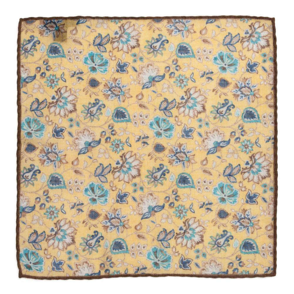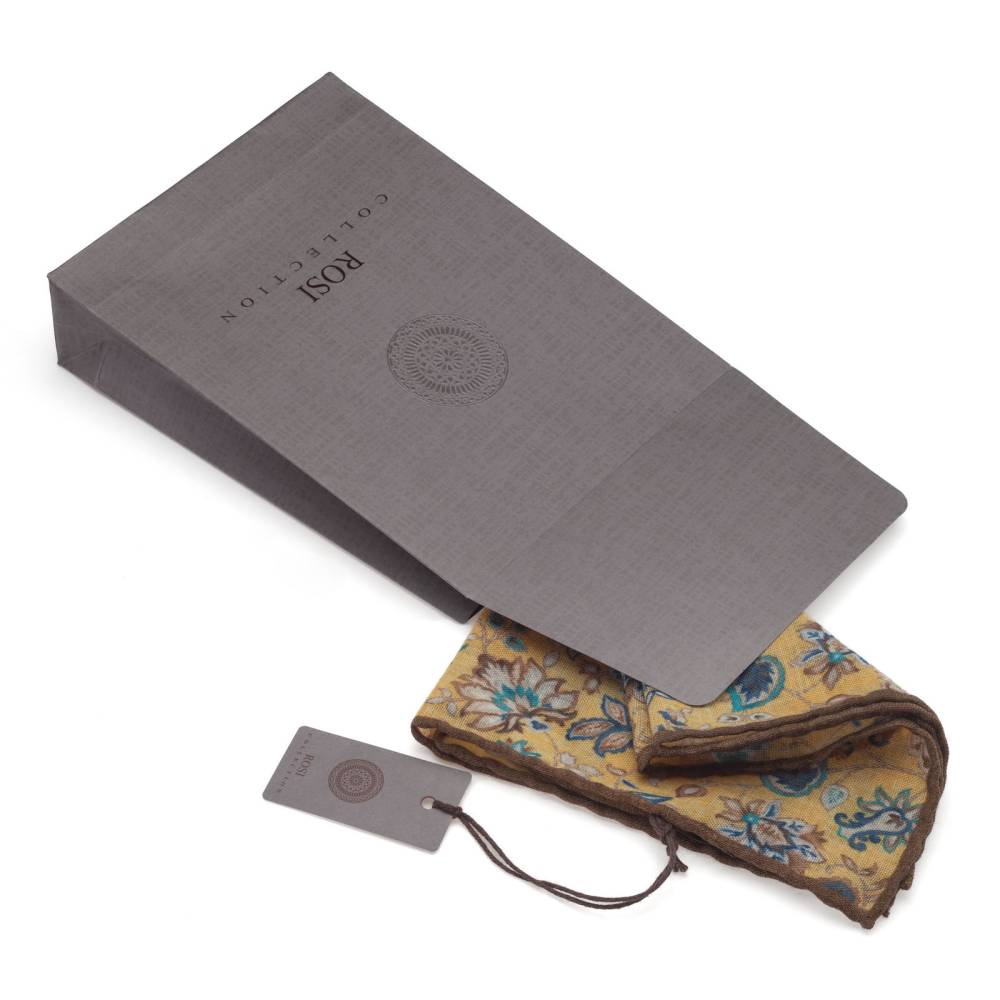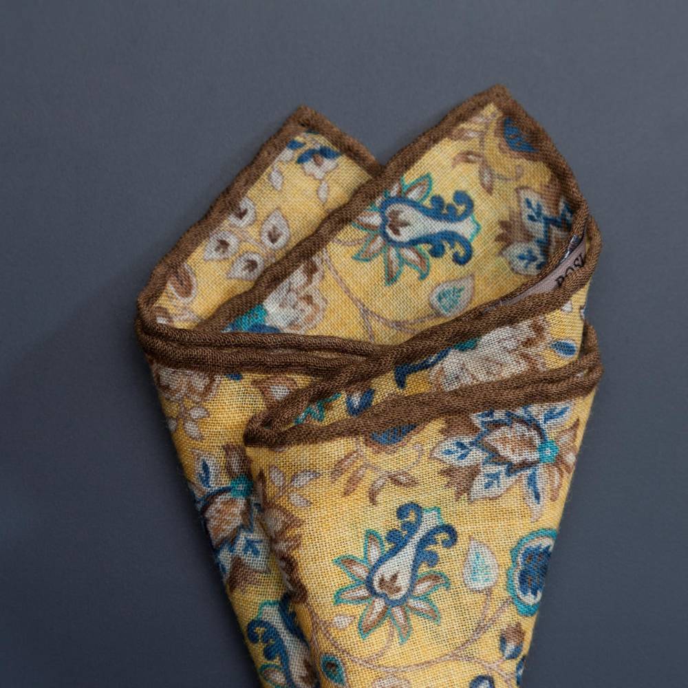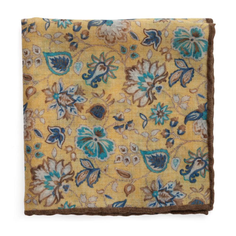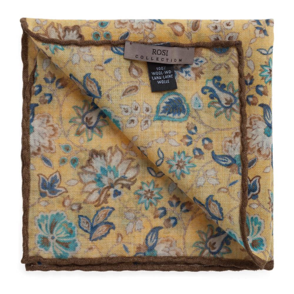 Элегантный карманный платок Rosi Collection с запоминающимся флористическим рисунком на ненавязчивом жёлтом фоне. Выполнен из тонкой летящей шерсти. Платок хорошо драпируется и держит нужную форму, добавляя изысканный акцент практически в любой образ. Ручная обработка по краю.