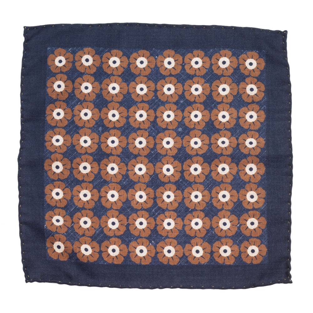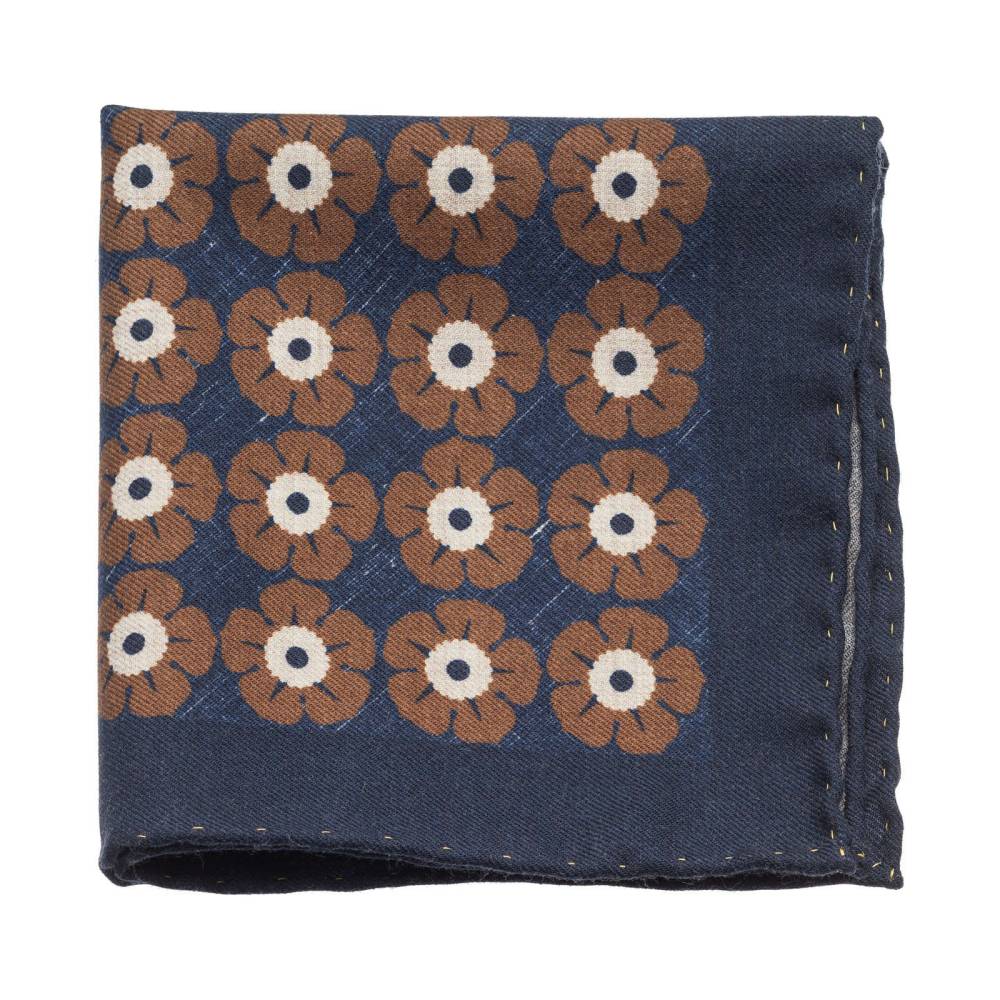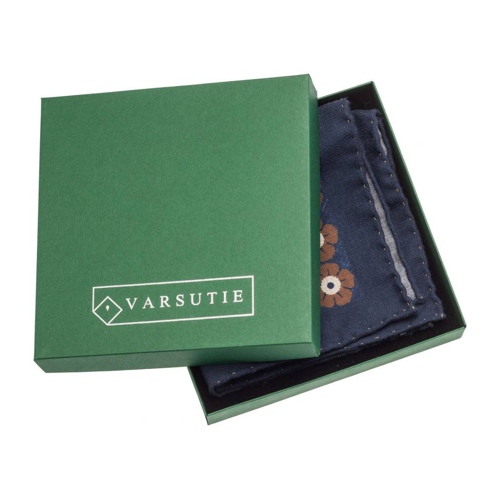 Классический карманный платок из лимитированной коллекции польского бренда Varsutie. Полностью изготовлен вручную из высококачественной шерсти тёмно-синего цвета с цветочным узором. Особенностью модели являются вручную подшитые края (англ. Hand Rolled Edges) с контрастной строчкой. К платку прилагается фирменная подарочная коробка.