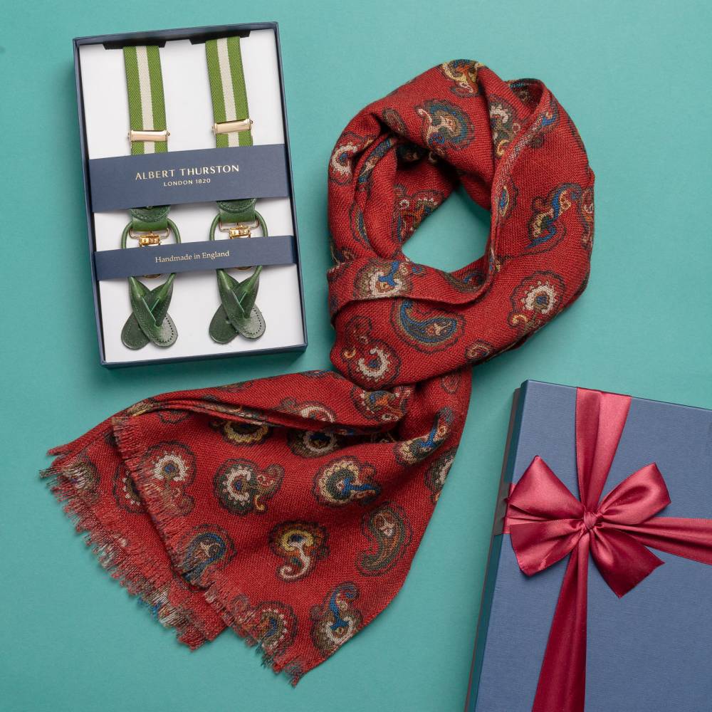 Прекрасный комплект для ценителей классических предметов ручной работы. Яркий шарф красного цвета из шерсти удачно дополняют неширокие подтяжки с петлями из натуральной кожи. Праздники, к сожалению, проходят, но яркие впечатления всё равно навсегда остаются в памяти. В суете деловых будней этот изысканный комплект будет напоминать о приятно проведённом времени в кругу близких людей.