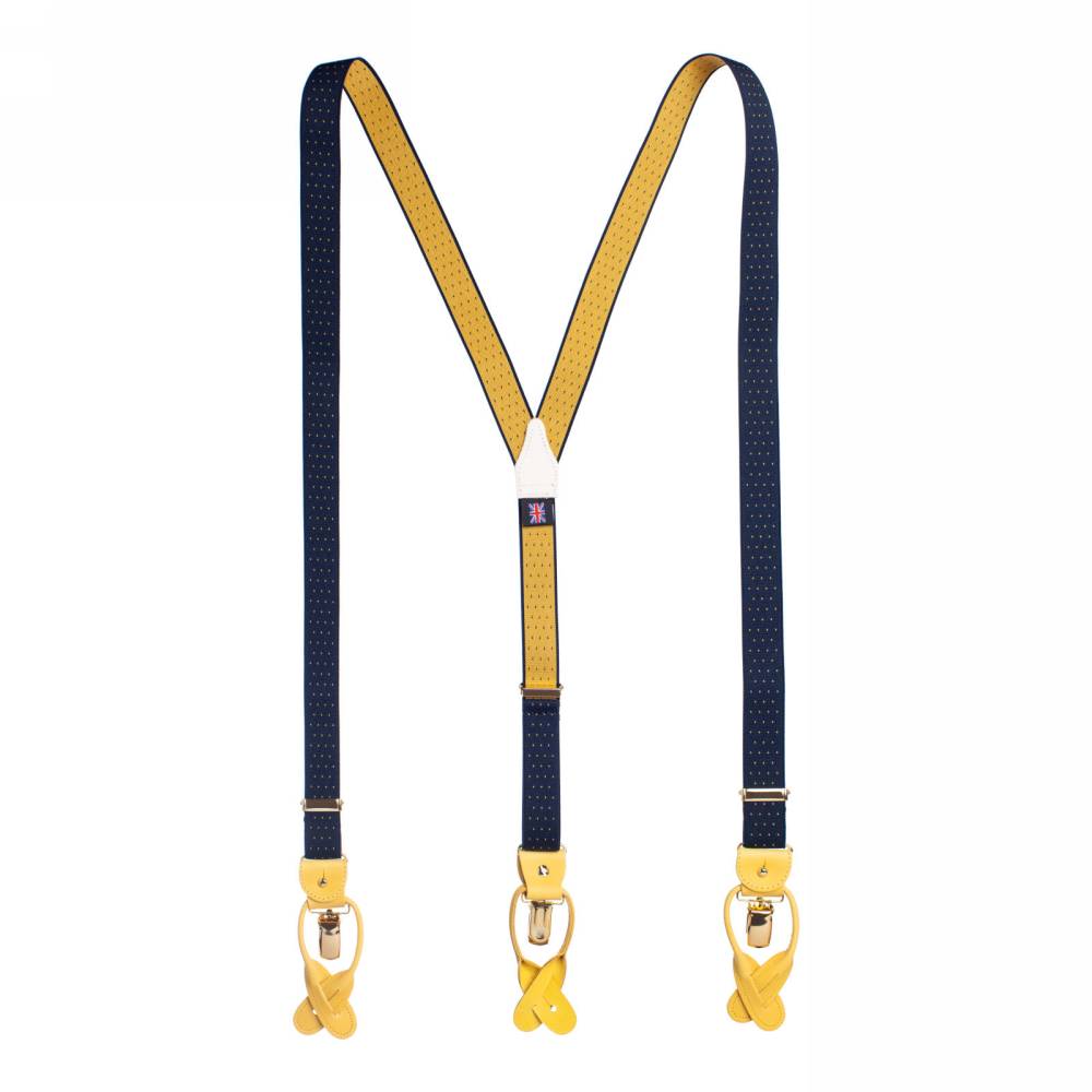 Яркие неширокие Y-образные подтяжки английского бренда Albert Thurston из эластичного текстиля в тёмно-синей и жёлтой цветовой гамме в горох. Петли и спинка – из прочной натуральной кожи. Подтяжки можно крепить при помощи петель, если брюки имеют пуговицы, либо при помощи металлических зажимов. В комплект входит набор из 6 пуговиц. Металлические элементы золотистого цвета. Такие узкие подтяжки будут превосходно сочетаться с классическими галстуками шириной 8 или 8,5 см и несильно отвлекать от него внимание. Также они могут стать подходящим выбором для мужчины худощавого телосложения.