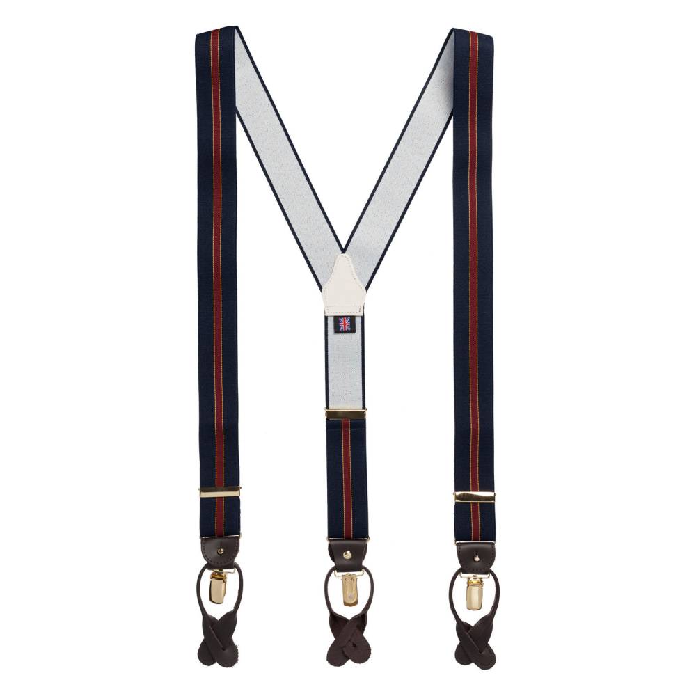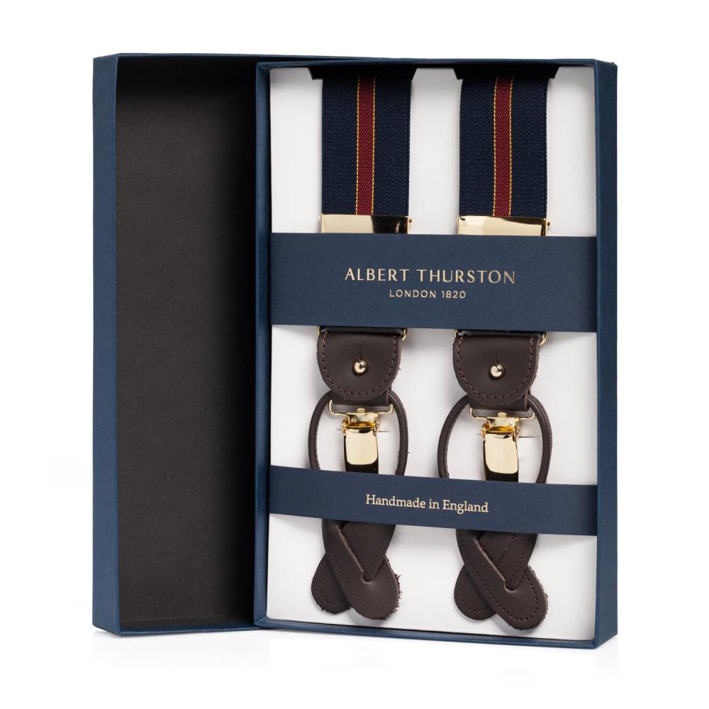 Классические Y-образные подтяжки легендарного английского бренда Albert Thurston. Лента выполнена из хлопка в сочетании с эластаном, а петли и спинка – из прочной натуральной кожи. Подтяжки можно крепить при помощи петель, если брюки имеют пуговицы, либо при помощи металлических зажимов. В комплект входит набор из 6 пуговиц.