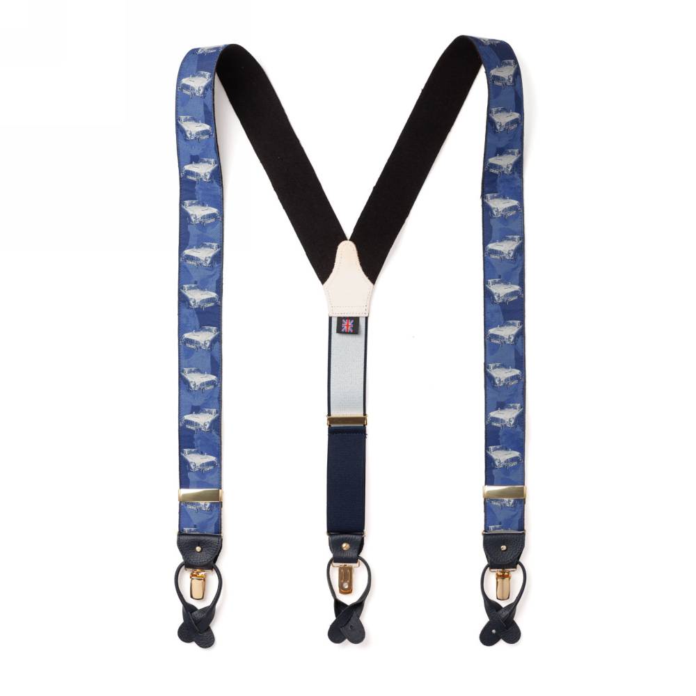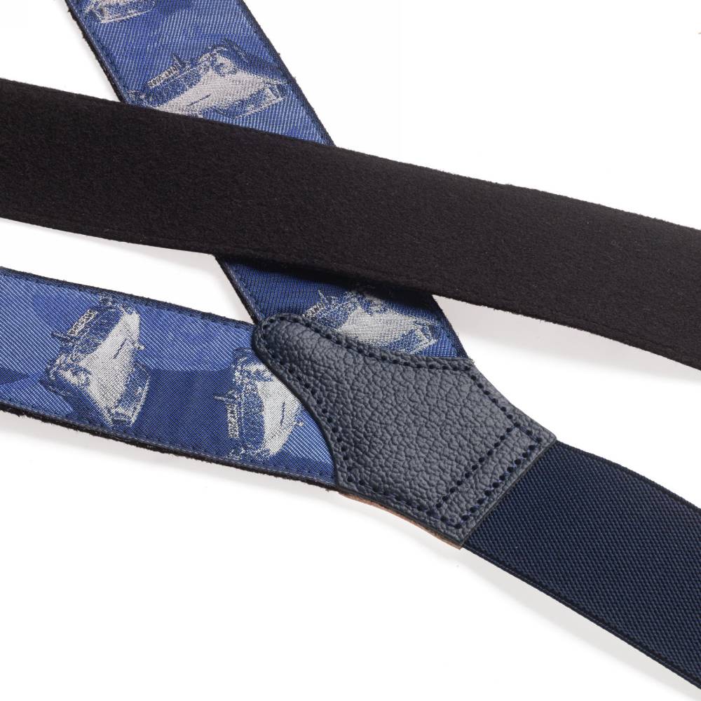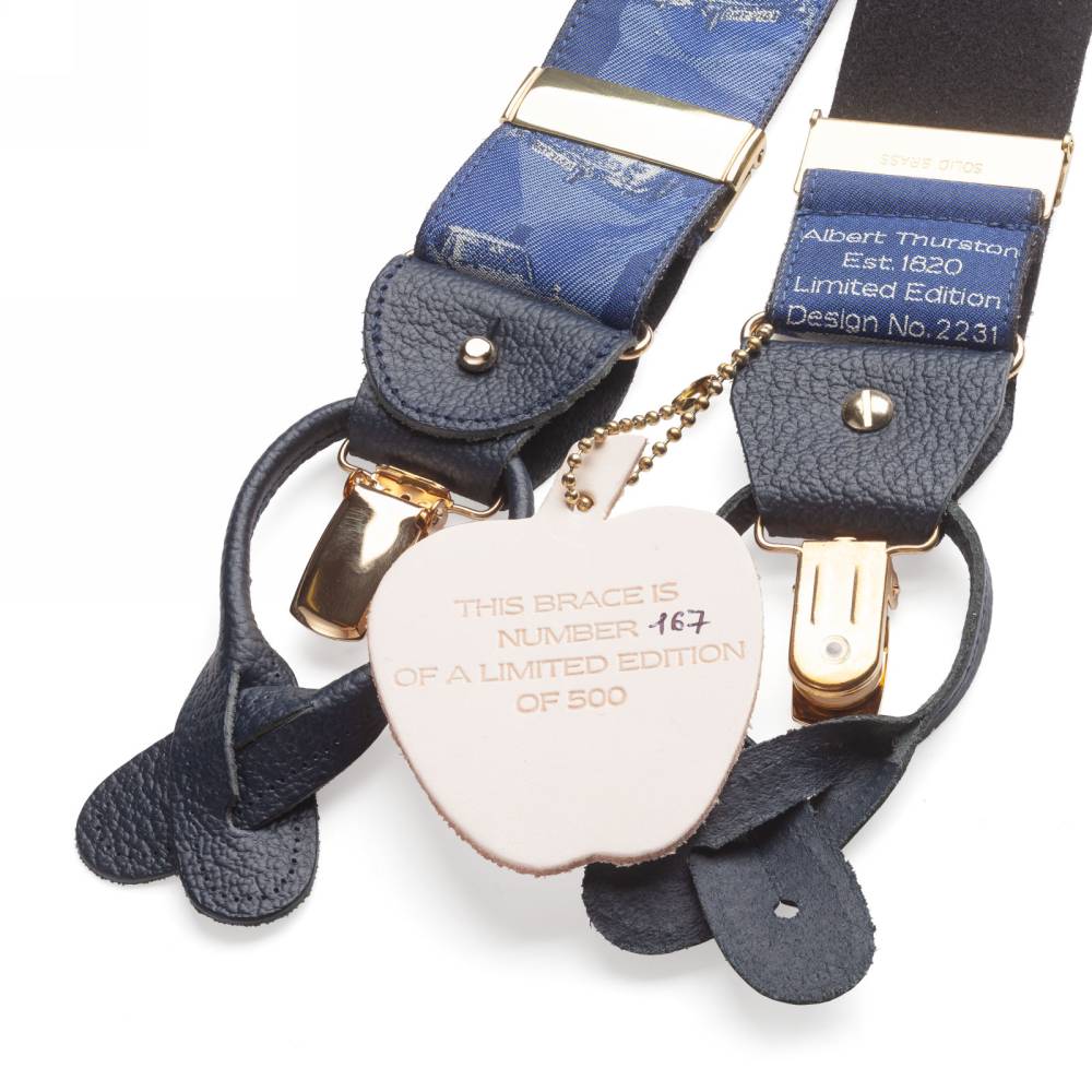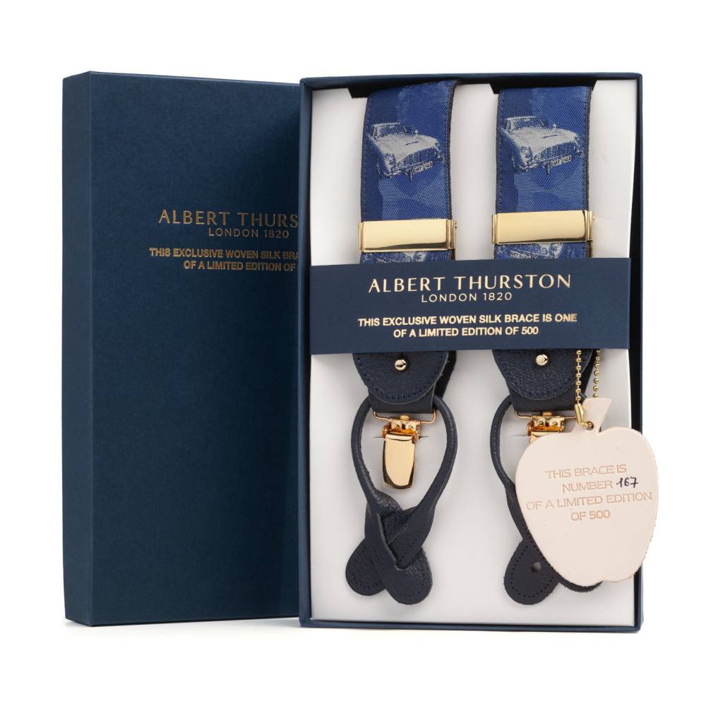 Лимитированные шелковые подтяжки ручной работы легендарного бренда Albert Thurston. Изготовлены вручную в традиционной Y-образной конструкции. Серия лимитирована: выпущено всего 500 экземпляров, каждый из которых имеет индивидуальный номер. Шёлковая жаккардовая лента, сотканная в графстве Девоншир, украшена узором в виде автомобиля Джеймса Бонда – Aston Martin DB5, в синих и серых тонах. Обратная сторона отделана чистой шерстью Мелтон из Йоркшира для комфортного ношения. Подтяжки можно крепить при помощи кожанных петель, если брюки имеют пуговицы, либо при помощи металлических зажимов. В комплекте набор из 6 пуговиц.