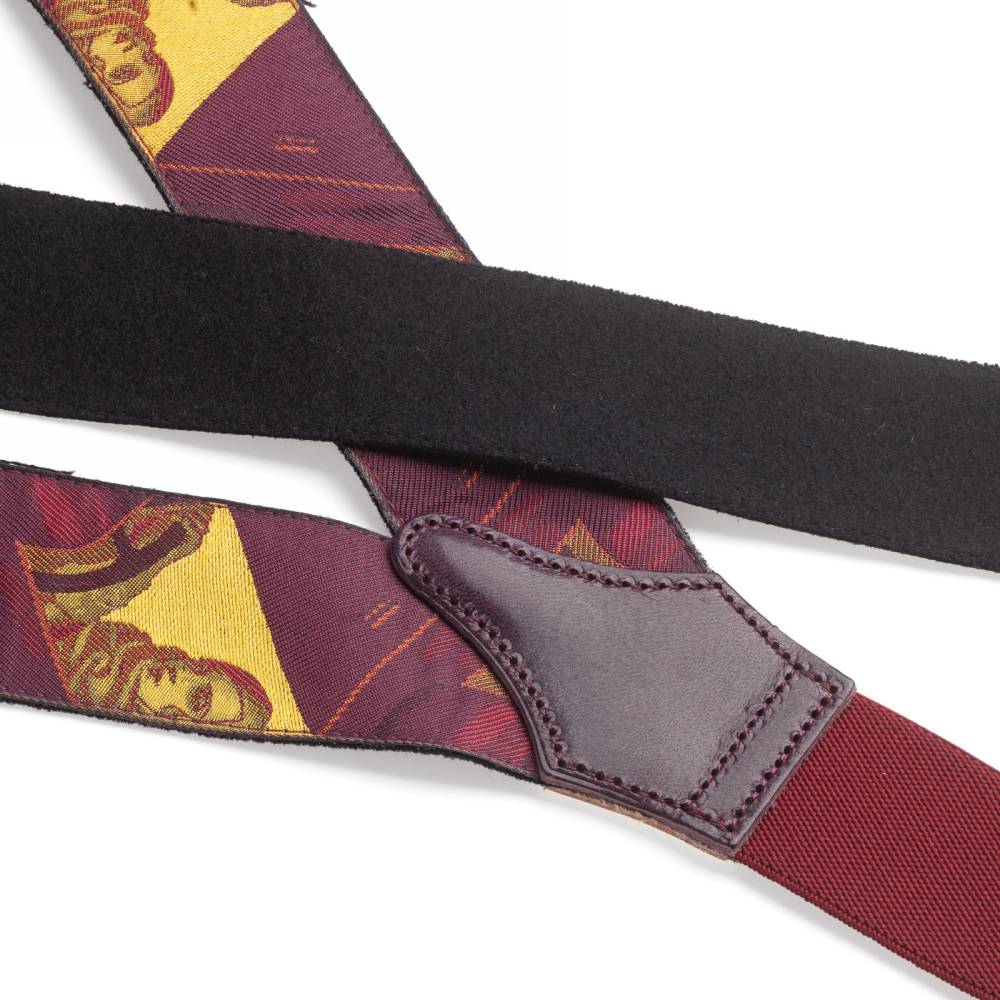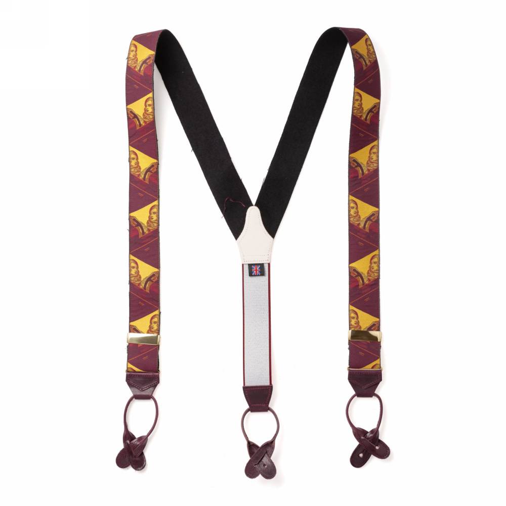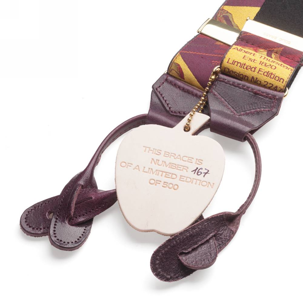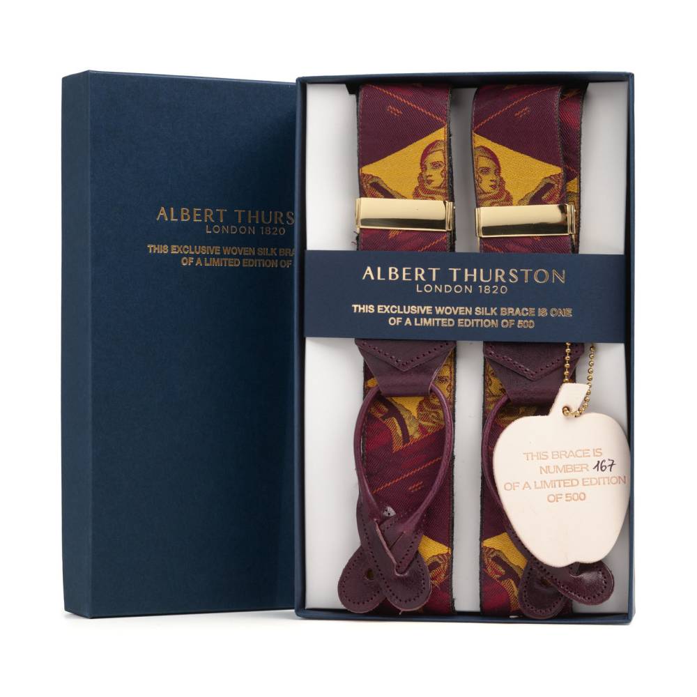 Лимитированные шелковые подтяжки ручной работы легендарного бренда Albert Thurston. Изготовлены вручную в традиционной Y-образной конструкции. Серия лимитирована: выпущено всего 500 экземпляров, каждый из которых имеет индивидуальный номер. Шёлковая жаккардовая лента, сотканная в графстве Девоншир, украшена узором в виде девушки за рулём, в желтых и бордовых тонах, напоминающими сюжет известной картины художницы периода ар-деко Тамары Лемпицки. Обратная сторона отделана чистой шерстью Мелтон из Йоркшира для комфортного ношения. Подтяжки крепятся при помощи кожаных петель к пуговицам на брюках. В качестве альтернативы можно использовать металлические пуговицы.