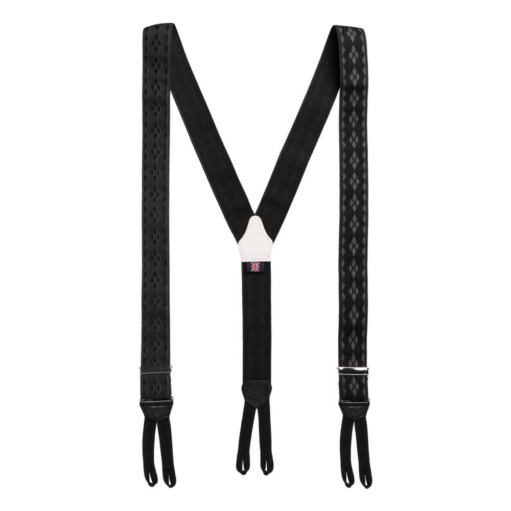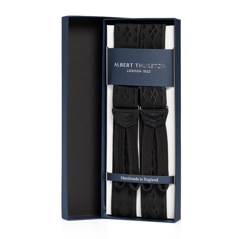 Классические Y-образные подтяжки легендарного английского бренда Albert Thurston для максимально формальных мероприятий с дресс-кодом White Tie или Black Tie. Лента выполнена из хлопка в сочетании с эластаном, а вставки и спинка из высококачественной телячьей кожи. Лицевая сторона ленты украшены фактурным узором из ромбов, напоминающим классический рисунок «аргайл» (англ. «argyle»). Подтяжки крепятся при помощи традиционных тканевых петель.