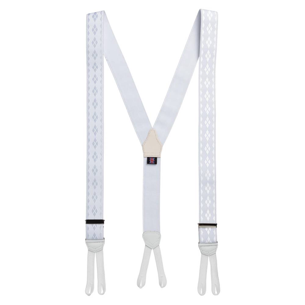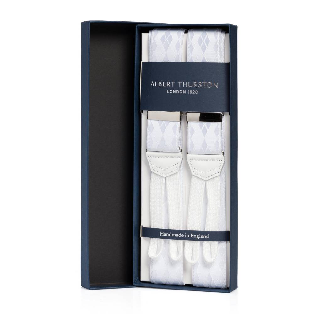 Классические Y-образные подтяжки легендарного английского бренда Albert Thurston для максимально формальных мероприятий с дресс-кодом White Tie или Black Tie. Лента выполнена из хлопка в сочетании с эластаном, а вставки и спинка из высококачественной телячьей кожи. Лицевая сторона ленты украшены фактурным узором из ромбов, напоминающим классический рисунок «аргайл» (англ. «argyle»). Подтяжки крепятся при помощи традиционных тканевых петель.