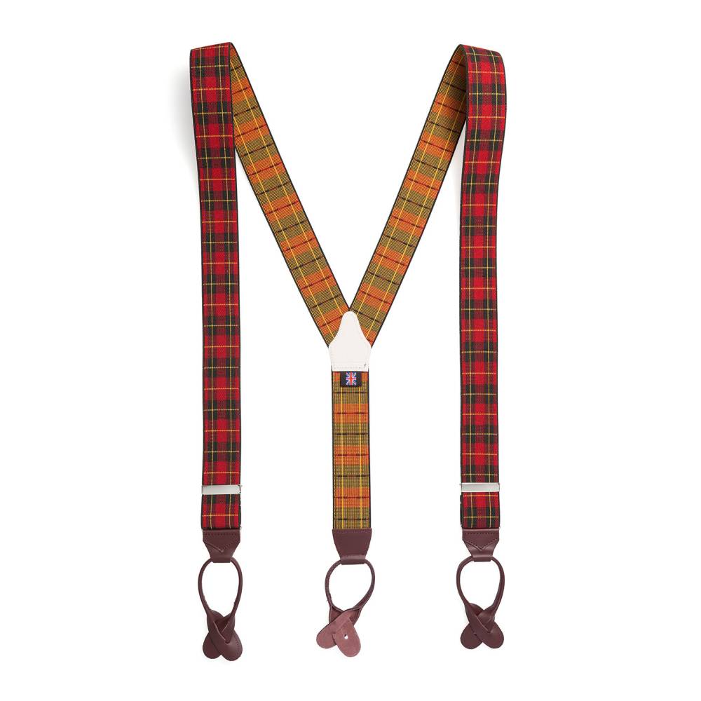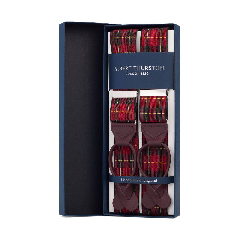 Классические Y-образные подтяжки легендарного английского бренда Albert Thurston в классическую шотландскую клетку «тартан». Лента выполнена из хлопка в сочетании с эластаном, а петли и спинка – из прочной натуральной кожи. Подтяжки крепятся к брюкам при помощи петель. В комплект входит набор из 6 пуговиц.