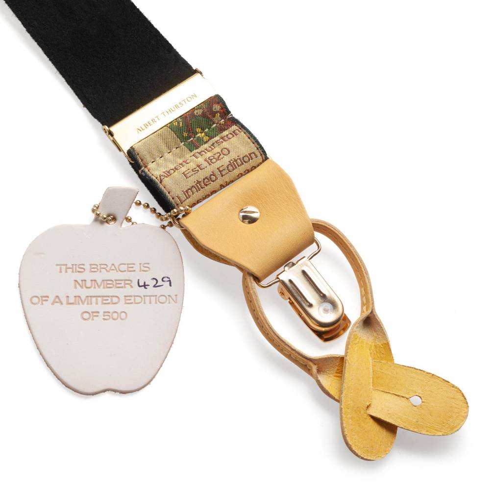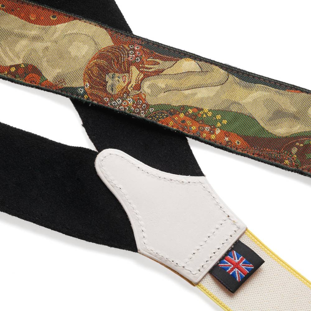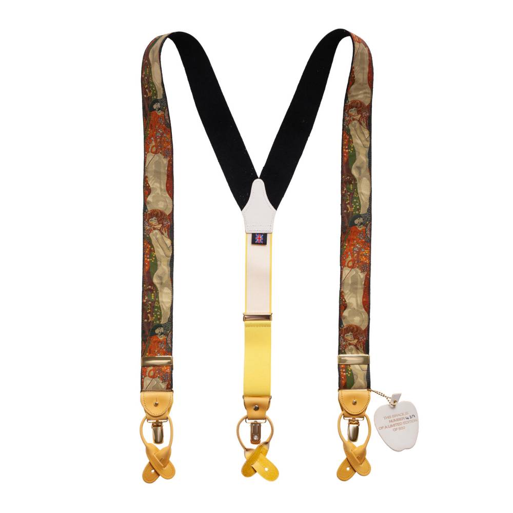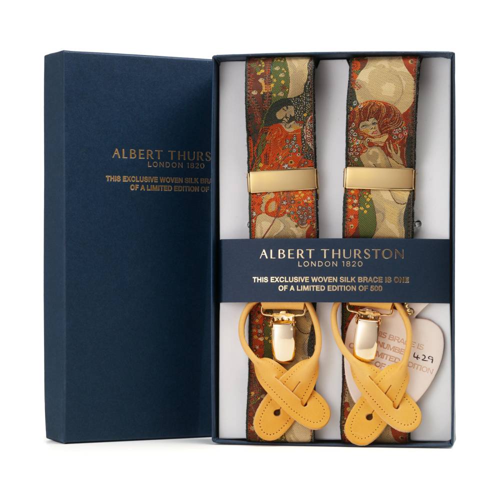 Классические Y-образные подтяжки английского бренда Albert Thurston из ограниченного выпуска. Лента выполнена из шёлка бежевых и охристых тонов, на котором выткан сюжет знаменитой картин "Водяные змеи II" австрийского художника Густава Климта. Петли и спинка – из прочной натуральной кожи. Подтяжки можно крепить при помощи петель, если брюки имеют пуговицы, либо при помощи металлических зажимов. В комплект входит набор из 6 пуговиц. Шёлковые ленты с ткаными сюжетами были выпущены в ограниченном количестве. Подтяжек с каждым узором было изготовлено всего по 500 штук, и каждый экземпляр имеет индивидуальный номер.