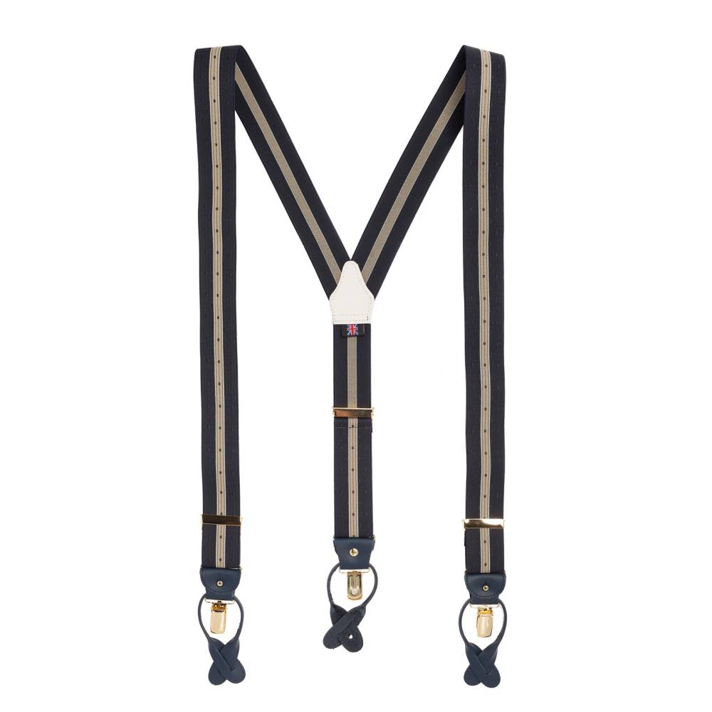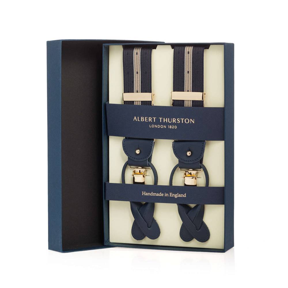 Классические Y-образные подтяжки легендарного английского бренда Albert Thurston. Лента выполнена из хлопка в сочетании с эластаном, а петли и спинка – из прочной натуральной кожи. Подтяжки можно крепить при помощи петель, если брюки имеют пуговицы, либо при помощи металлических зажимов. В комплект входит набор из 6 пуговиц.