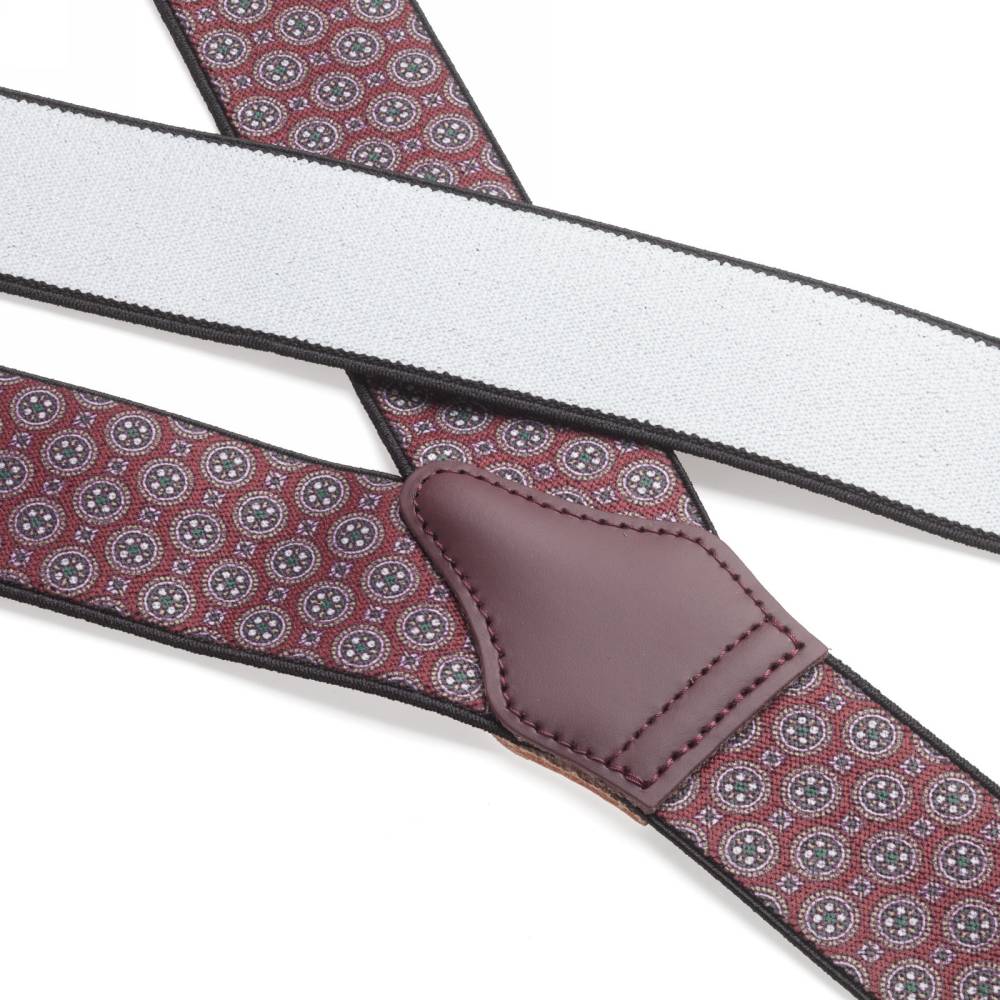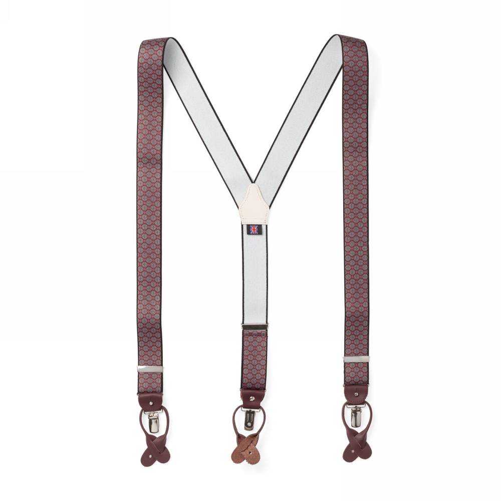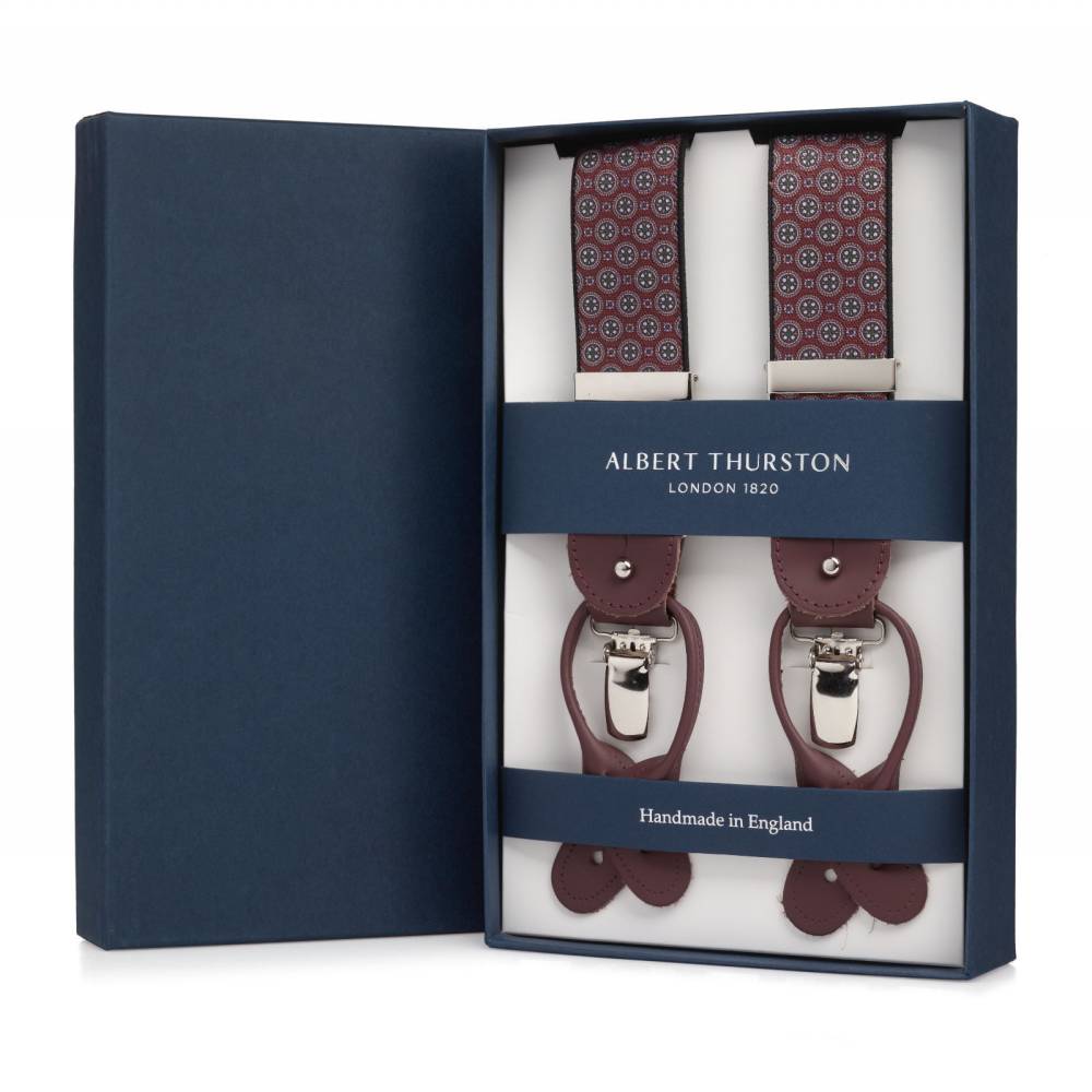 Классические Y-образные подтяжки легендарного английского бренда Albert Thurston. Лента выполнена из хлопка в сочетании с эластаном, а петли и спинка – из прочной натуральной кожи. Подтяжки можно крепить при помощи петель, если брюки имеют пуговицы, либо при помощи металлических зажимов. В комплект входит набор из 6 пуговиц.