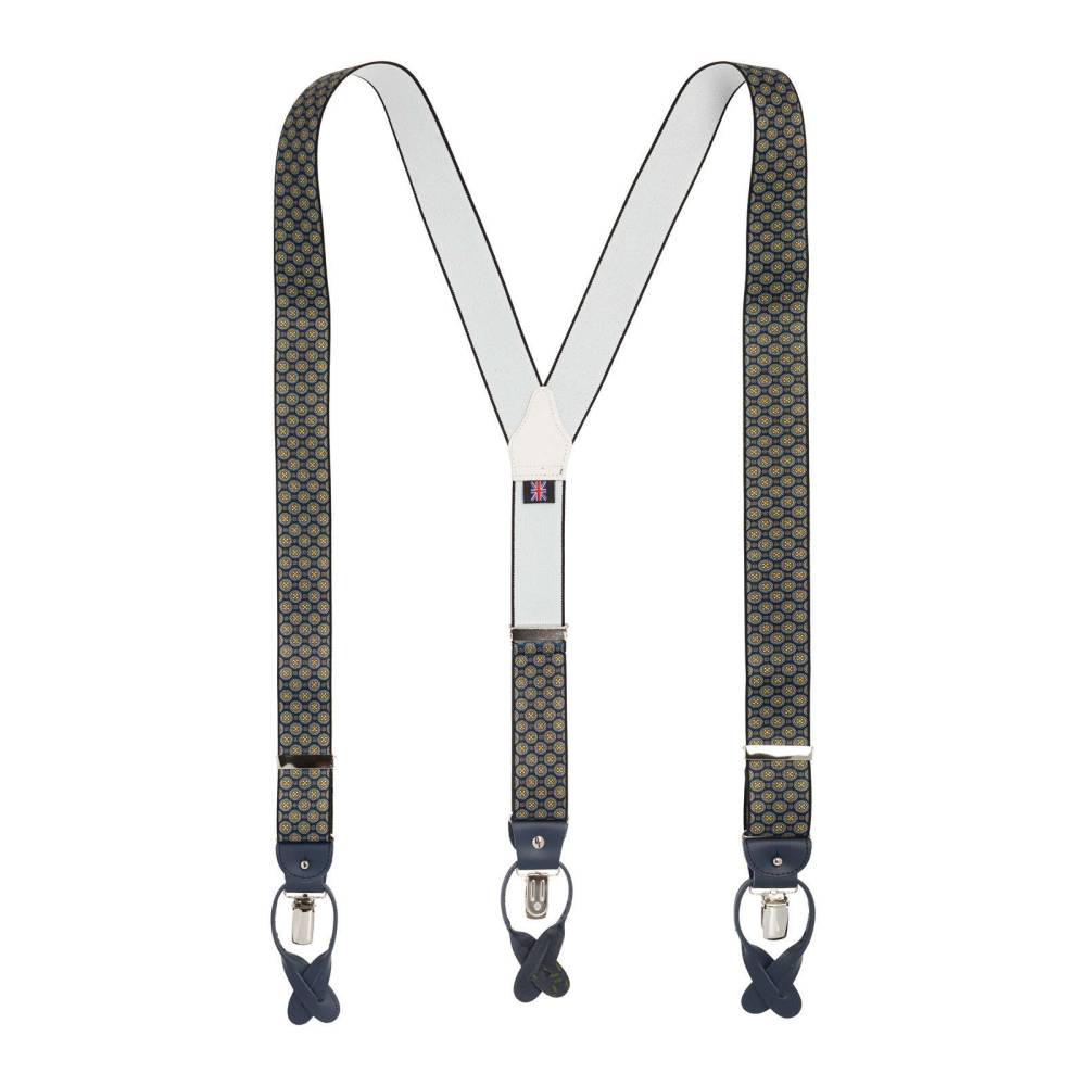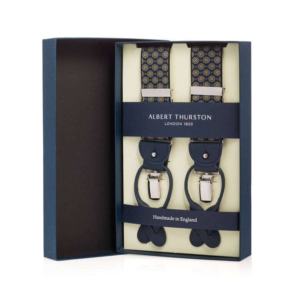 Классические Y-образные подтяжки легендарного английского бренда Albert Thurston. Лента выполнена из хлопка в сочетании с эластаном, а петли и спинка – из прочной натуральной кожи. Подтяжки можно крепить при помощи петель, если брюки имеют пуговицы, либо при помощи металлических зажимов. В комплект входит набор из 6 пуговиц.